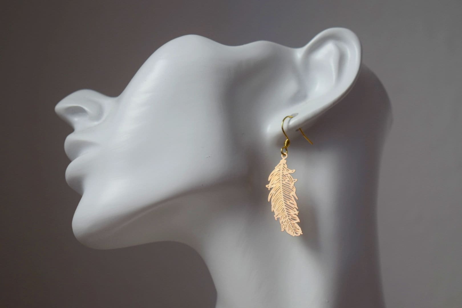 Feather gold ears for women, 18k gold plated stainless steel ear hooks, Boho filigree gold ears, Feather jewelry, Gift for her