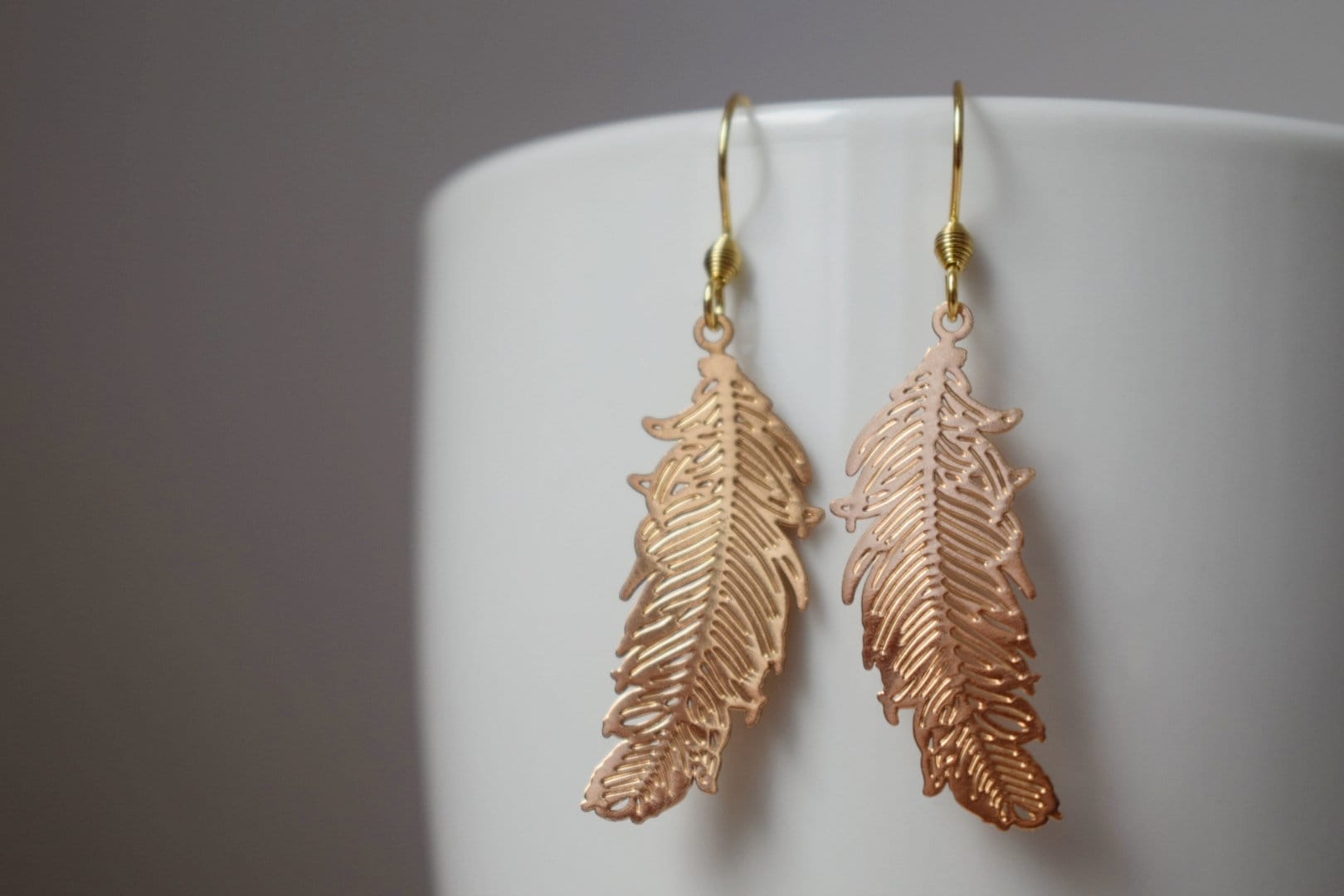 Feather gold earrings for women, 18k gold plated stainless steel ear hooks, Boho filigree gold earrings, Feather jewelry, Gift for her