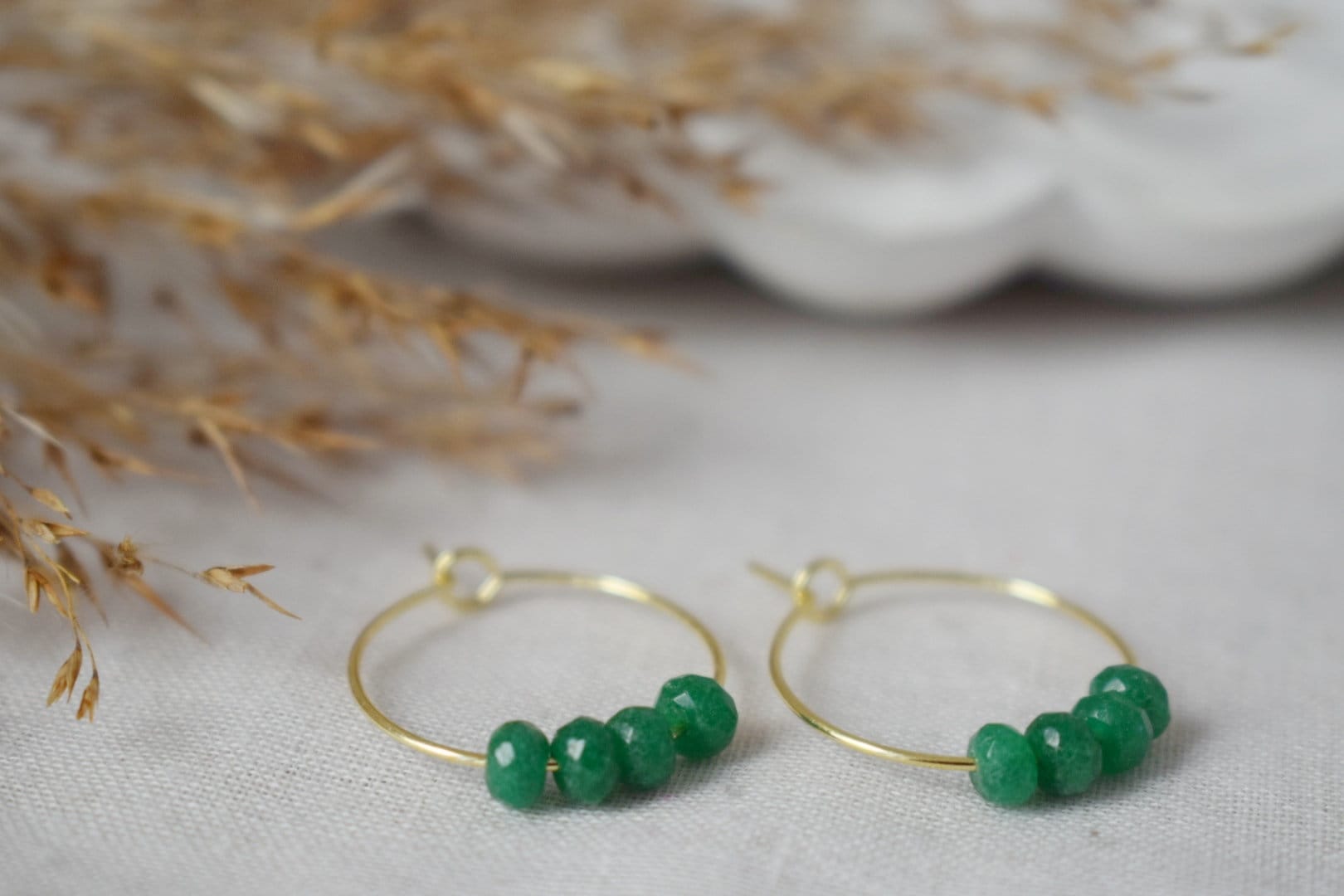 Green jade hoop earrings, Gemstone bead creole, 18k gold plated stainless steel, Emerald green, Minimalist, Boho handmade jewelry gift