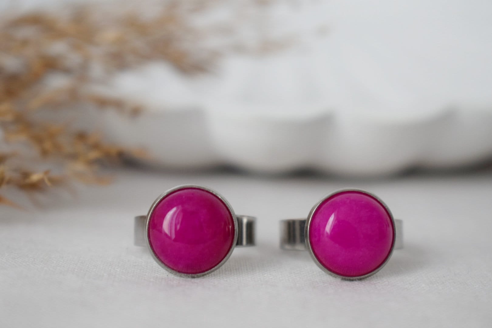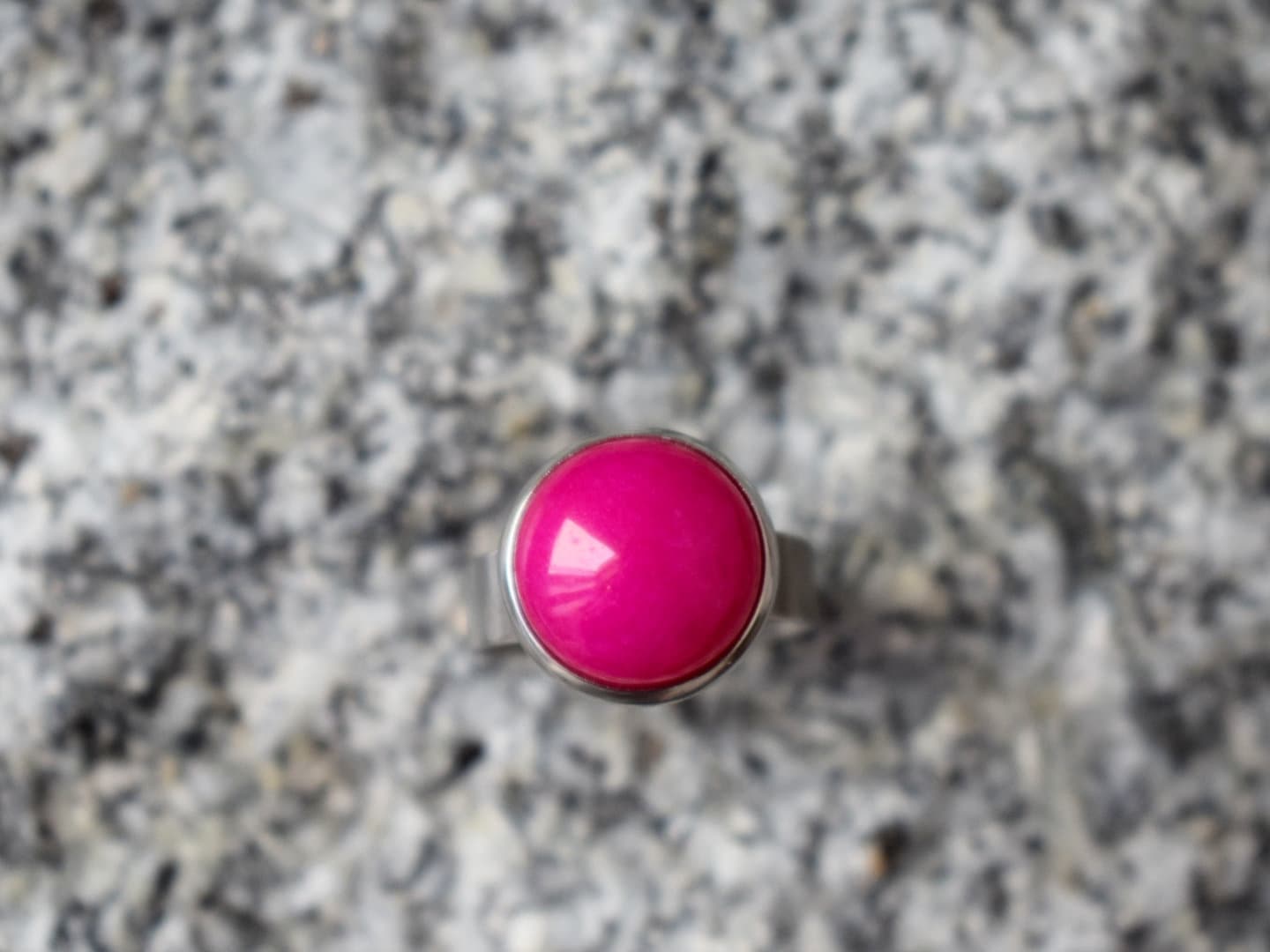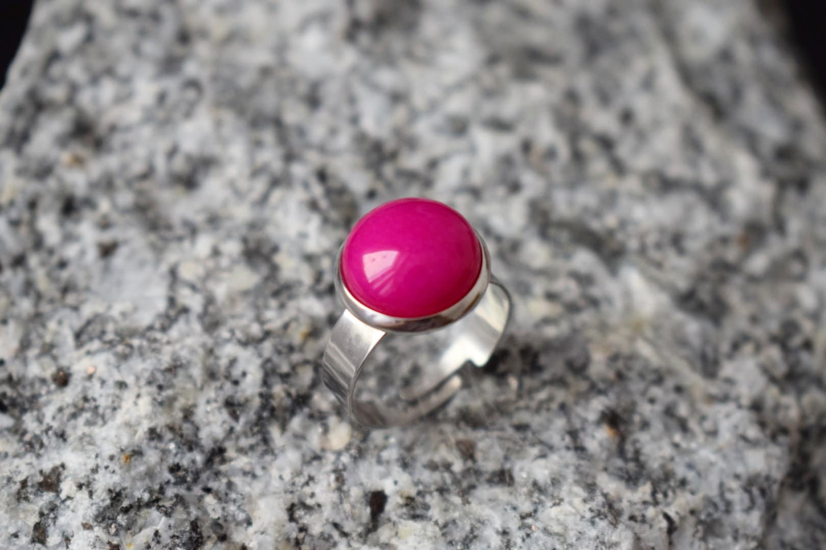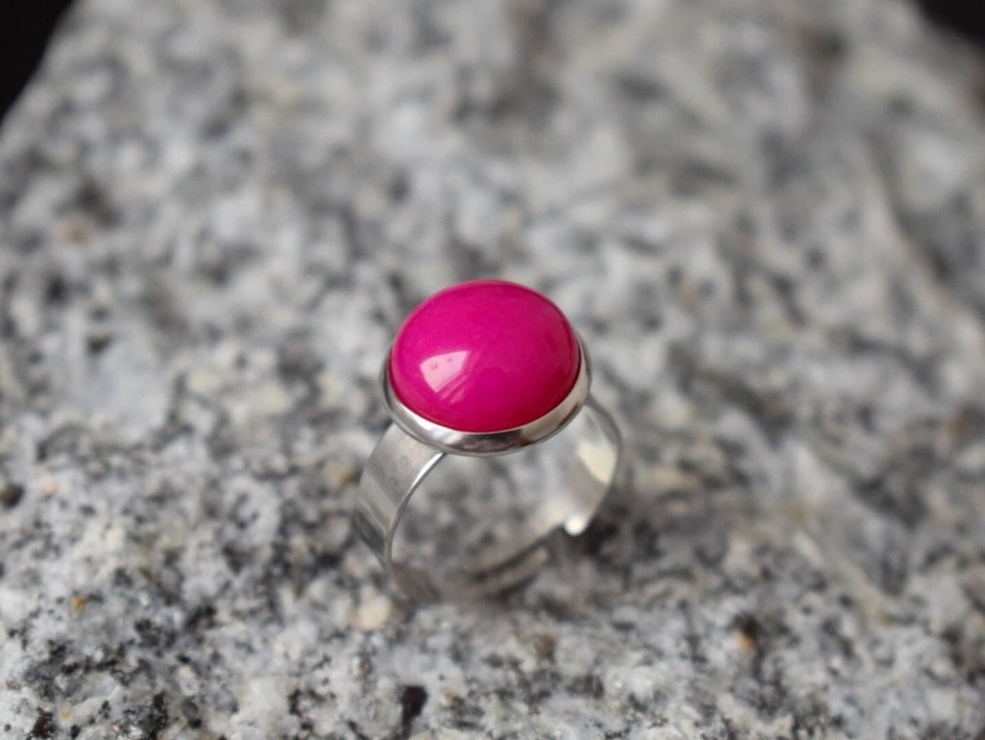 Hot pink jade ring, Magenta pink, Statement gemstone adjustable ring women, Round stone ring, Pink silver color, Jewelry birthday gift her