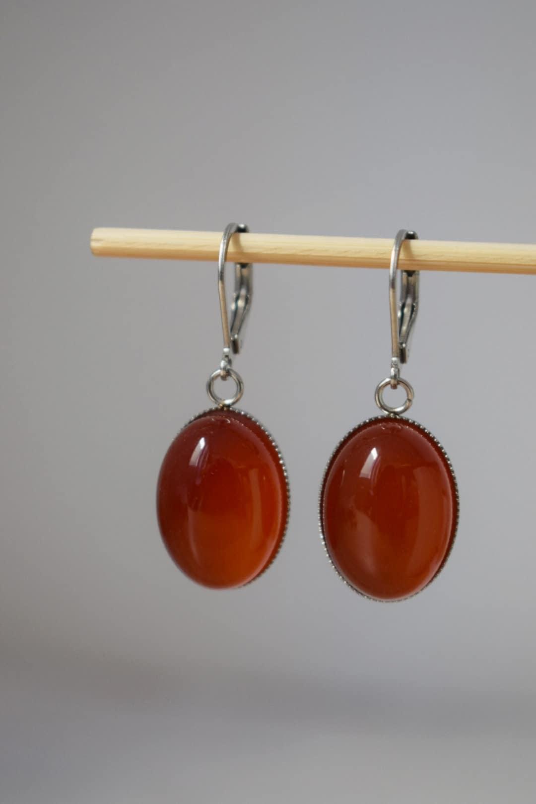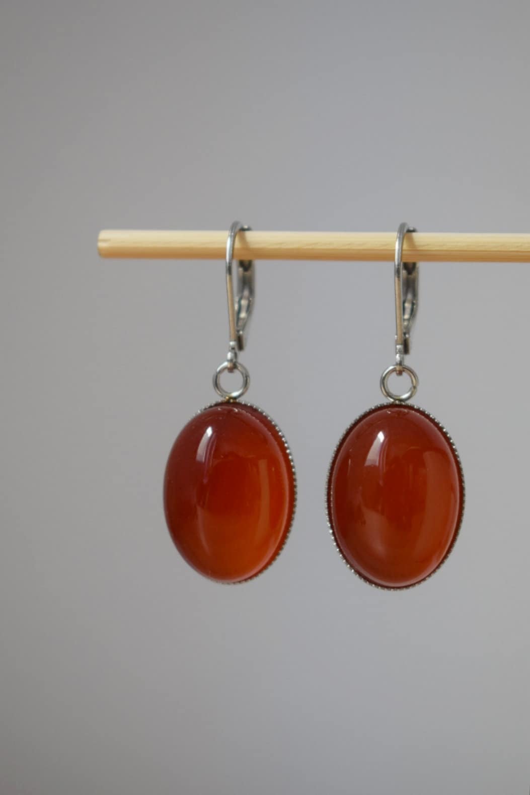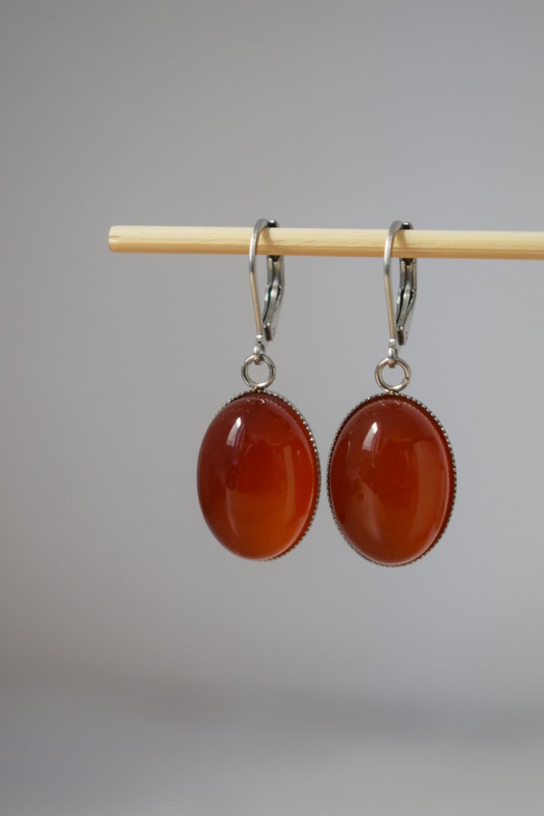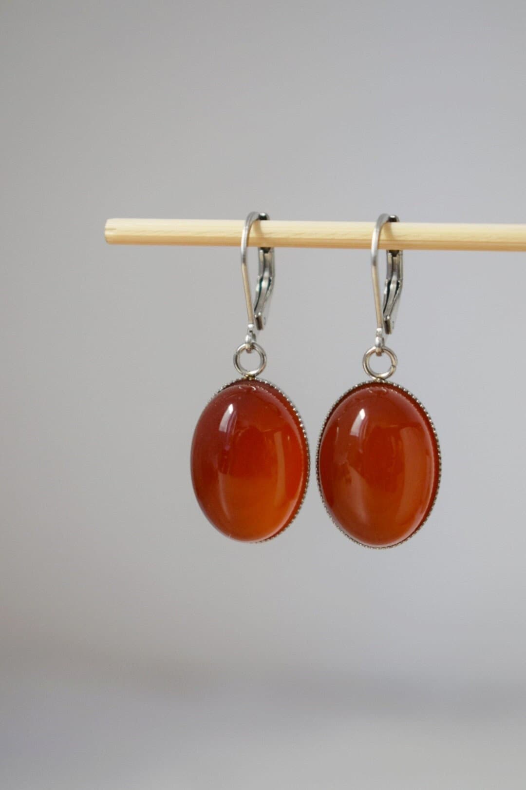 Red agate huggie hoops, Oval gemstone dangle ears, Red hanging ears, Stainless steel, Agate jewelry, Christmas gift for women