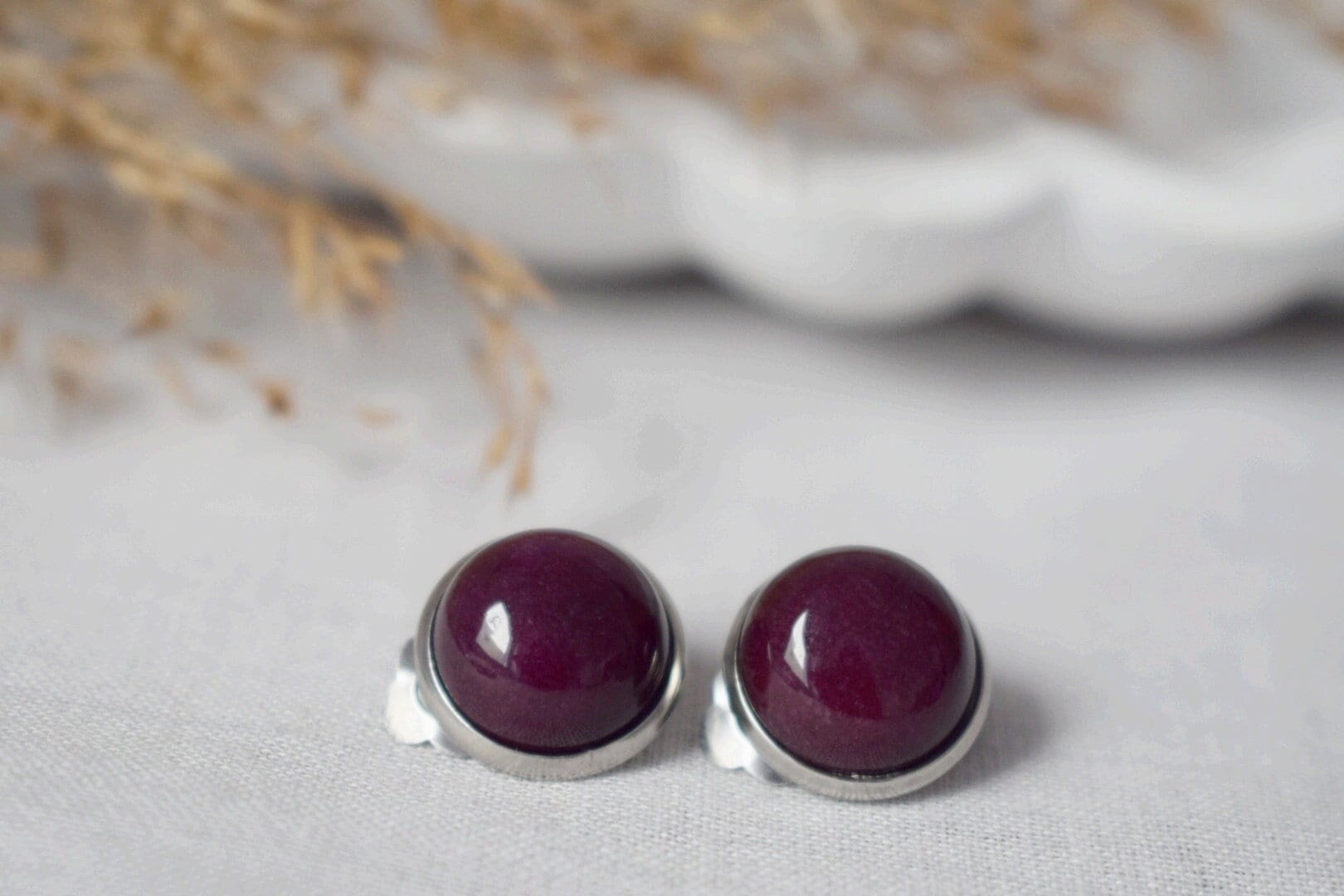 Handmade cabochon ear clip on with a pair of gemstones wine red jade ears