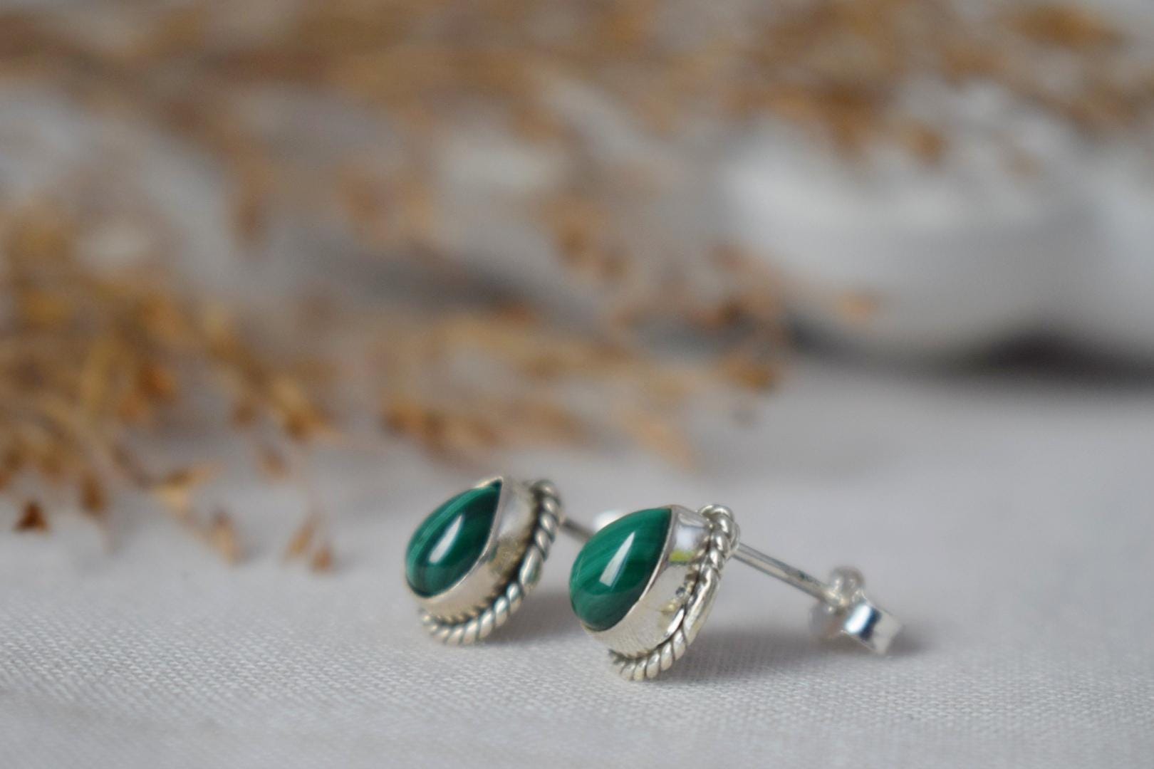 Teardrop Malachite Stud Ears in 925 Sterling Silver - Small Drop Gemstone Ornament Ears - Green Silver Jewelry Gift Embrace elegance with our Handmade Malachite Sterling Silver Stud Ears, meticulously crafted to enhance your style