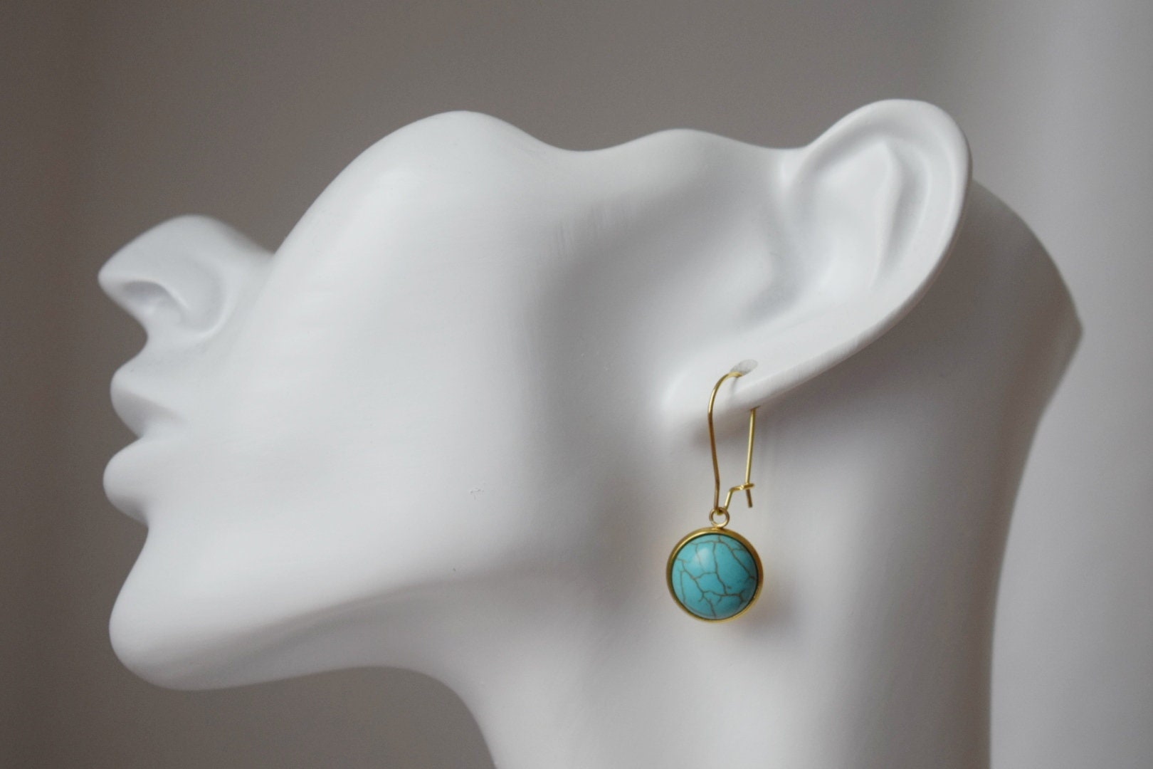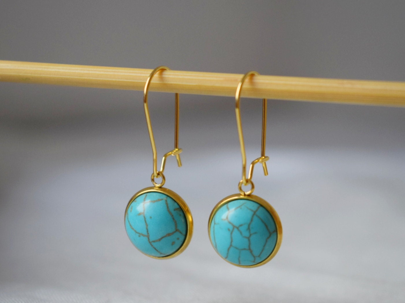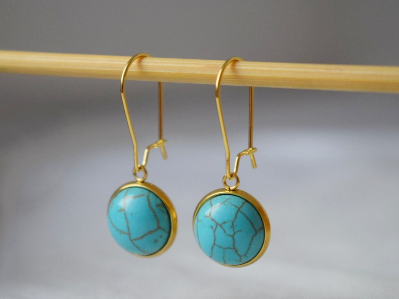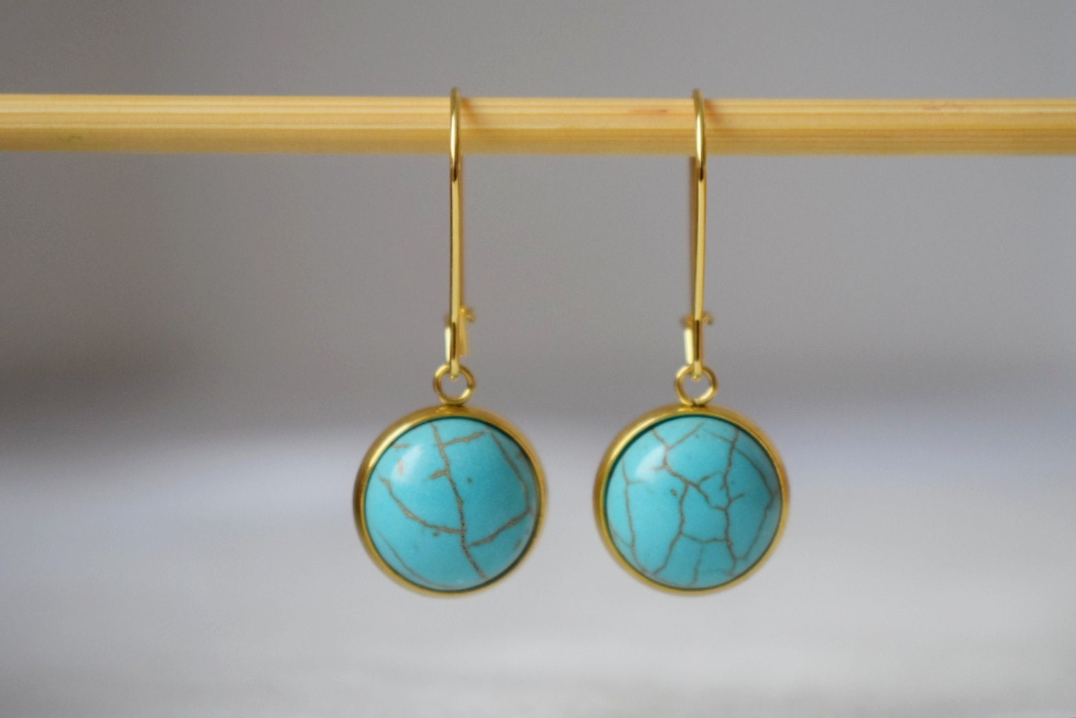 Turquoise earrings dangle, Gemstone hoop earrings gold, Round pendant hanging earrings, Lever back earrings, Turquoise jewelry, Gift for her