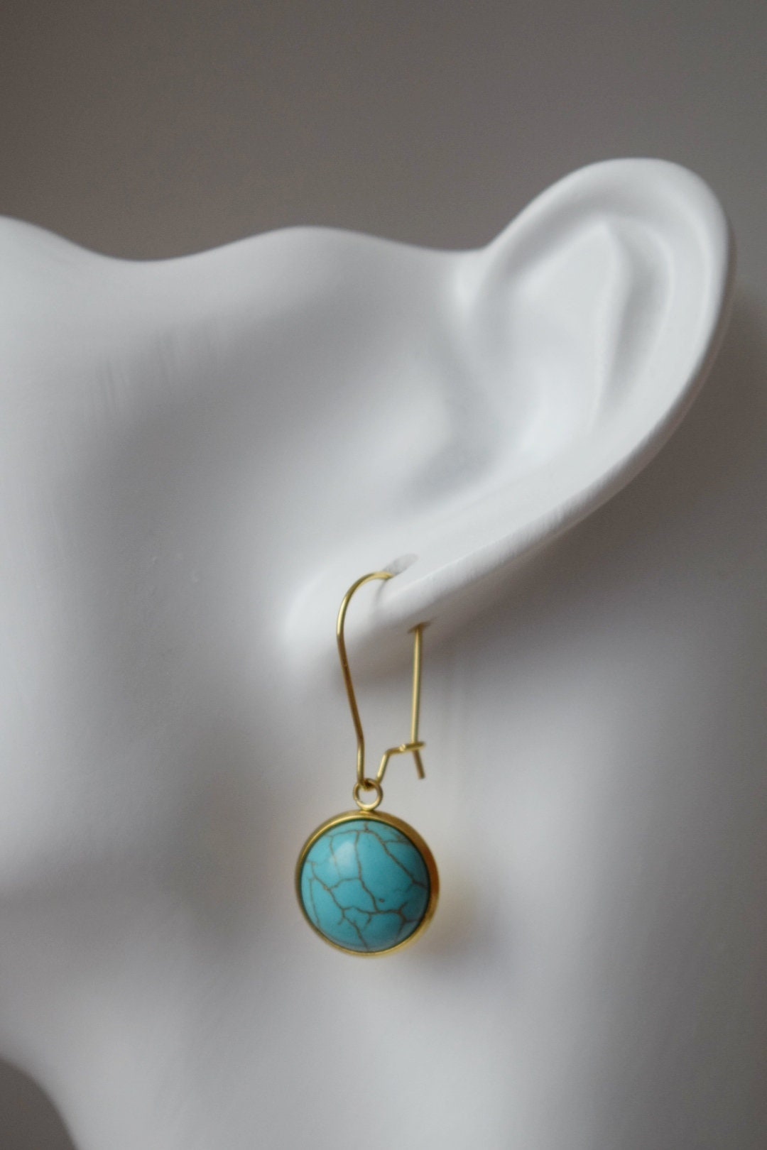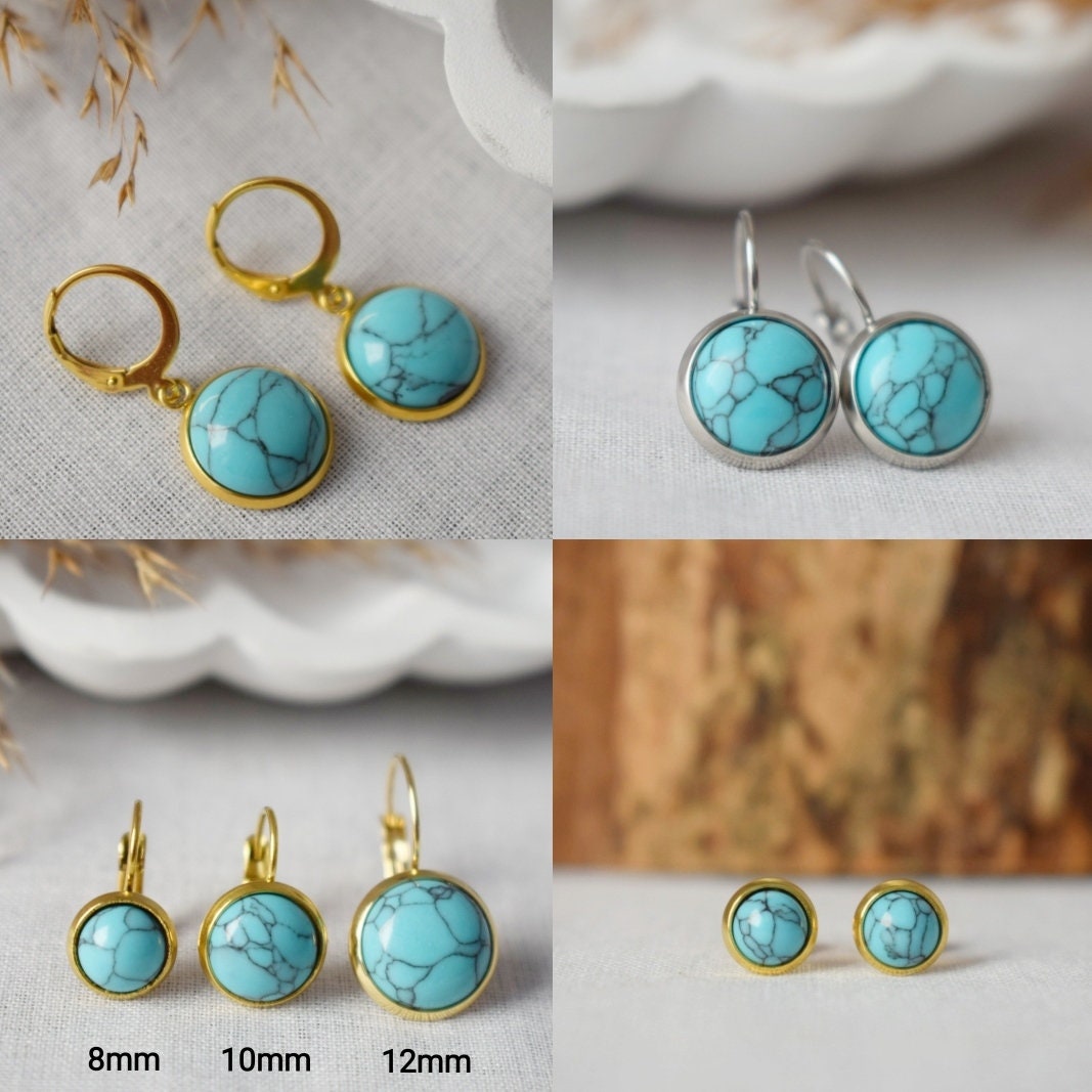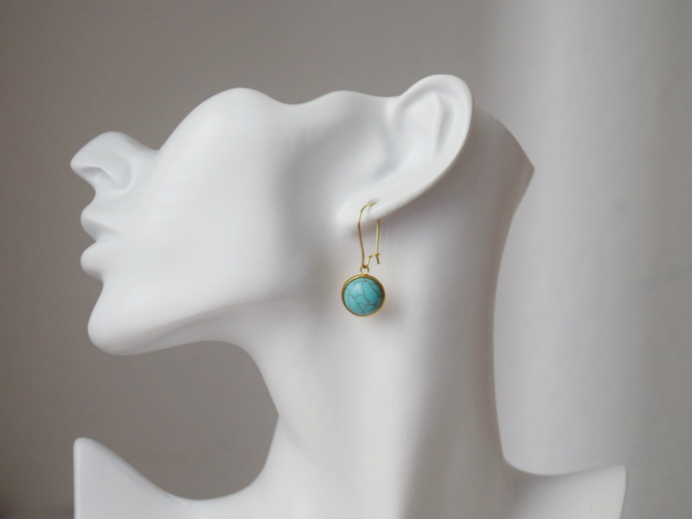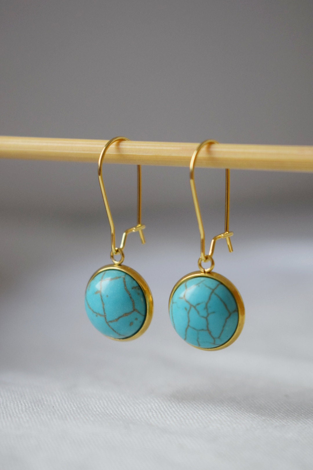 Turquoise earrings dangle, Gemstone hoop earrings gold, Round pendant hanging earrings, Lever back earrings, Turquoise jewelry, Gift for her
