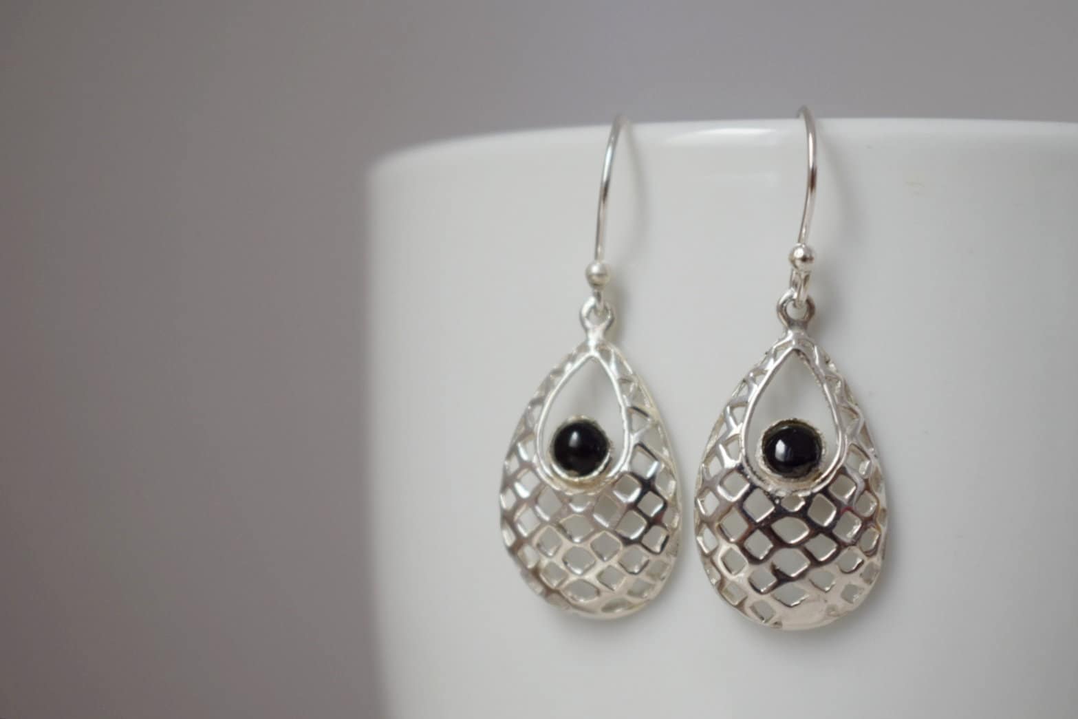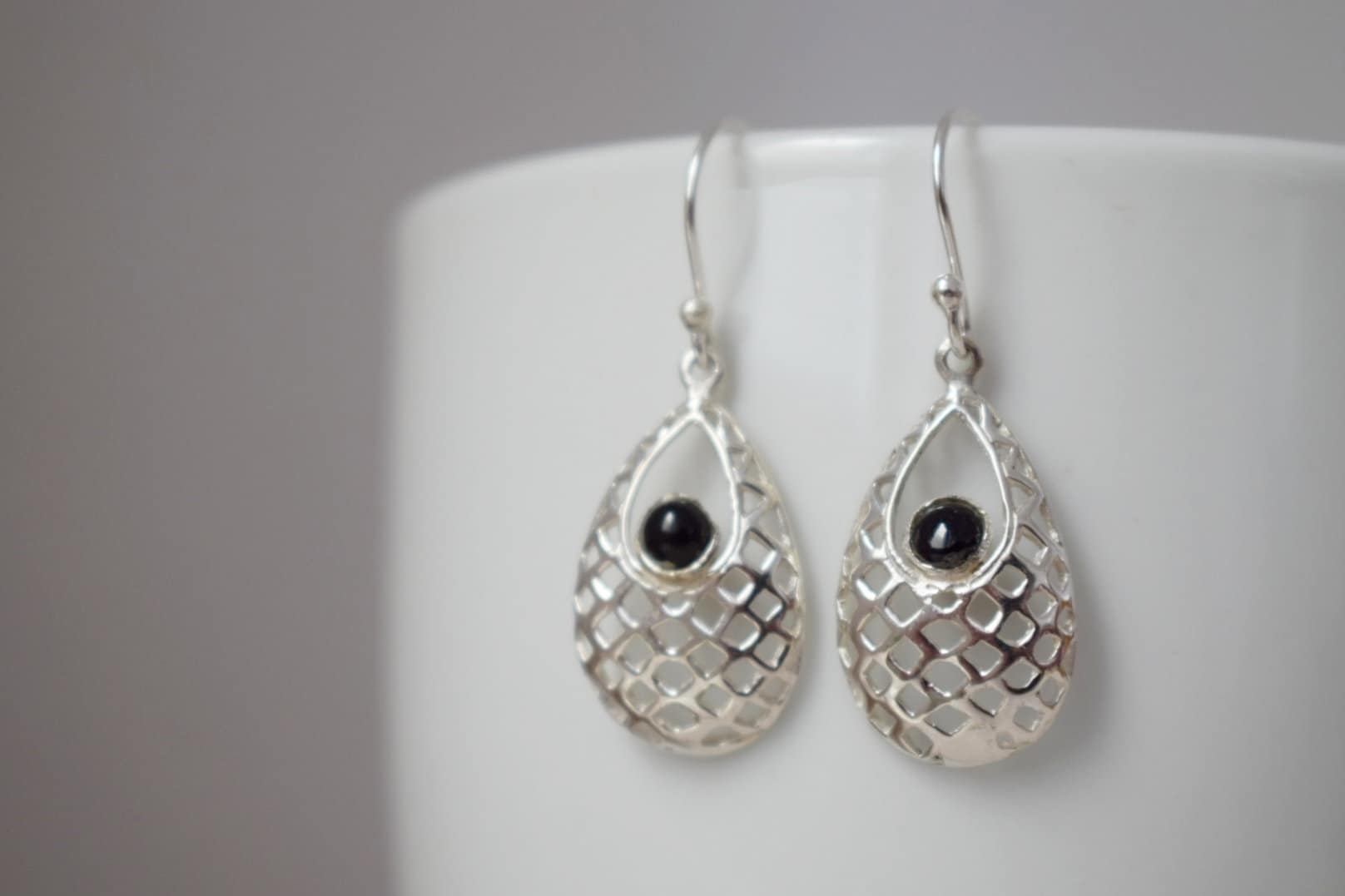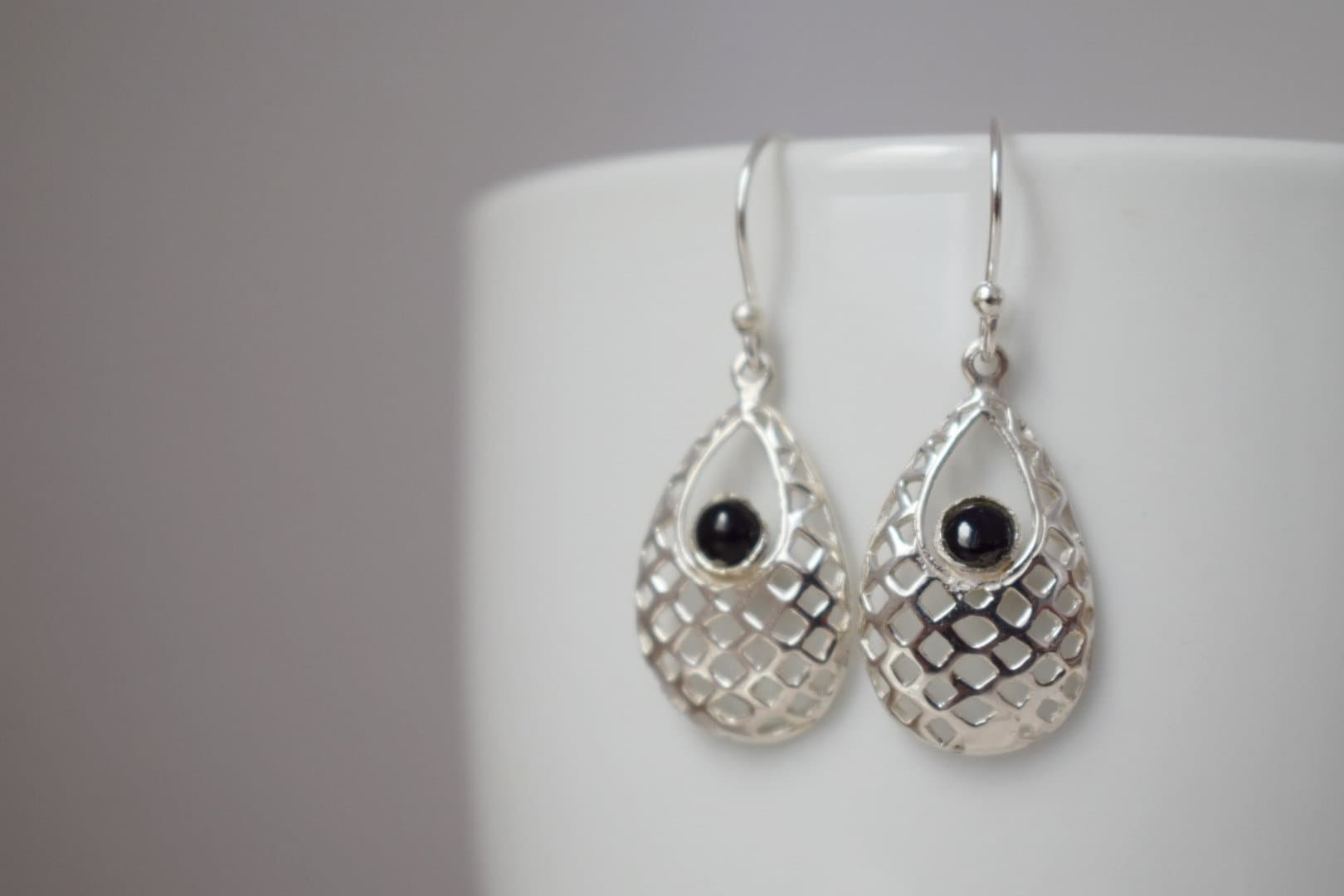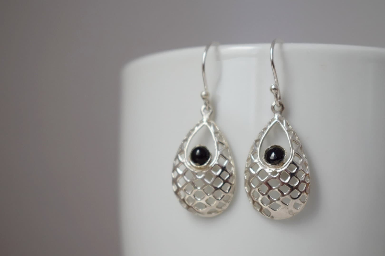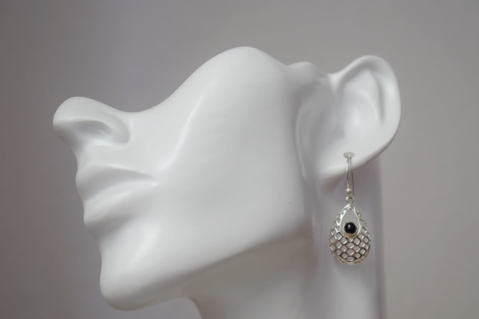 Schwarze Onyx-Ohrhänger mit Sterling-Silber-Tropfen-Ornament-Anhänger und 925er Silber-Ohrhaken, Boho-Edelsteinschmuck, Geschenk für Sie