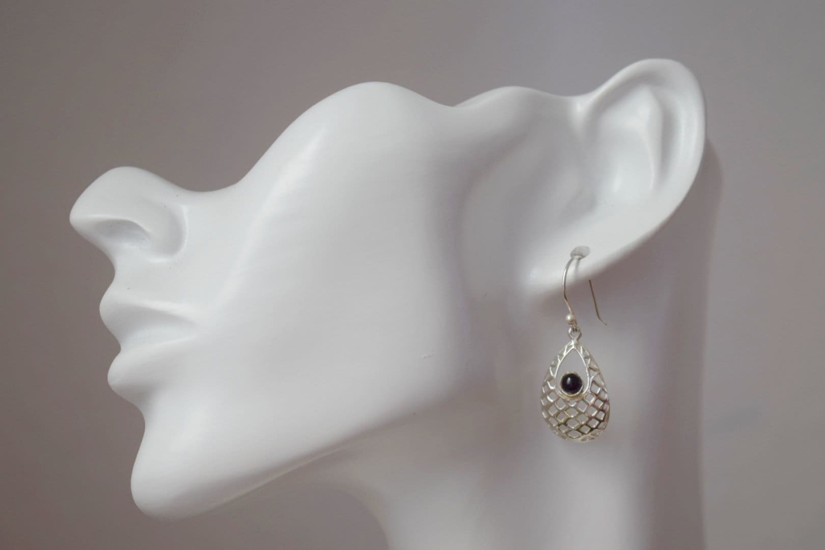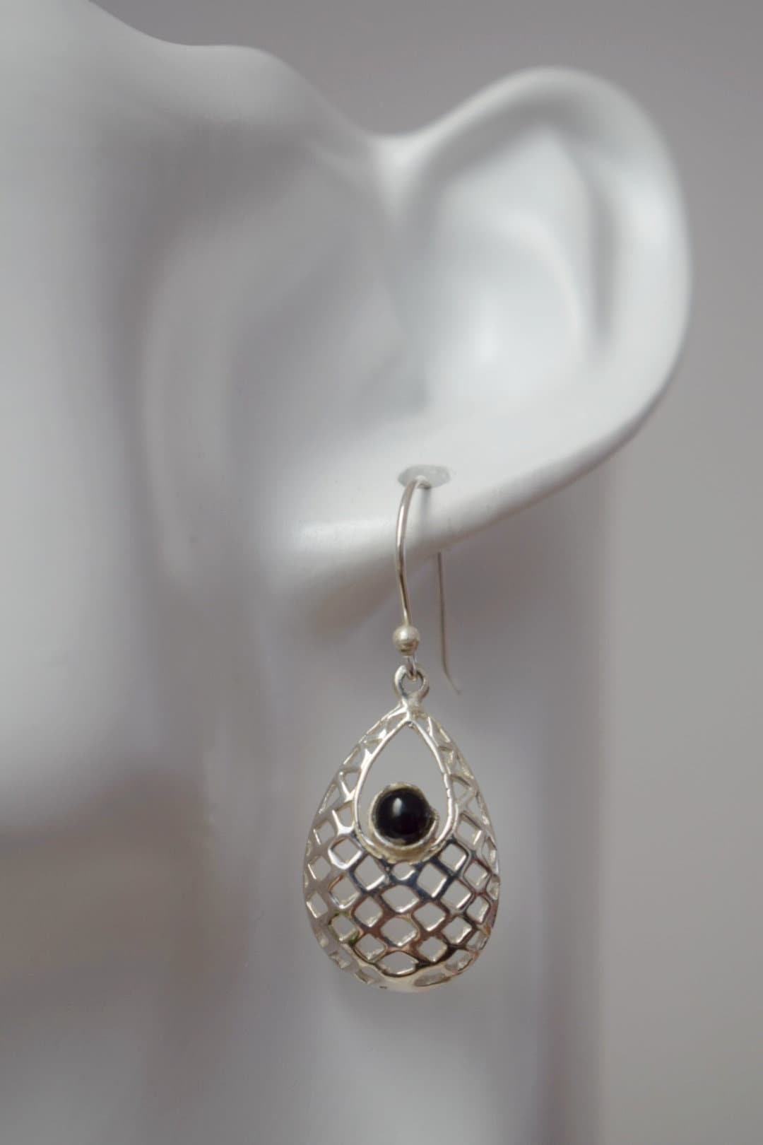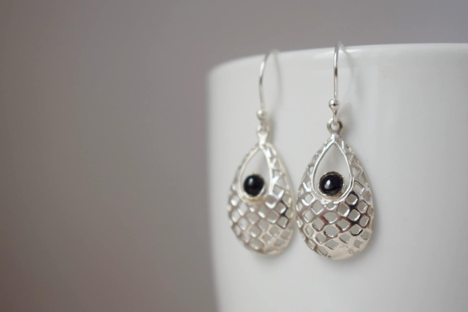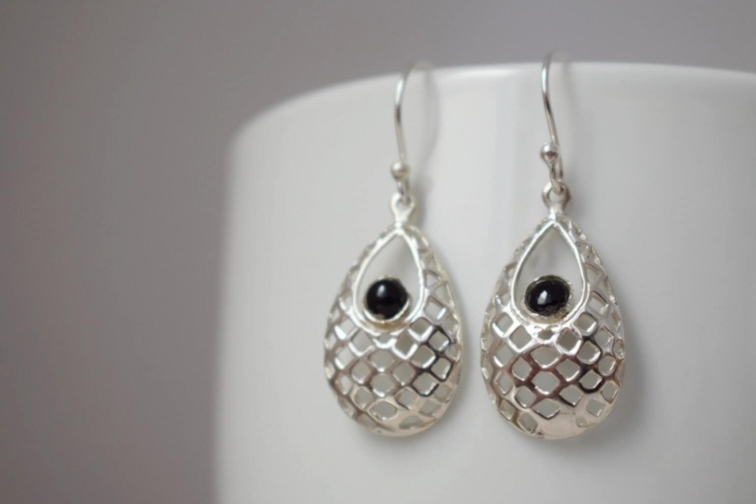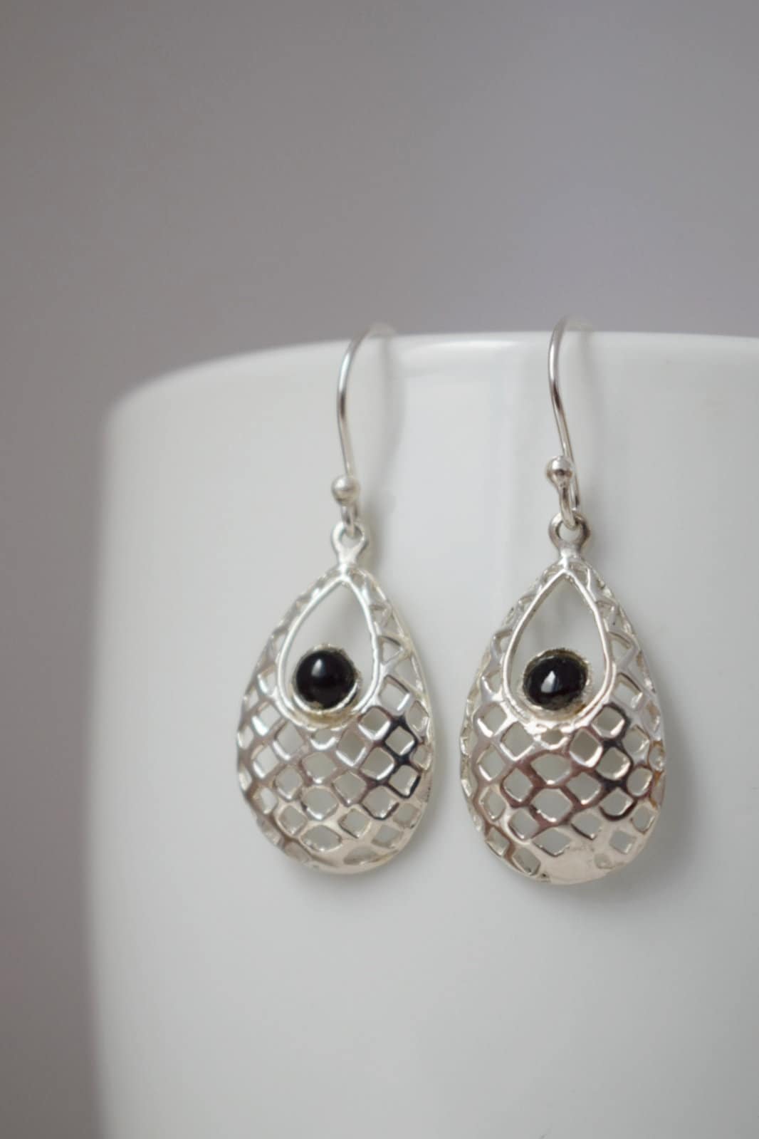 Schwarze Onyx-Ohrhänger mit Sterling-Silber-Tropfen-Ornament-Anhänger und 925er Silber-Ohrhaken, Boho-Edelsteinschmuck, Geschenk für Sie