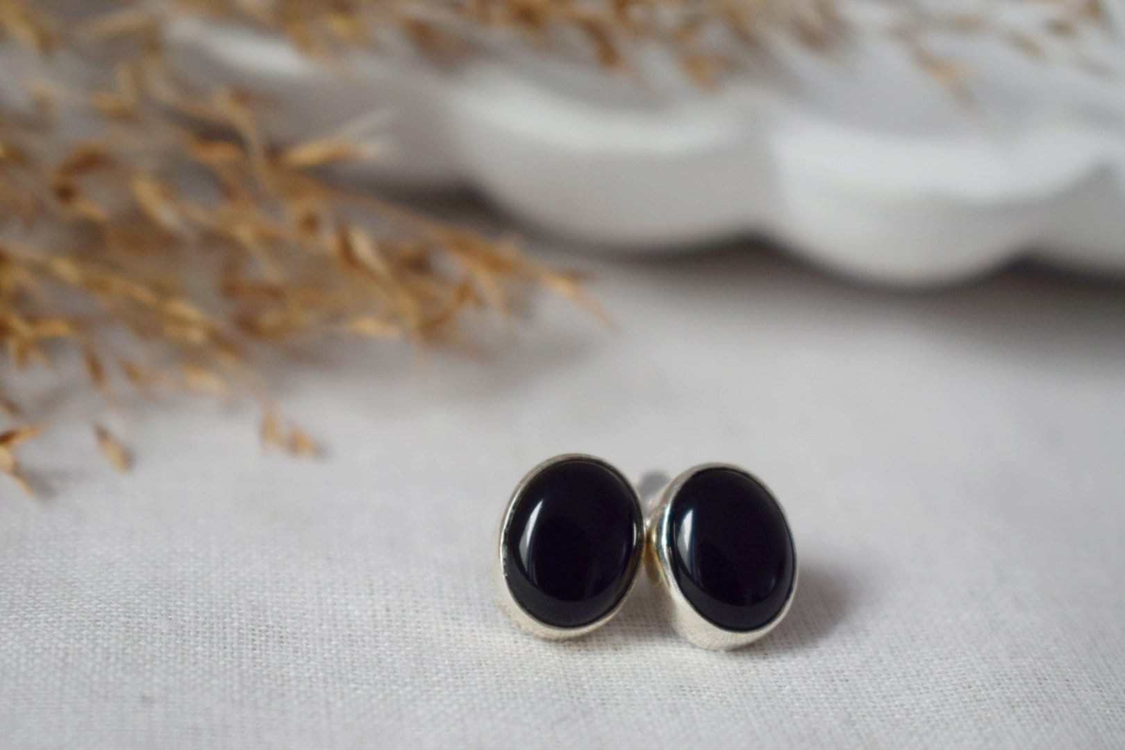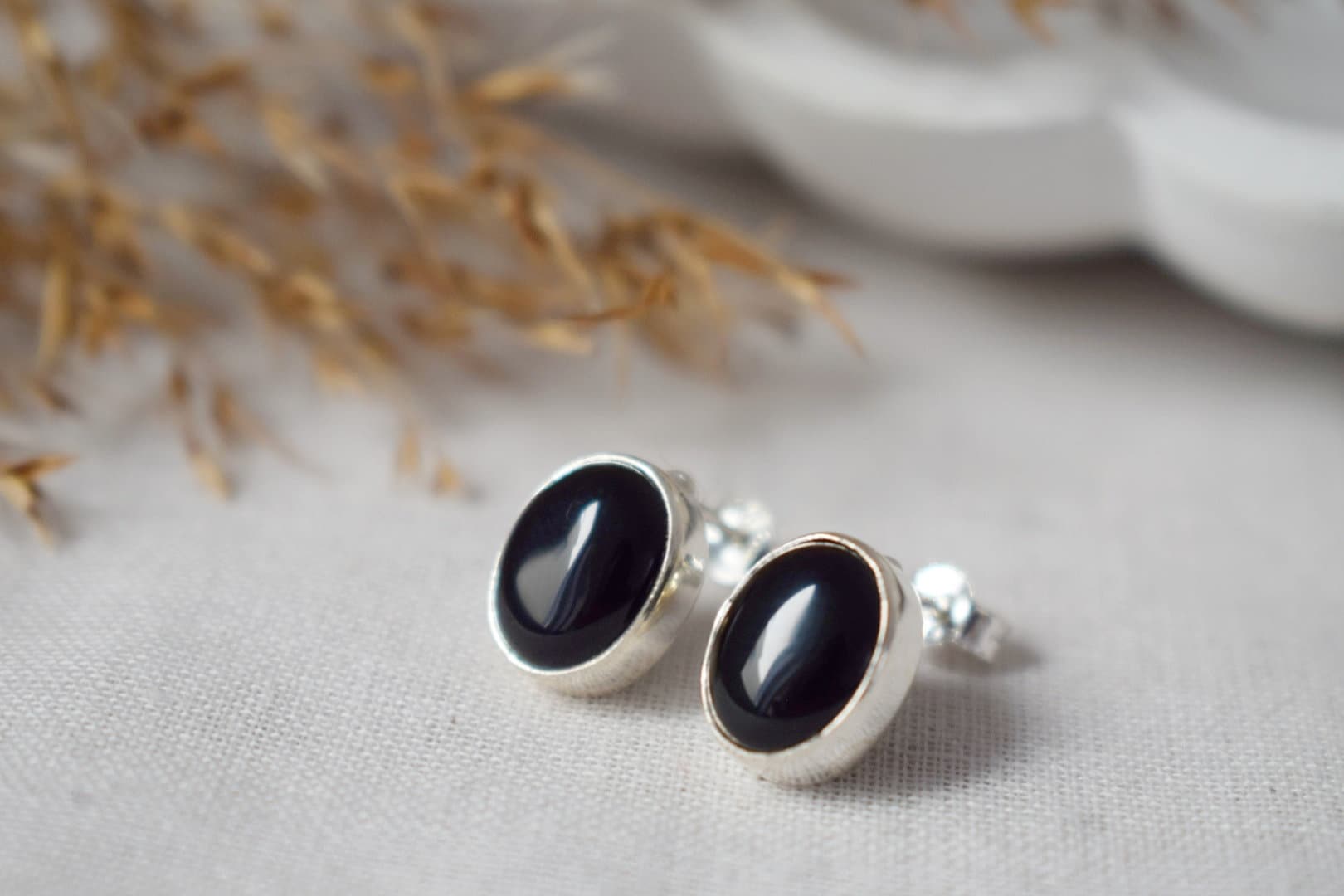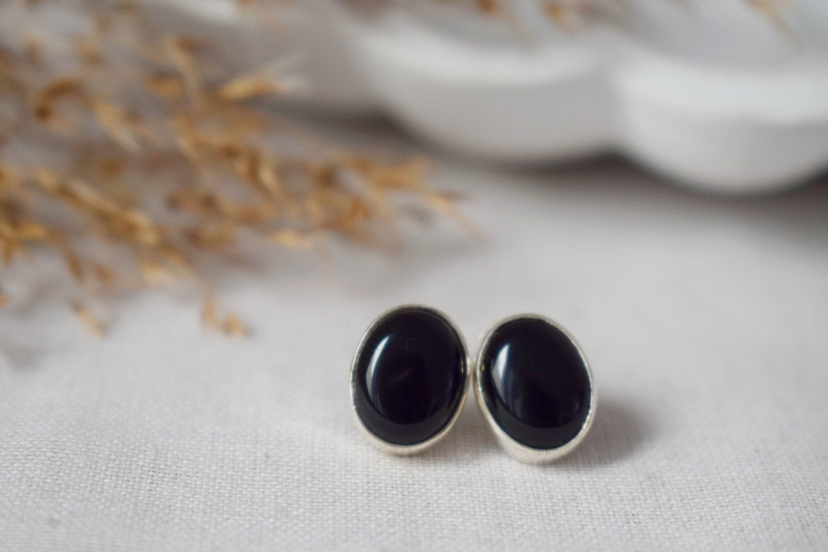 Schwarze Onyx Ohrstecker Sterling Silber, Kleine ovale Edelstein Ohrstecker, Geburtsstein 925 Silber Schmuck
