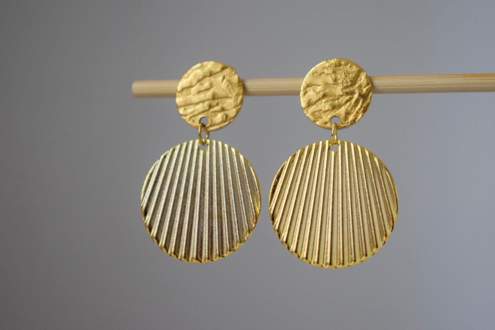 Goldene Boho-Ohrringe, Statement-Scheiben-Ohrhänger, runder Wellplatten-Anhänger, Kreis-Ohrringe, Einzigartiges Schmuckgeschenk für Sie