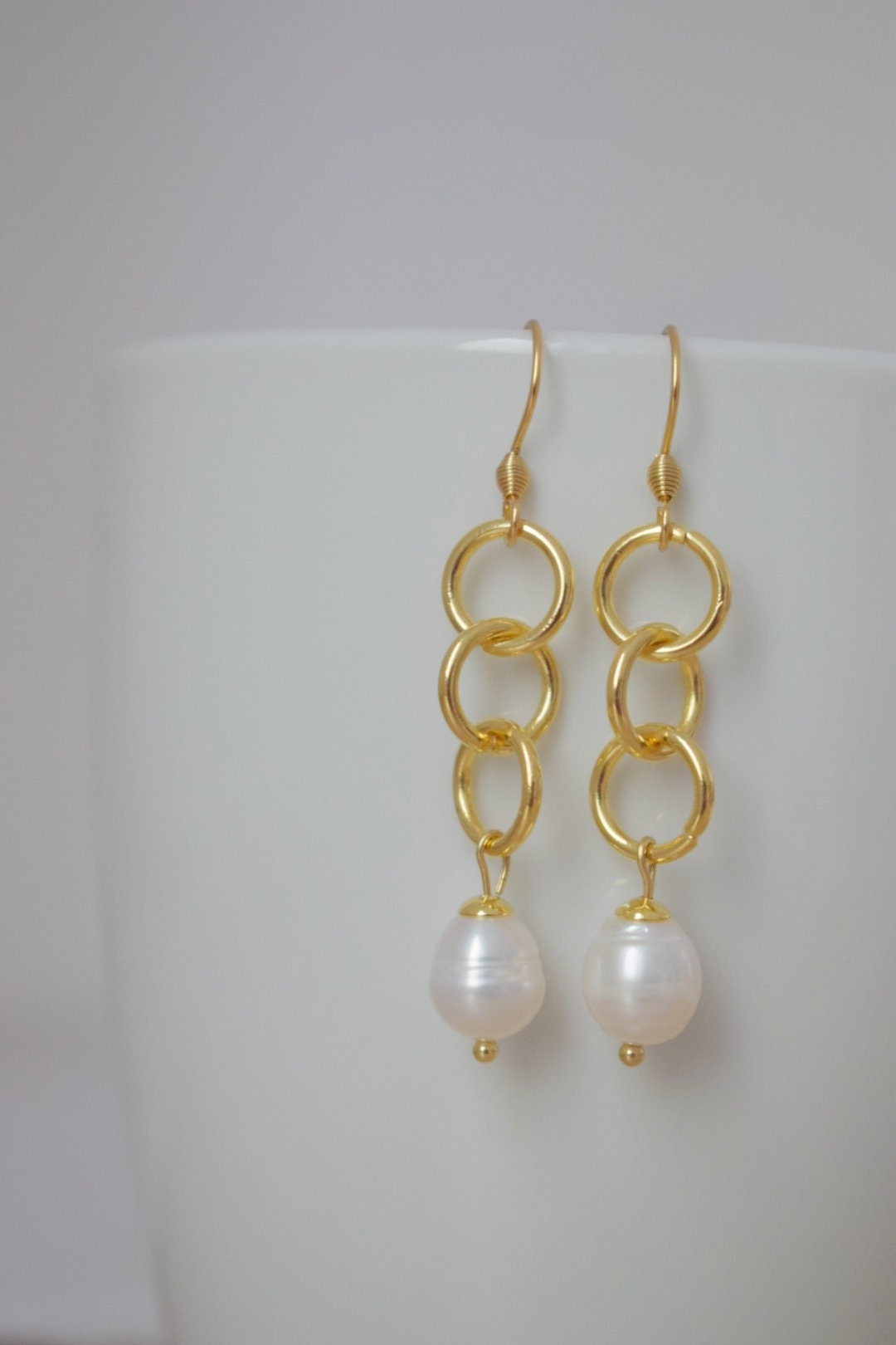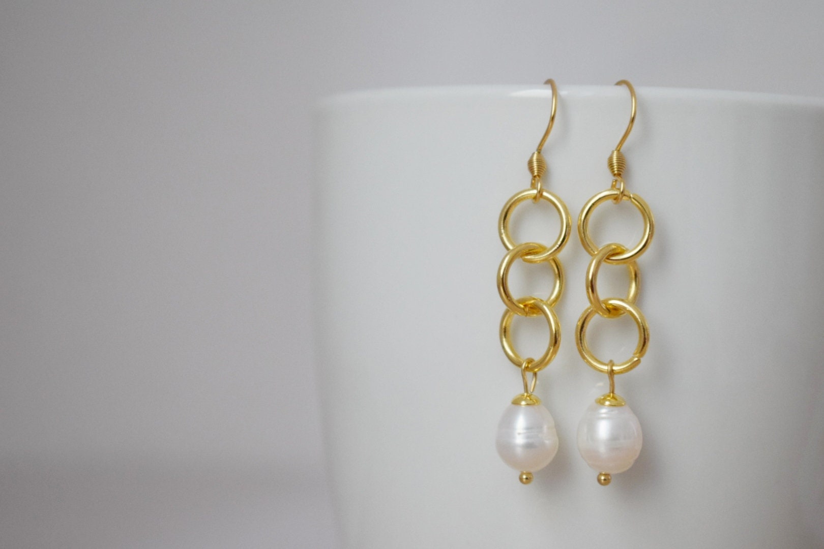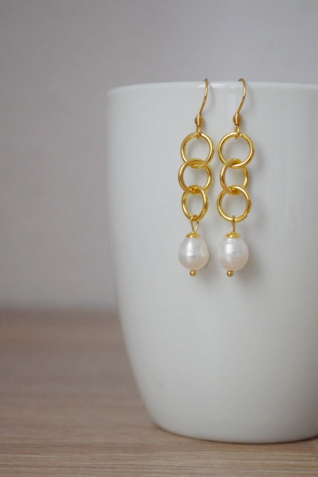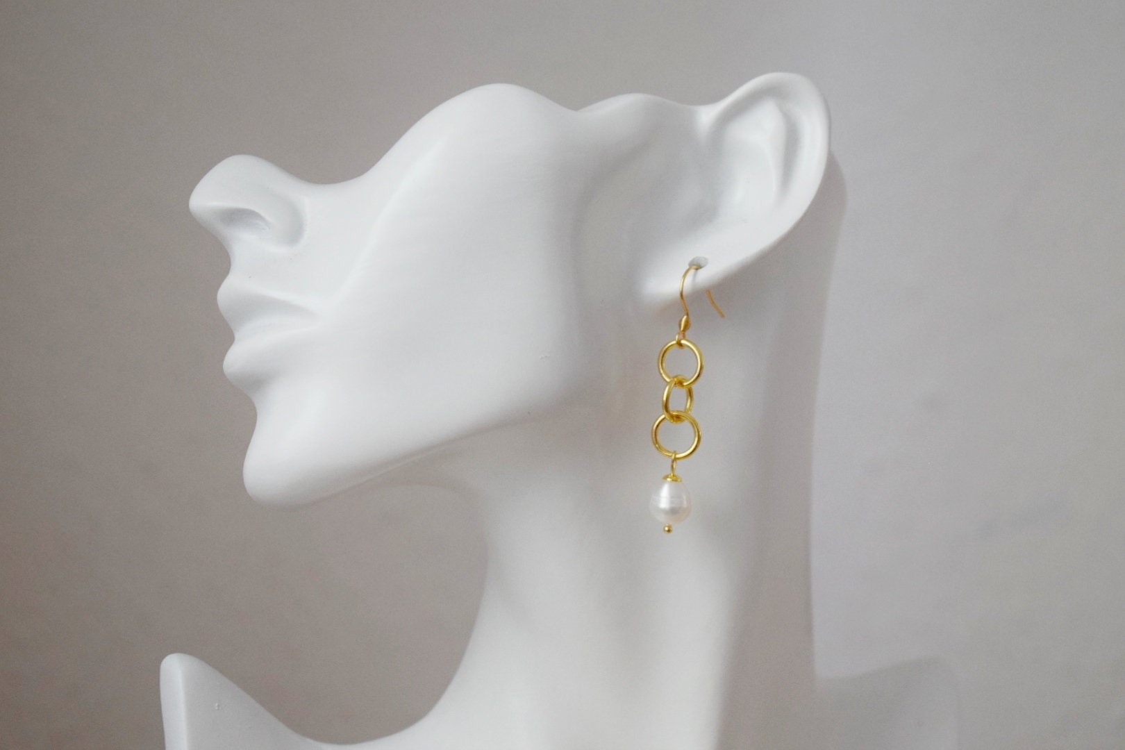 Lange moderne Ohrhänger mit Süßwasserperle, 24 Karat vergoldeter Edelstahlschmuck