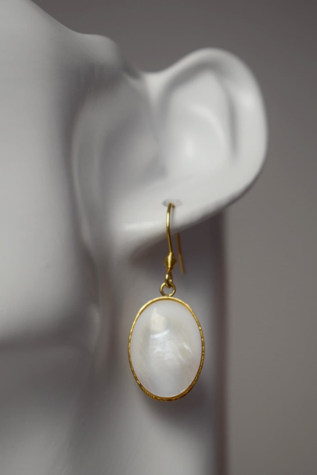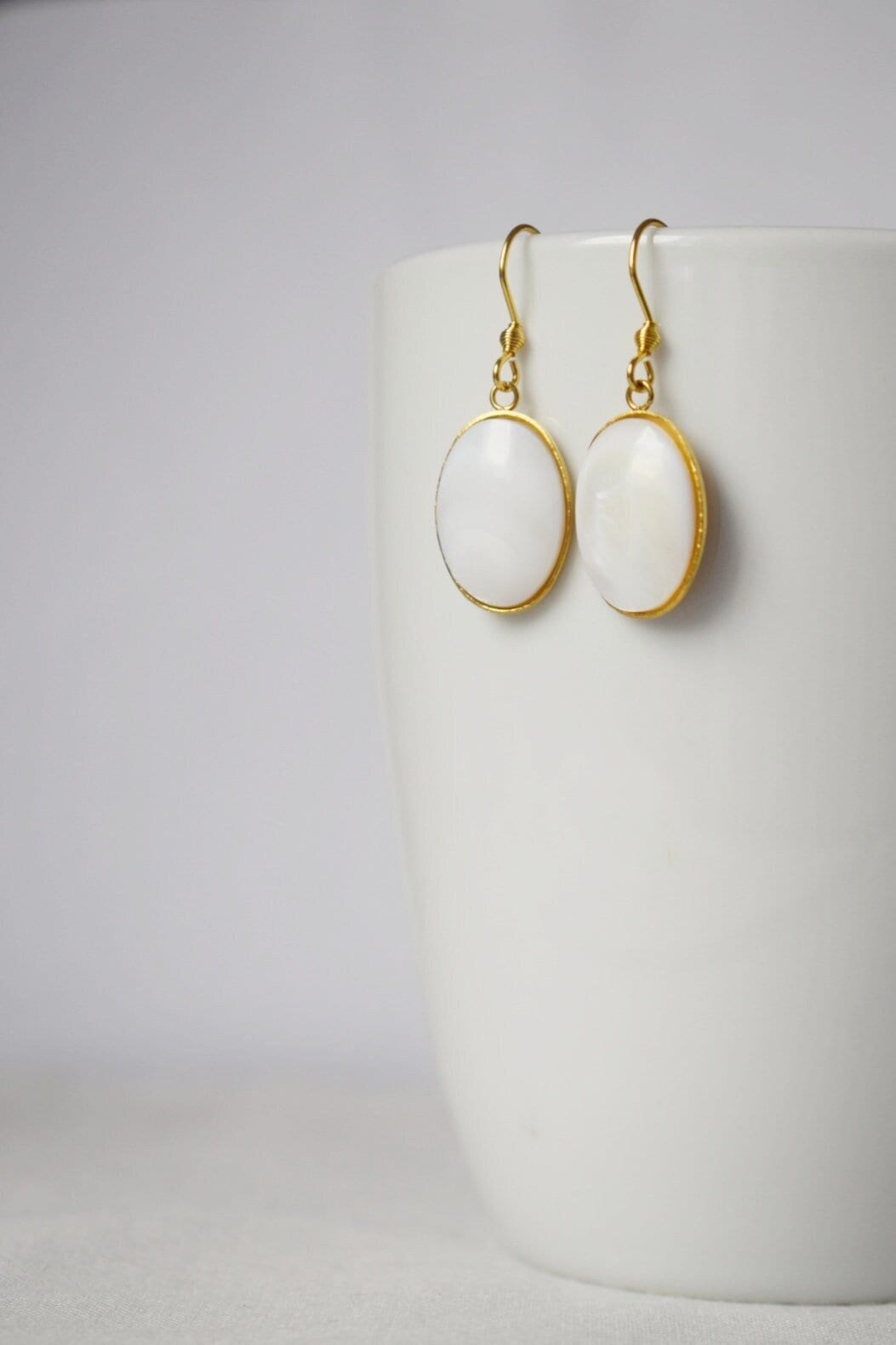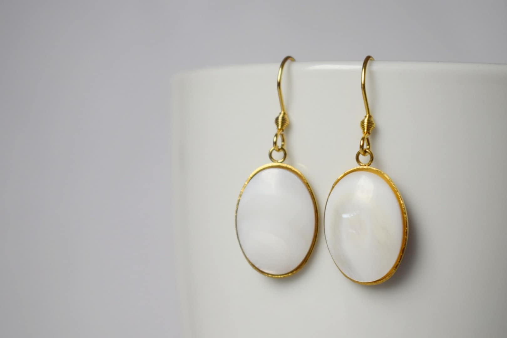 Hochwertige vergoldete Ohrhaken aus Edelstahl Hochwertige Ohrhaken aus vergoldetem Edelstahl. Ovaler Anhänger aus hochwertigem, vergoldetem Edelstahl. Süßwassermuschel-Cabochons, Muschelfarbe. Passende HalsketteHighlights