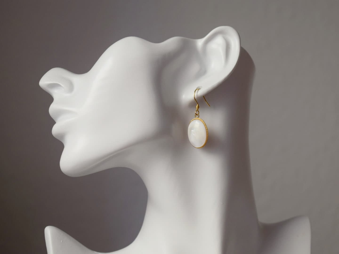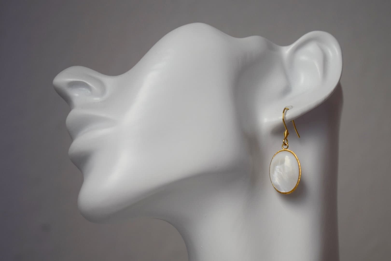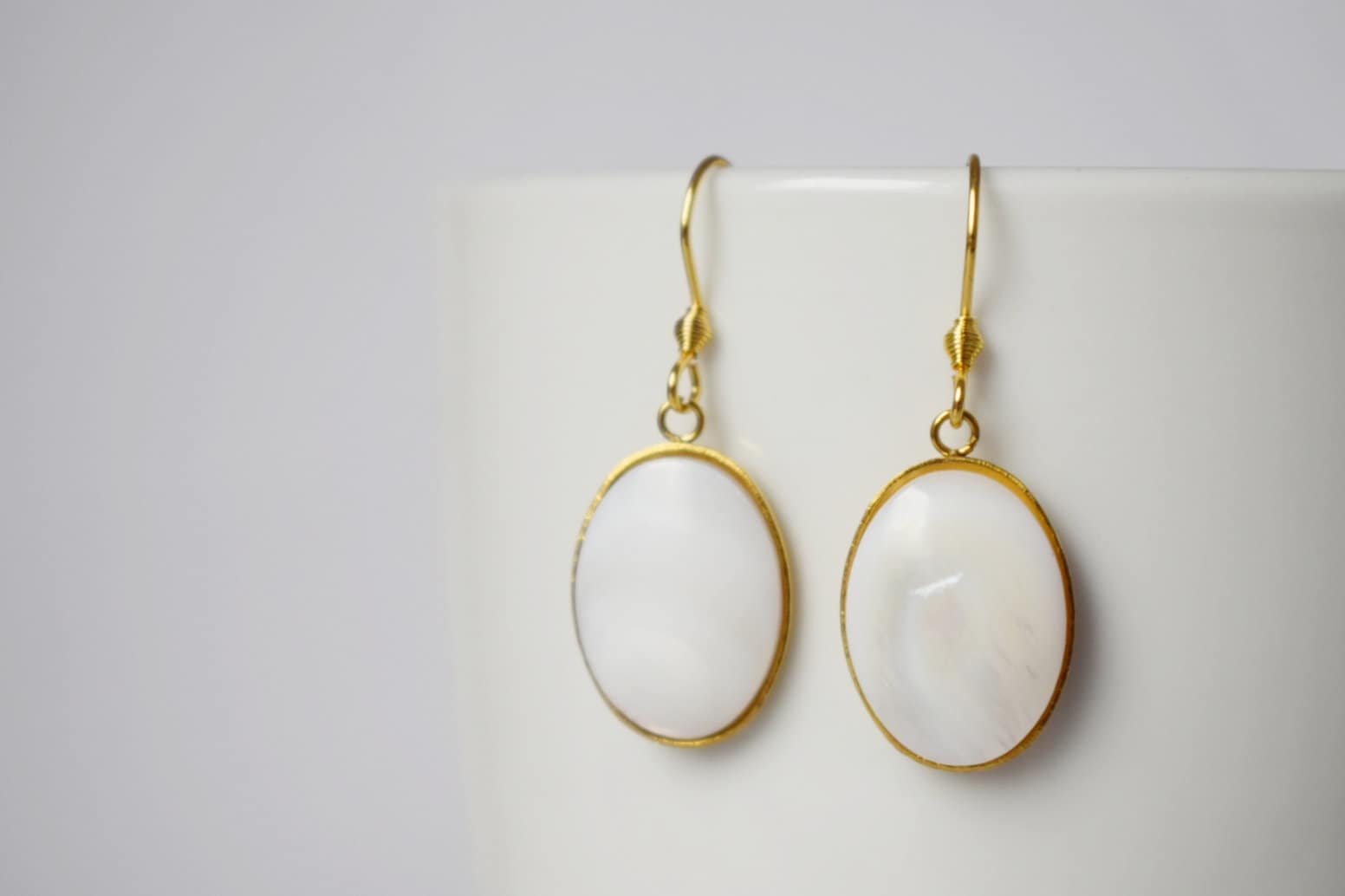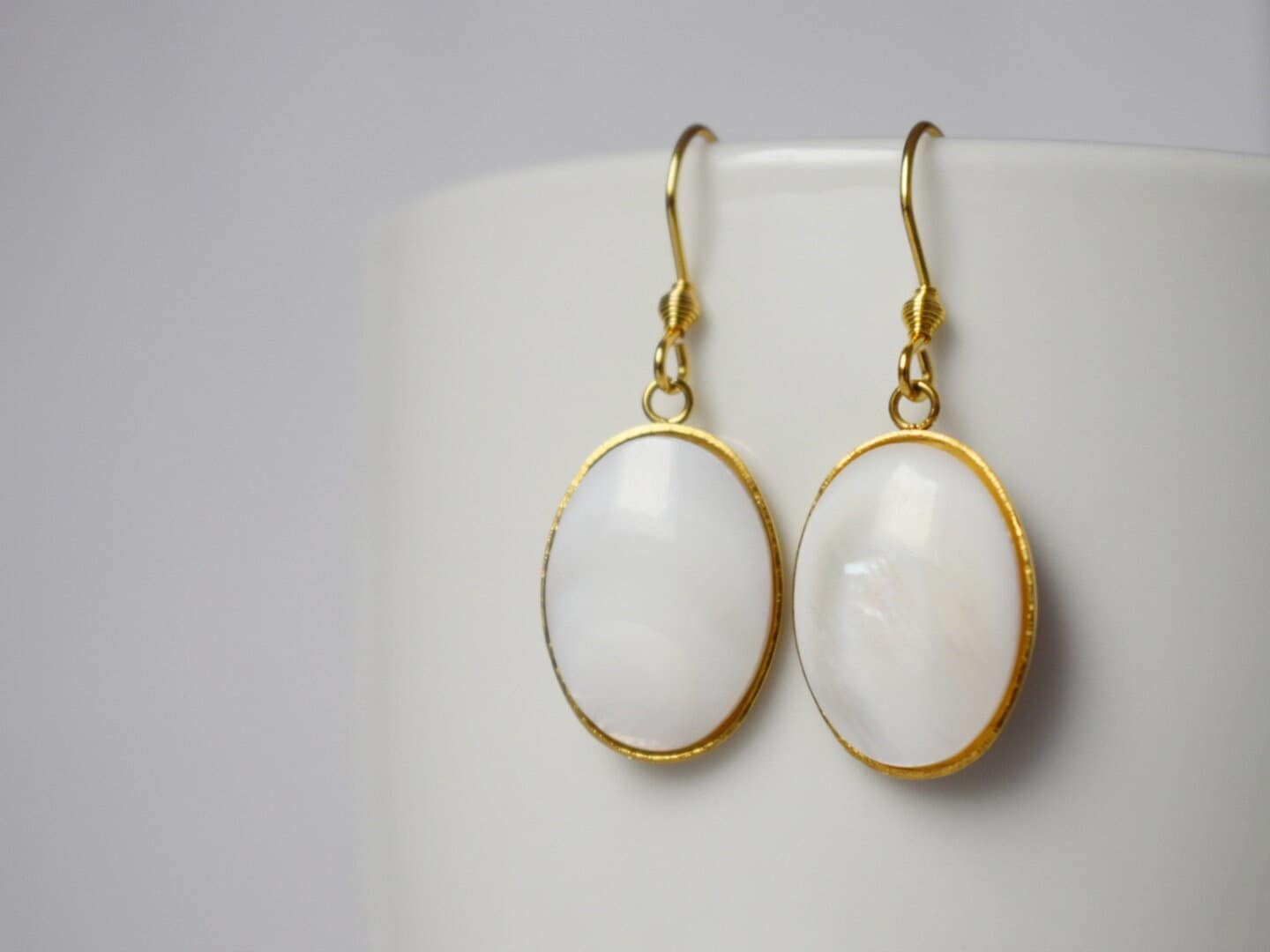 Hochwertige vergoldete Ohrhaken aus Edelstahl Hochwertige Ohrhaken aus vergoldetem Edelstahl. Ovaler Anhänger aus hochwertigem, vergoldetem Edelstahl. Süßwassermuschel-Cabochons, Muschelfarbe. Passende HalsketteHighlights