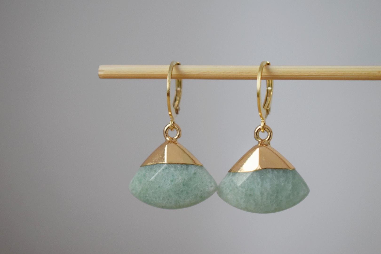 Vergoldete Huggie-Ohrringe mit Aventurin-Anhänger, Baumelnde Steinohrringe, Grüne Dreieck-Tropfenohrringe, Fächerohrringe, Schmuckgeschenk für Sie