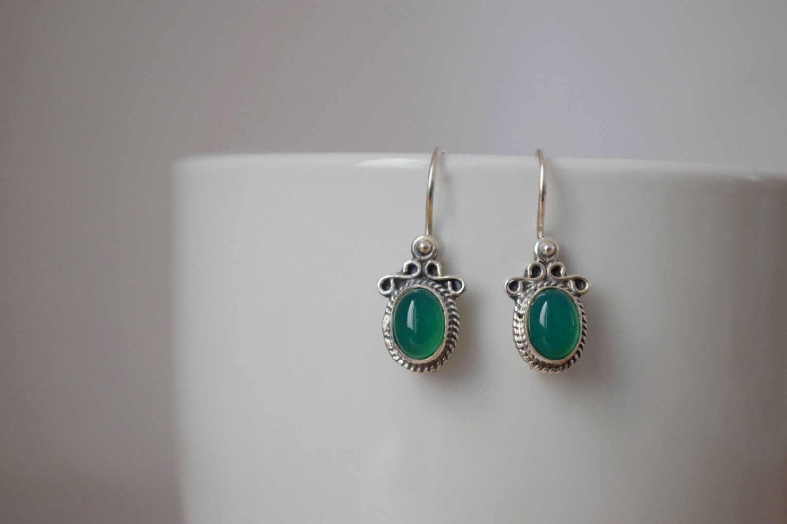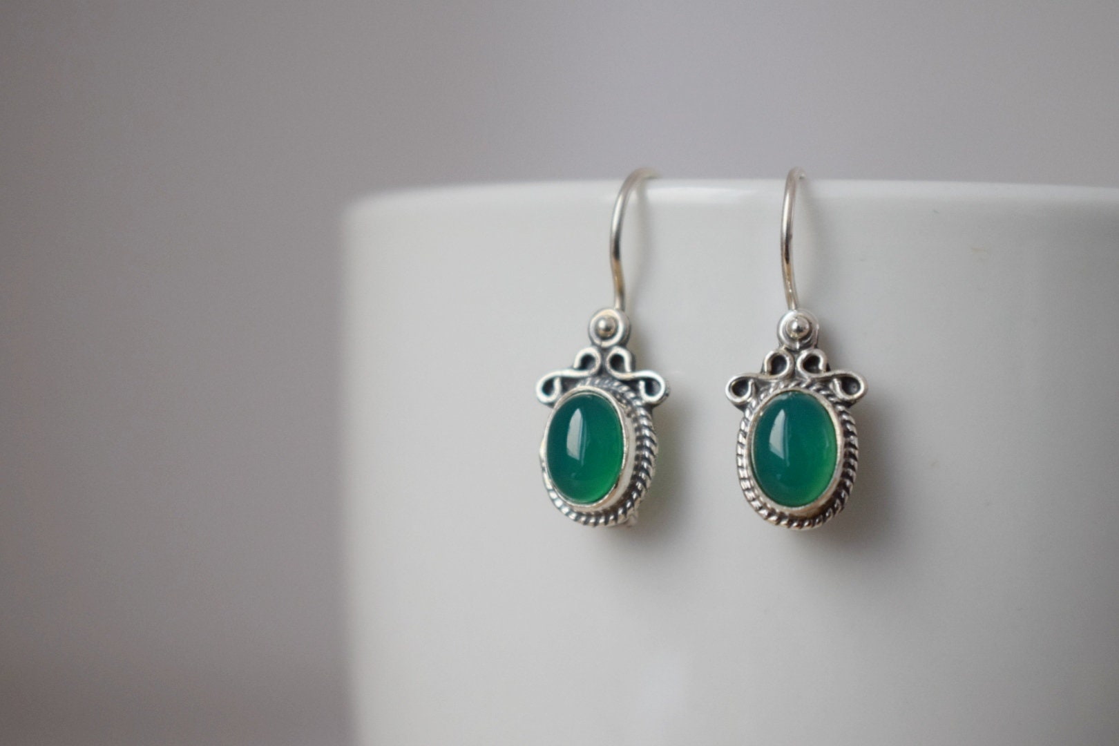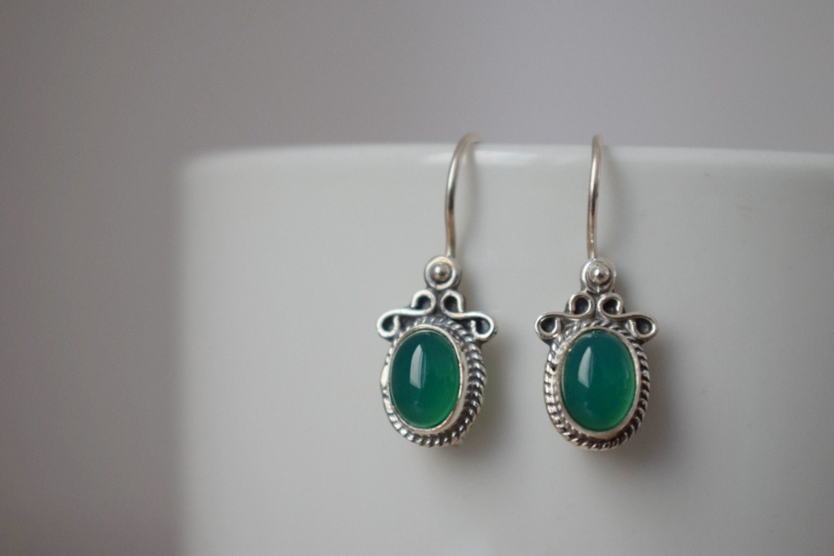 Grüne Onyxohren aus 925 Sterling Silber, Ovale Edelsteinohren, Ornamentohren, Einzigartiger Silberschmuck