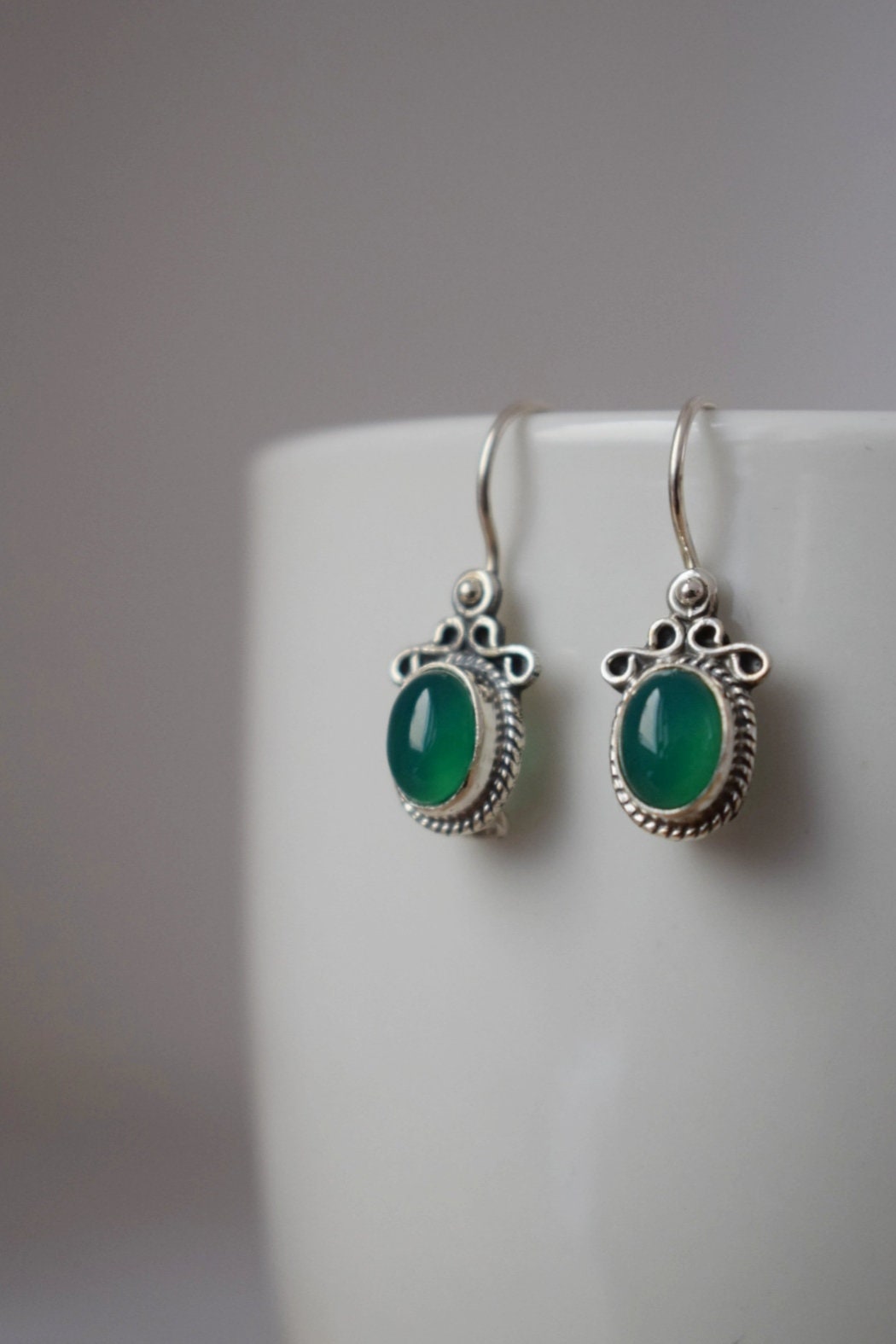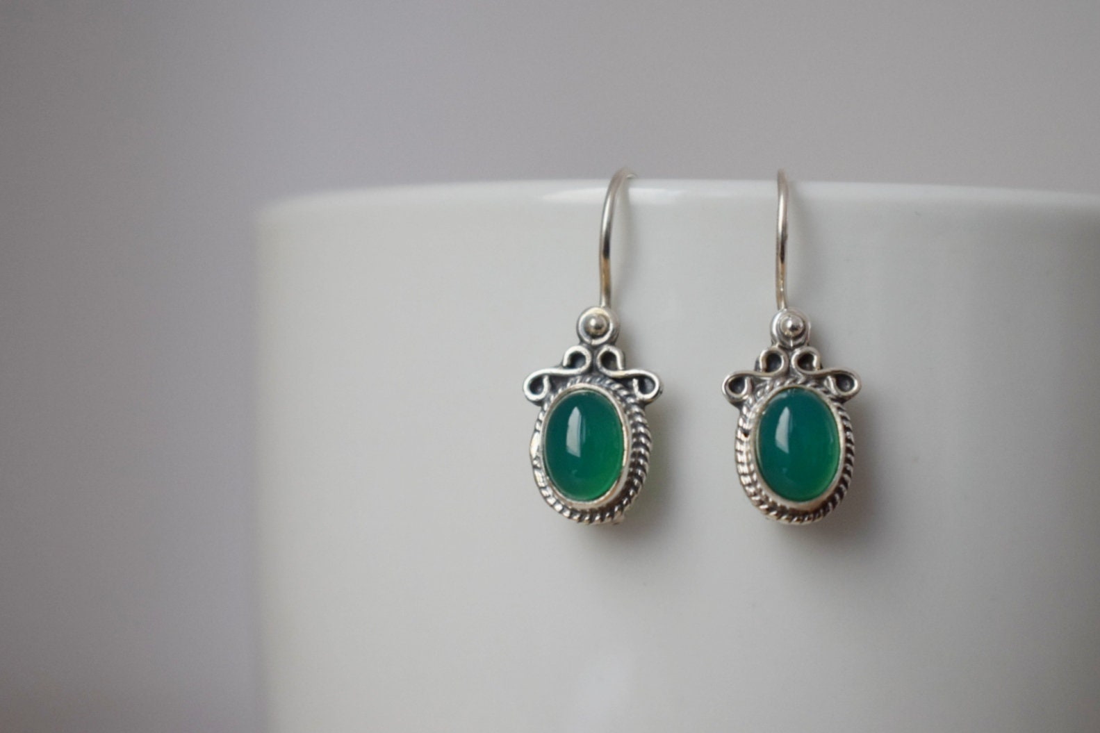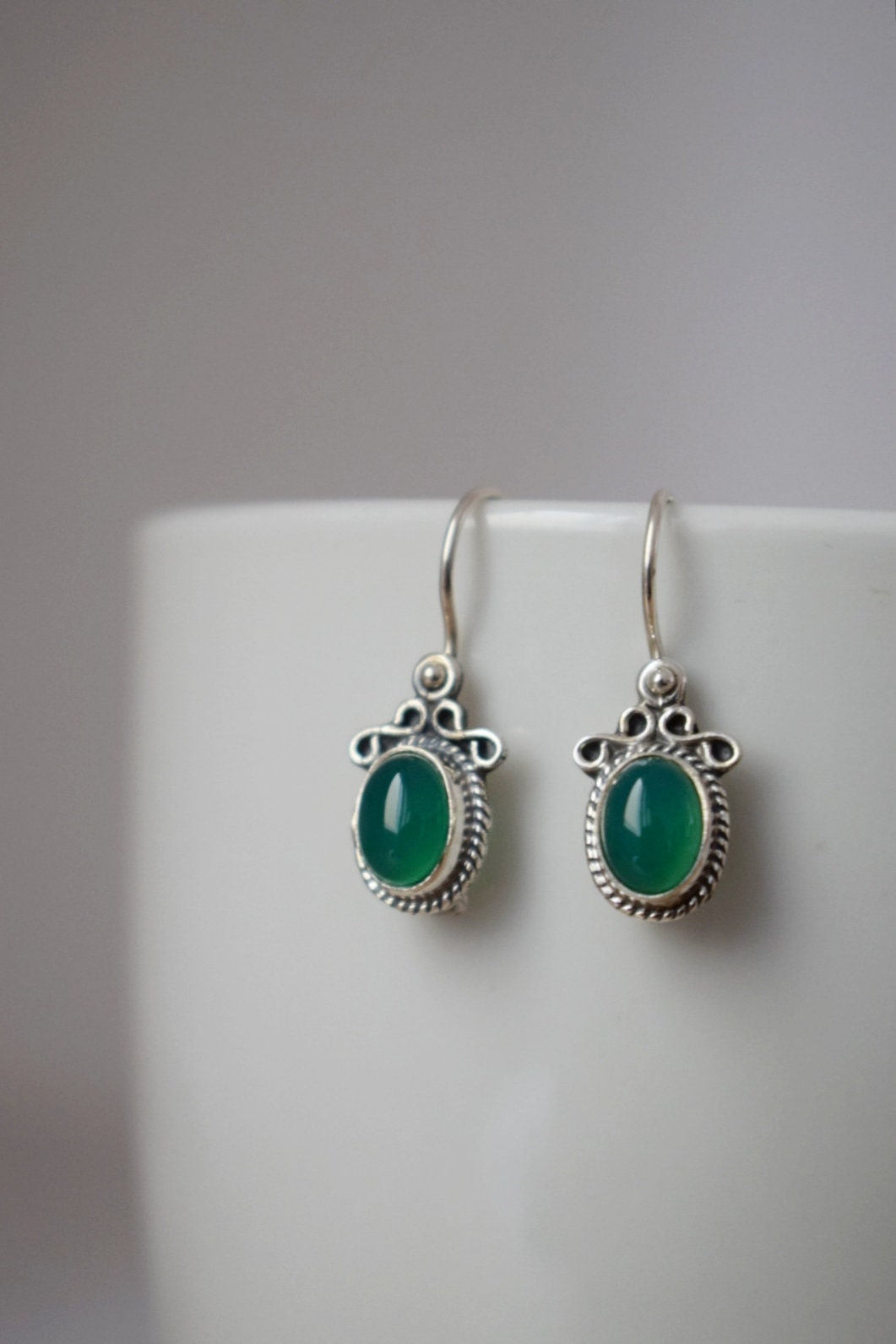 Grüne Onyxohren aus 925 Sterling Silber, Ovale Edelsteinohren, Ornamentohren, Einzigartiger Silberschmuck