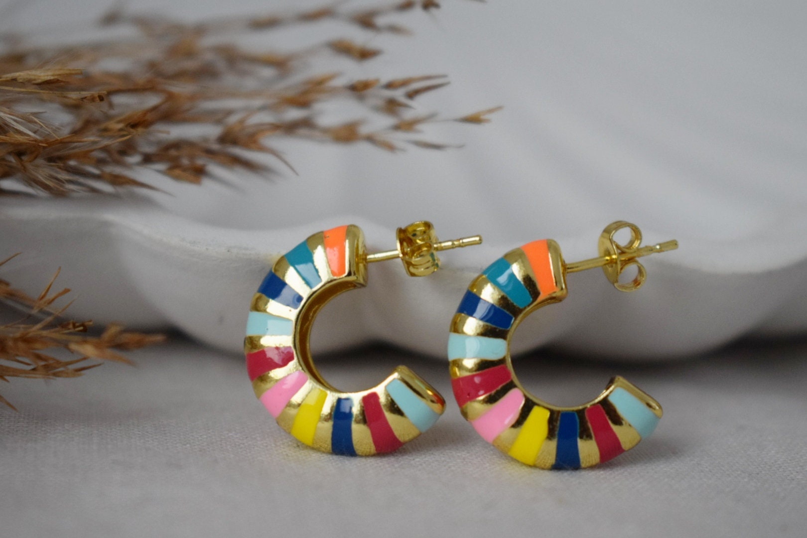 Halbe Creolen bunte Emaille Ohrstecker, Halbkreisohren, 18 Karat vergoldete C-förmige Ohren, Statement Chunky Creolen, Modern, Geschenk für Frauen