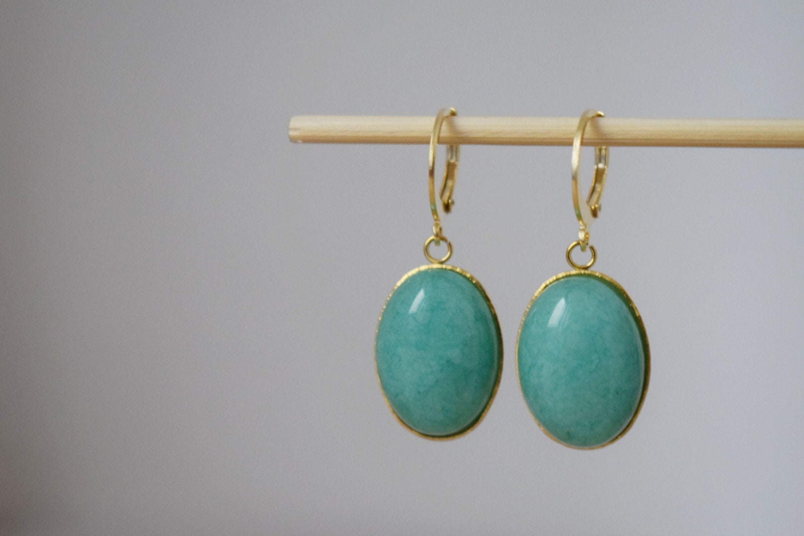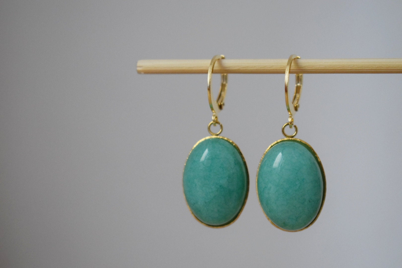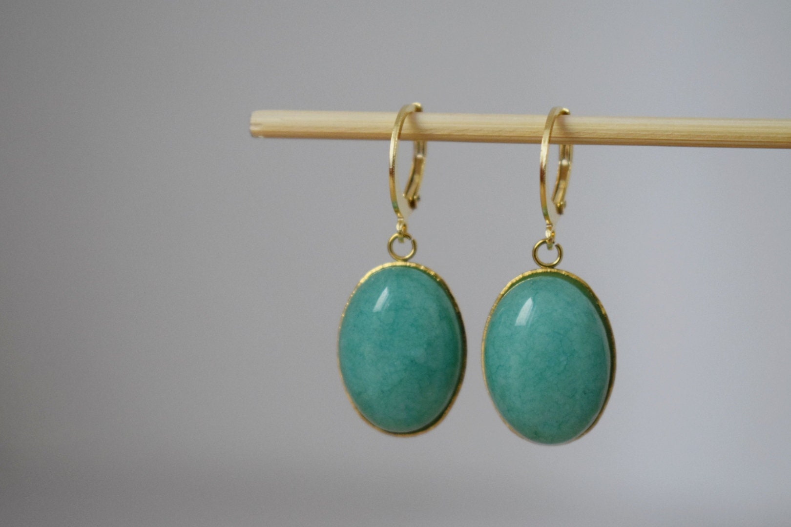 Huggie Creolen mit türkiser Jade, ovaler Steinanhänger, baumelnde Tropfen-Ohrringe mit Hebelverschluss, Edelstahl, kleines Schmuckgeschenk für Sie