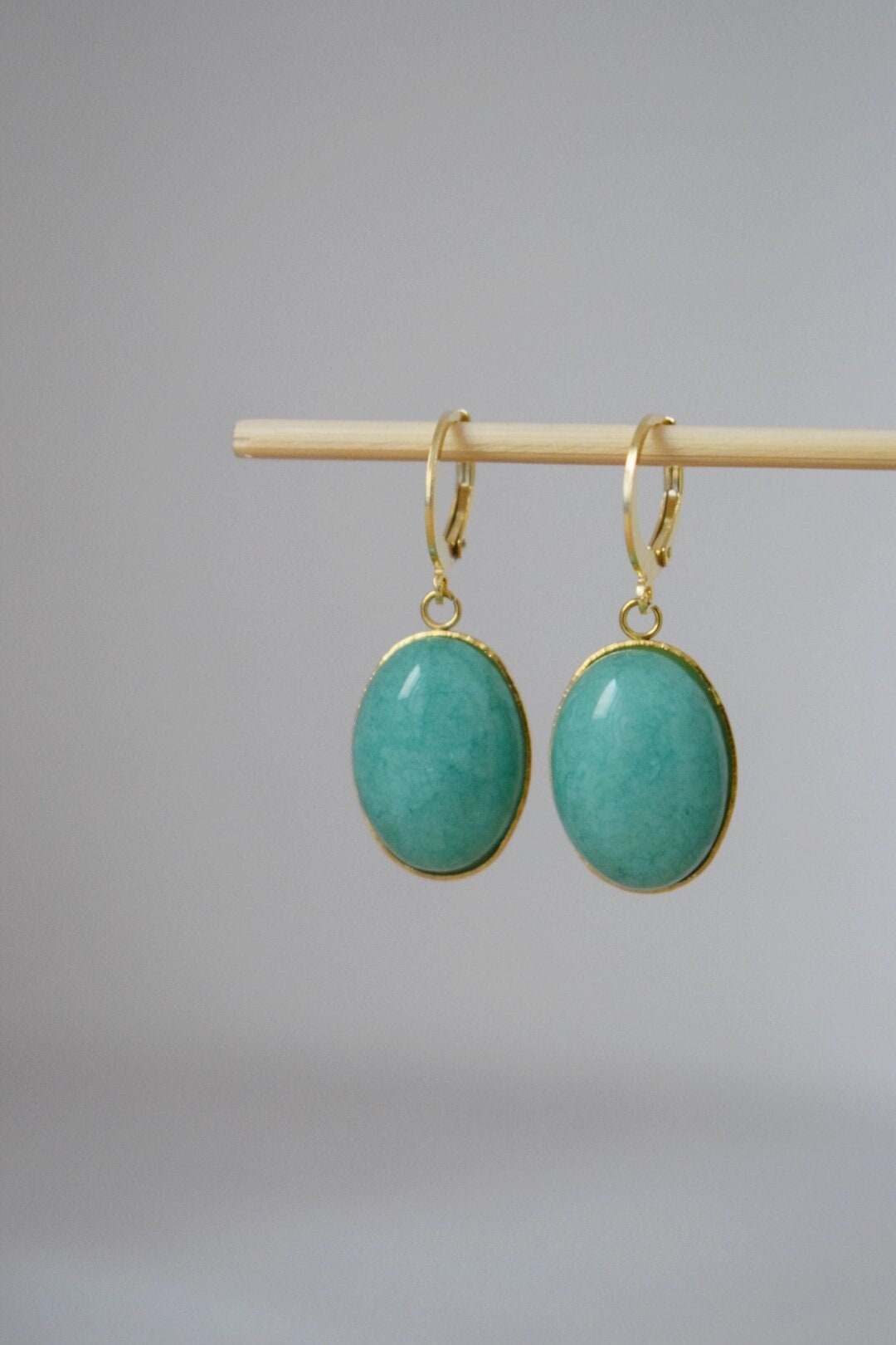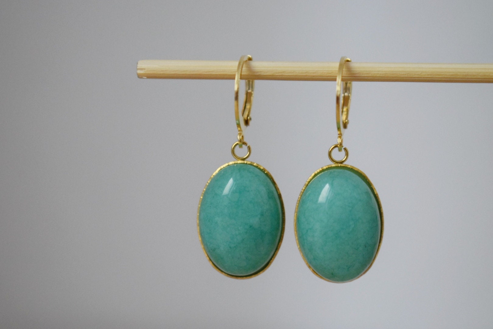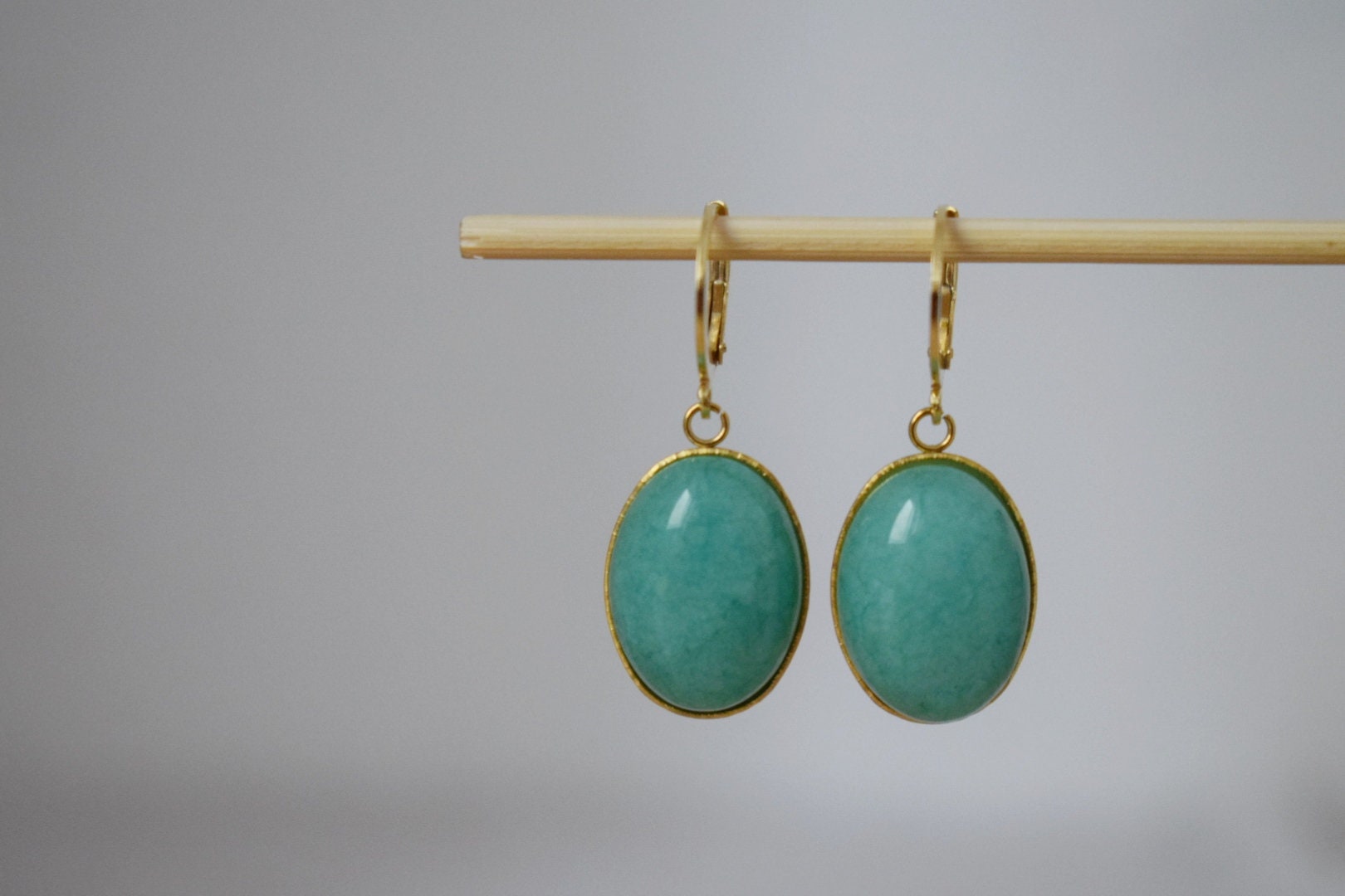 Huggie Creolen mit türkiser Jade, ovaler Steinanhänger, baumelnde Tropfen-Ohrringe mit Hebelverschluss, Edelstahl, kleines Schmuckgeschenk für Sie