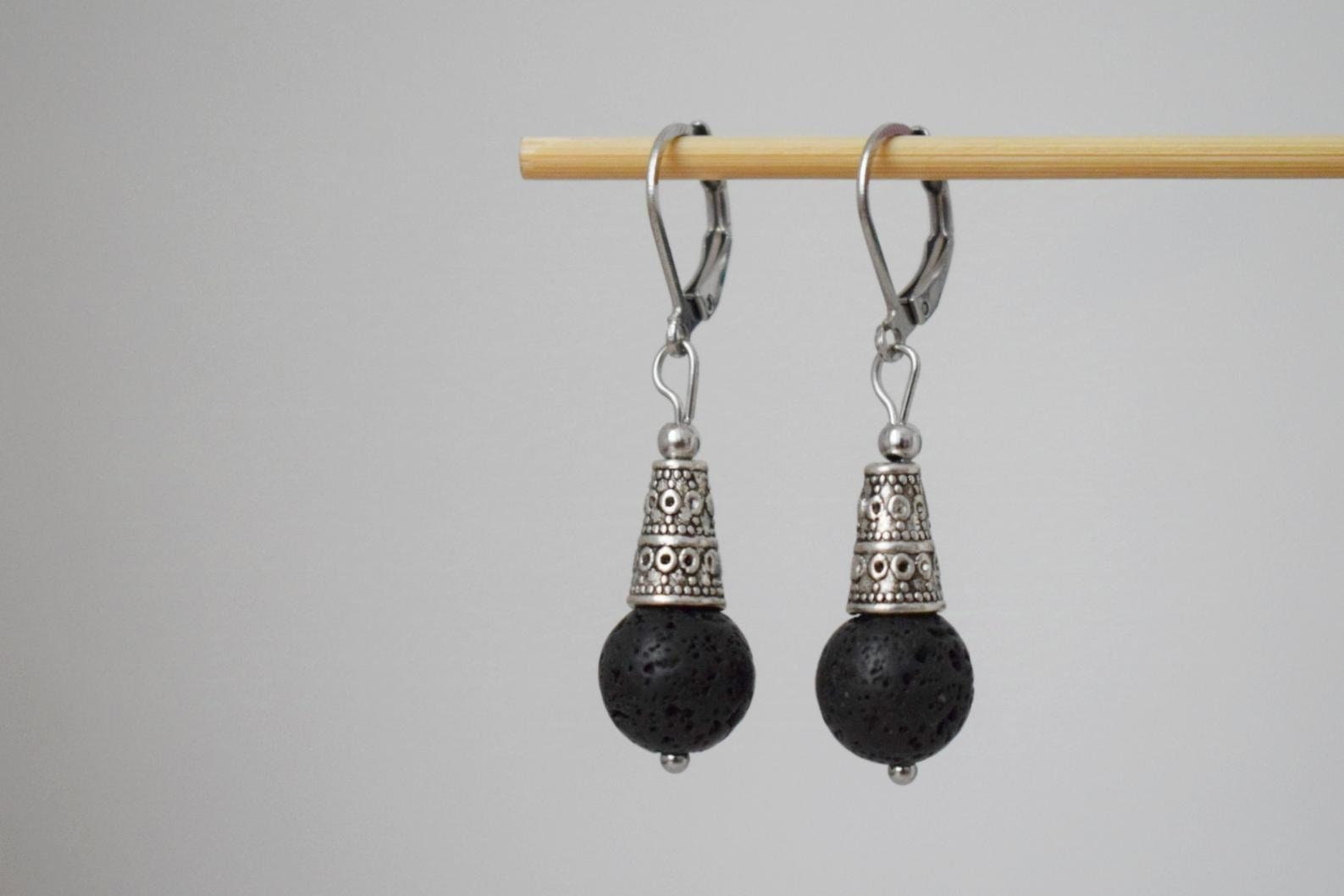 Ohrringe aus Lavasteinperlen silber, Huggie-Creolen aus schwarzen Edelsteinen, Boho-Ohrringe, Lavastein, Diffusor-Schmuck, ätherisches Öl, einzigartiges Geschenk für Sie