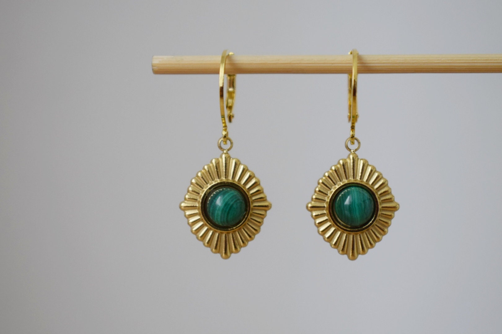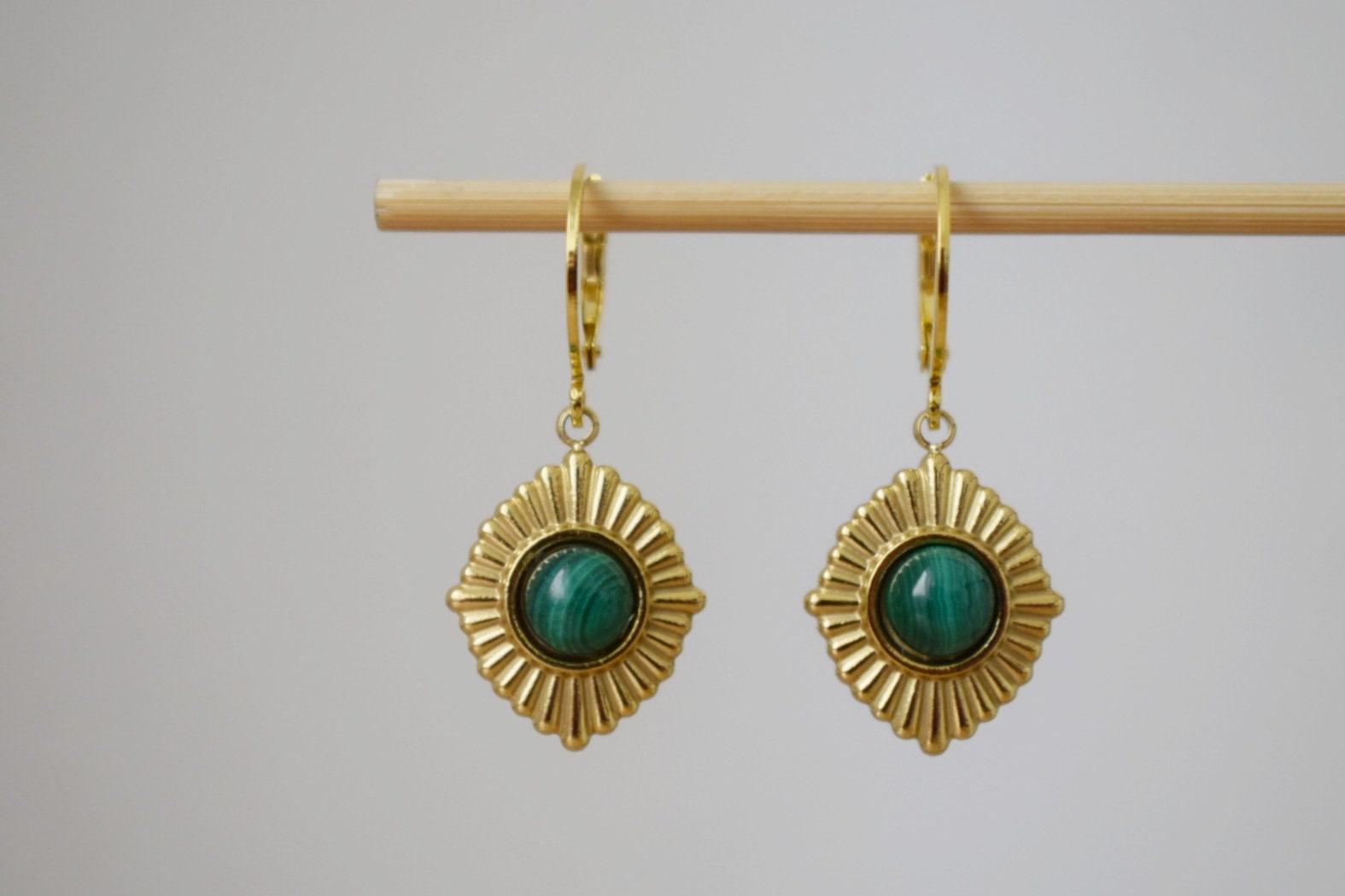 Malachit Ohrringe, Ornament baumelnde Ohrringe, Edelstein Huggie Creolen, Grüner Naturstein, Art Deco Schmuck, Einzigartiges Geschenk für Sie