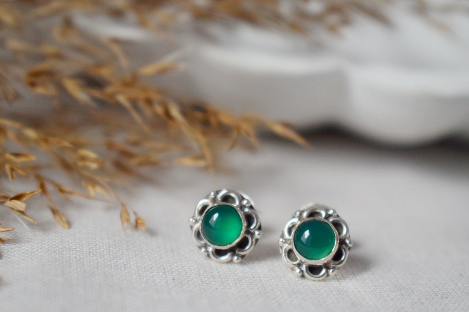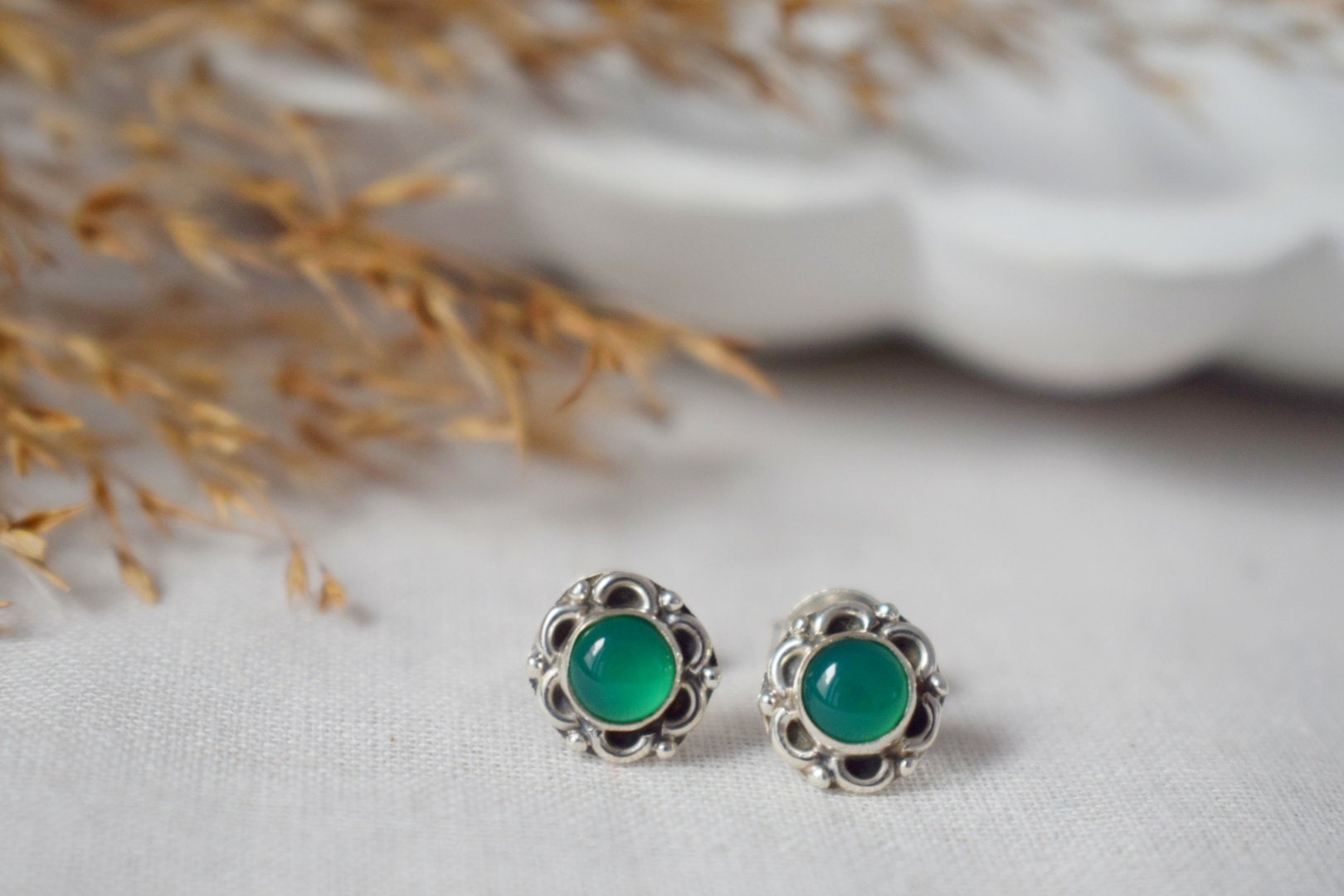 Muttertagsgeschenke, Grüne Onyx Ohrstecker, Edelstein Sterling Silber Minimalistischer Schmuck, Blume Kleine Geburtsstein Push Back Ohrringe