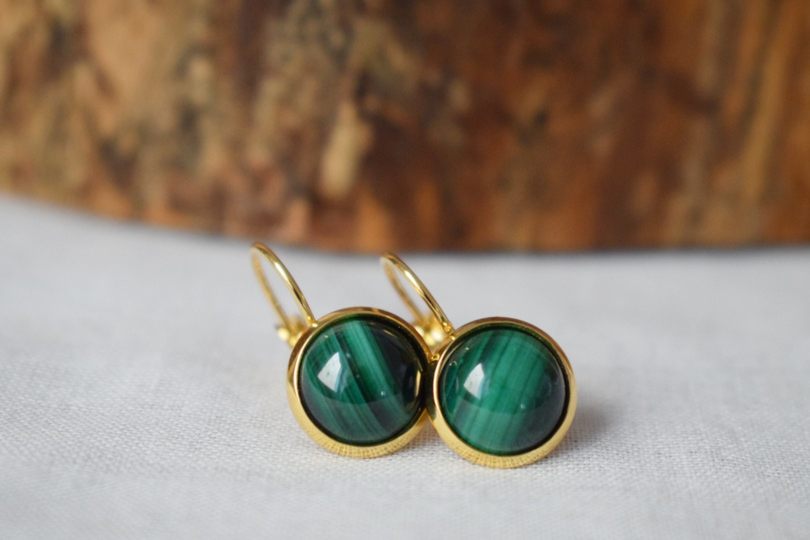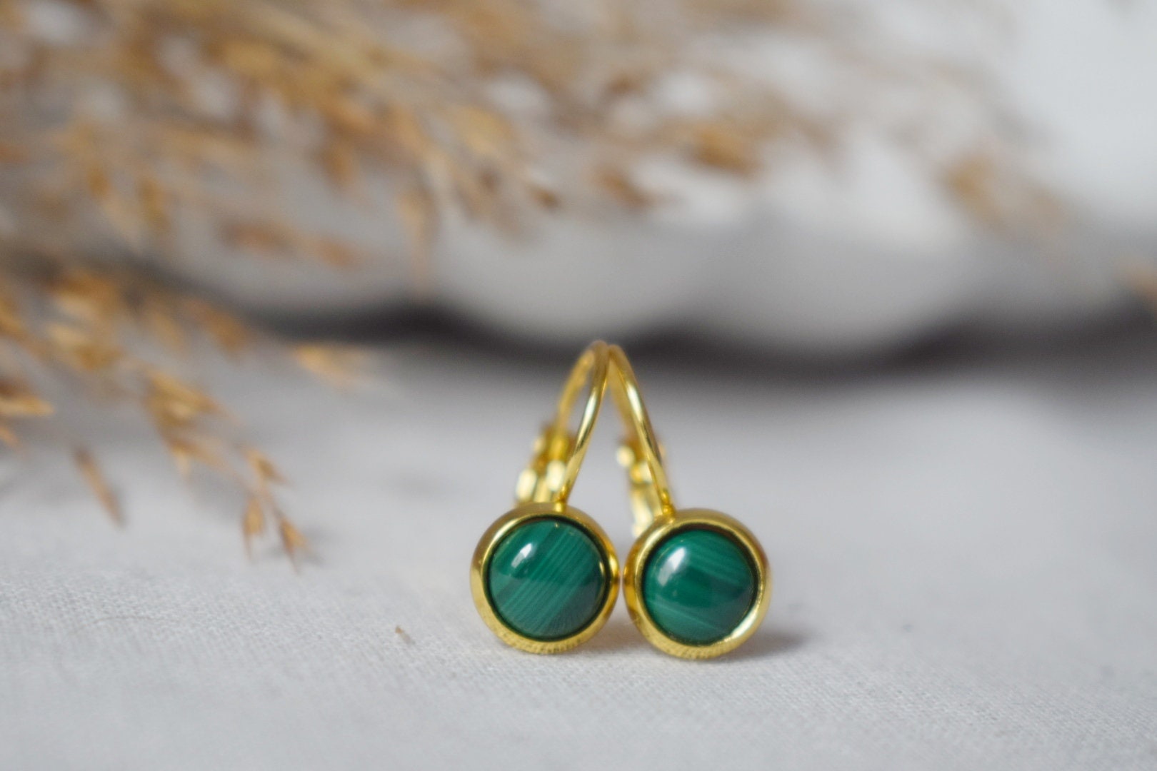 Natürliche Malachit-Ohrringe Gold, 10 mm Ohrhänger, klein, minimalistisch, grüner Edelstein, Hebelverschluss, Malachit-Schmuck, Geburtsstein-Ohrringe