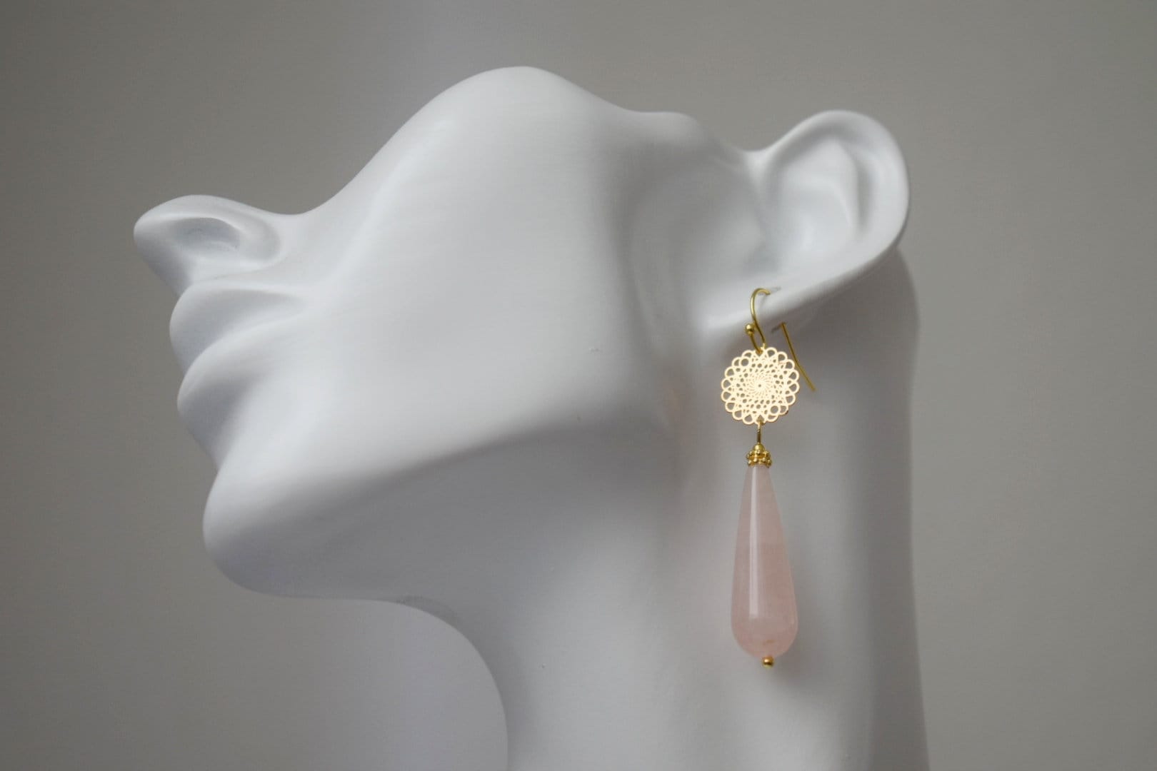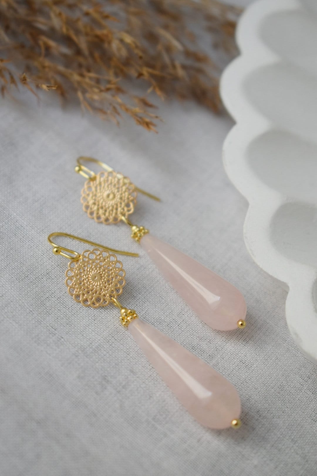 Natürliche Rosenquarz Ohrhänger gold, Lange Tropfenohren, Mandala, Edelstein Tropfenohren, Hochzeitsohren, Rosenquarz Schmuck