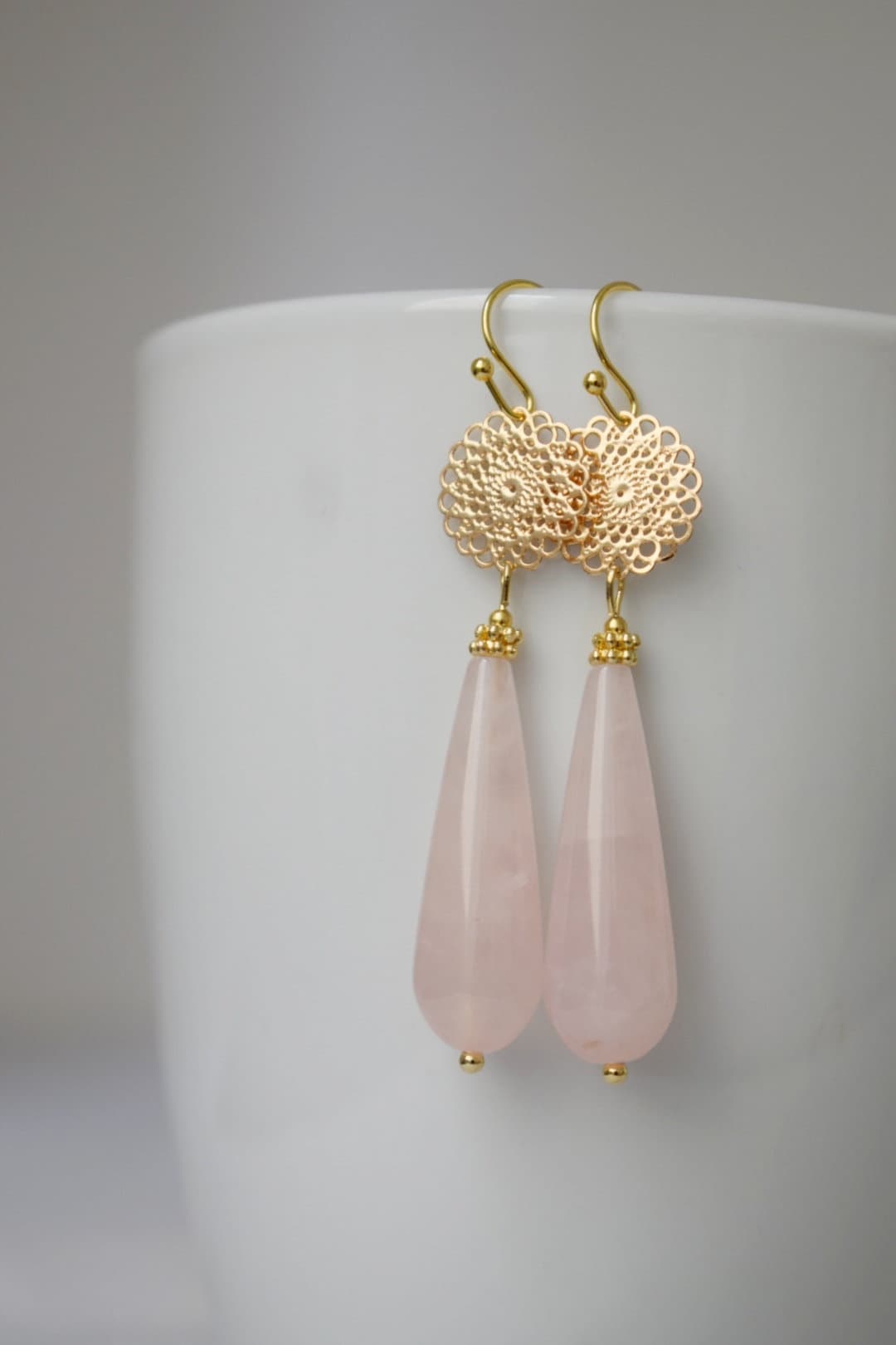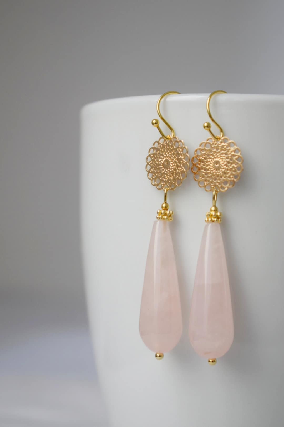 Natürliche Rosenquarz Ohrringe Gold, Lange Tropfen Ohrringe, Mandala, Edelstein Tropfen Ohrringe, Hochzeit Ohrringe, Rosenquarz Schmuck