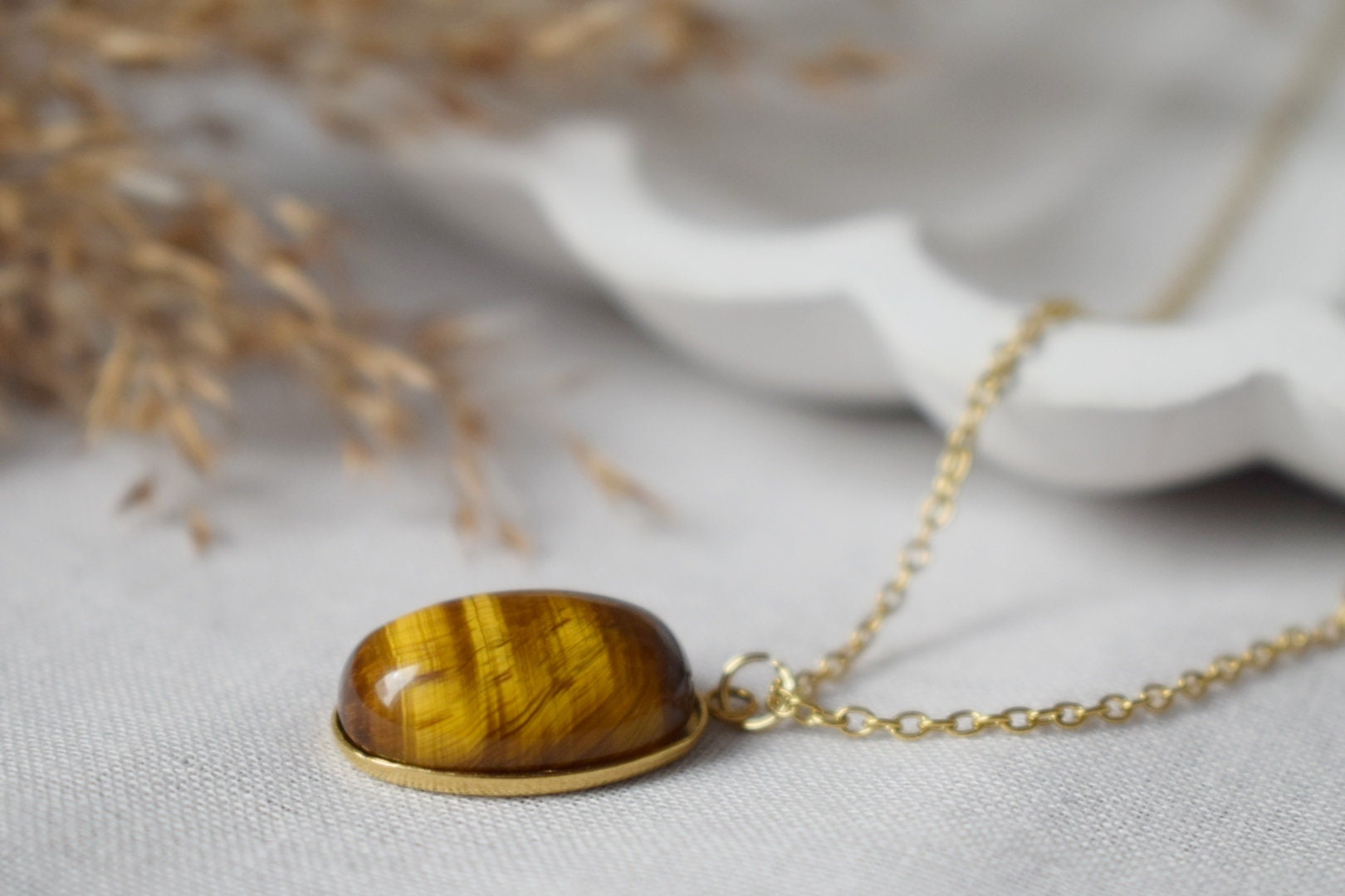 Halskette Ovaler Tigerauge Edelstein Anhänger, Tigerauge vergoldeter Edelstahl Schmuck, Langer Braungold Geburtsstein, Weihnachtsgeschenk für Sie