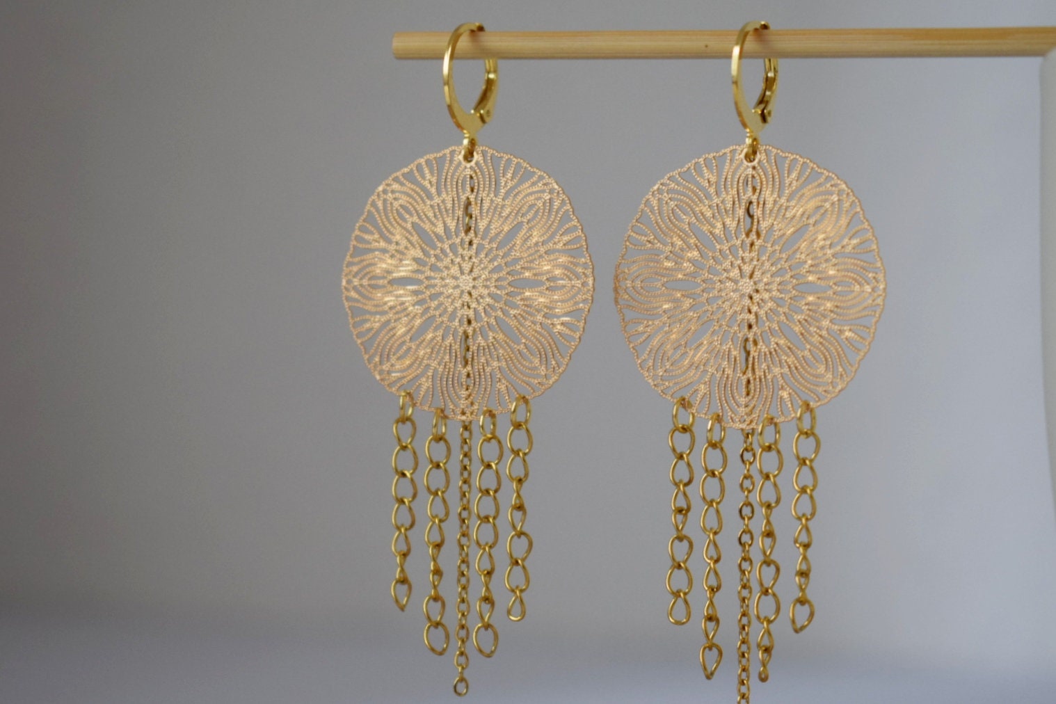 Ornament-Ohrringe für Frauen, goldene Mandala-Ohrringe, Edelstahl-Kettenohrringe, lange filigrane Boho-Ohrringe, Mandala-Schmuck als Geschenk für Sie
