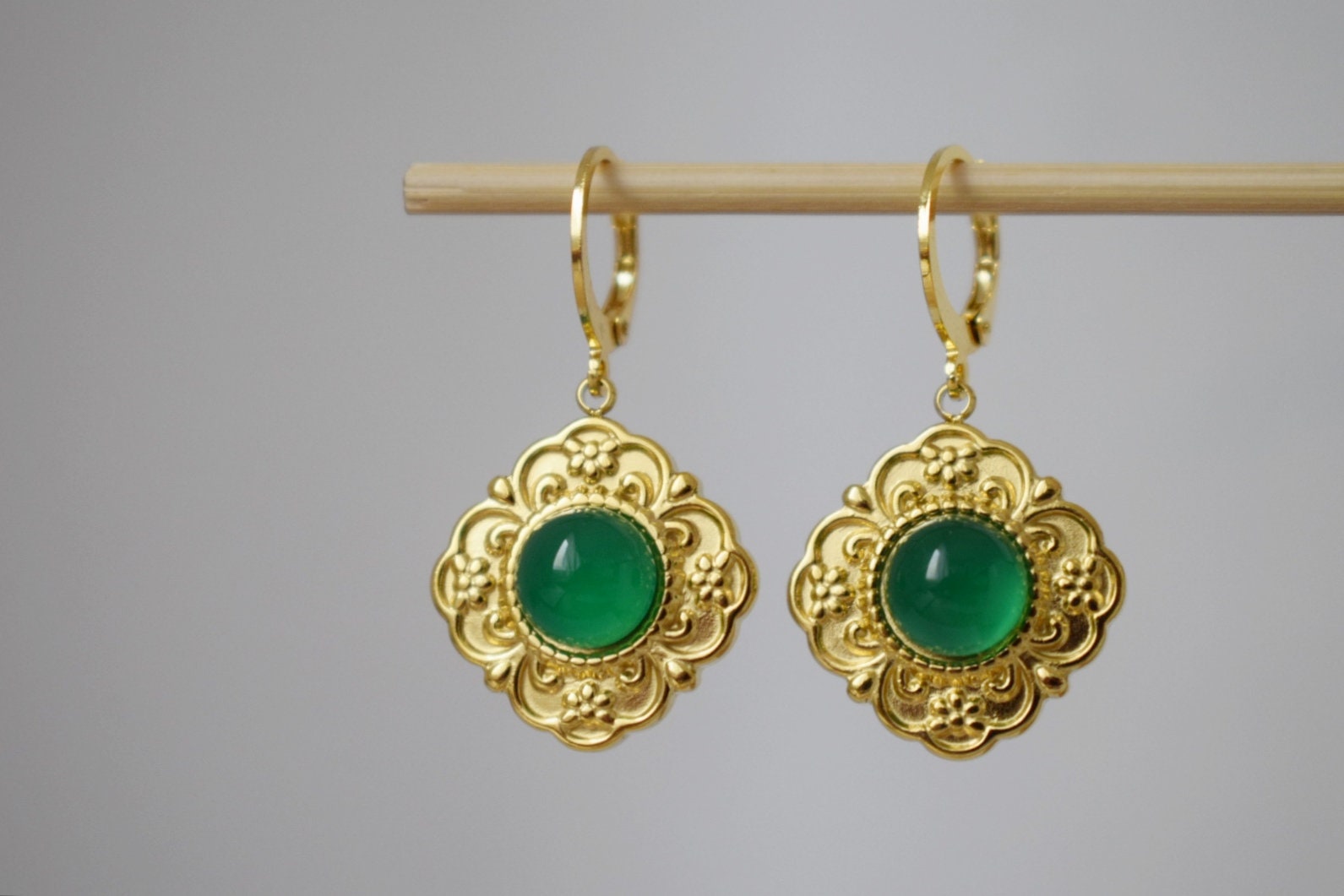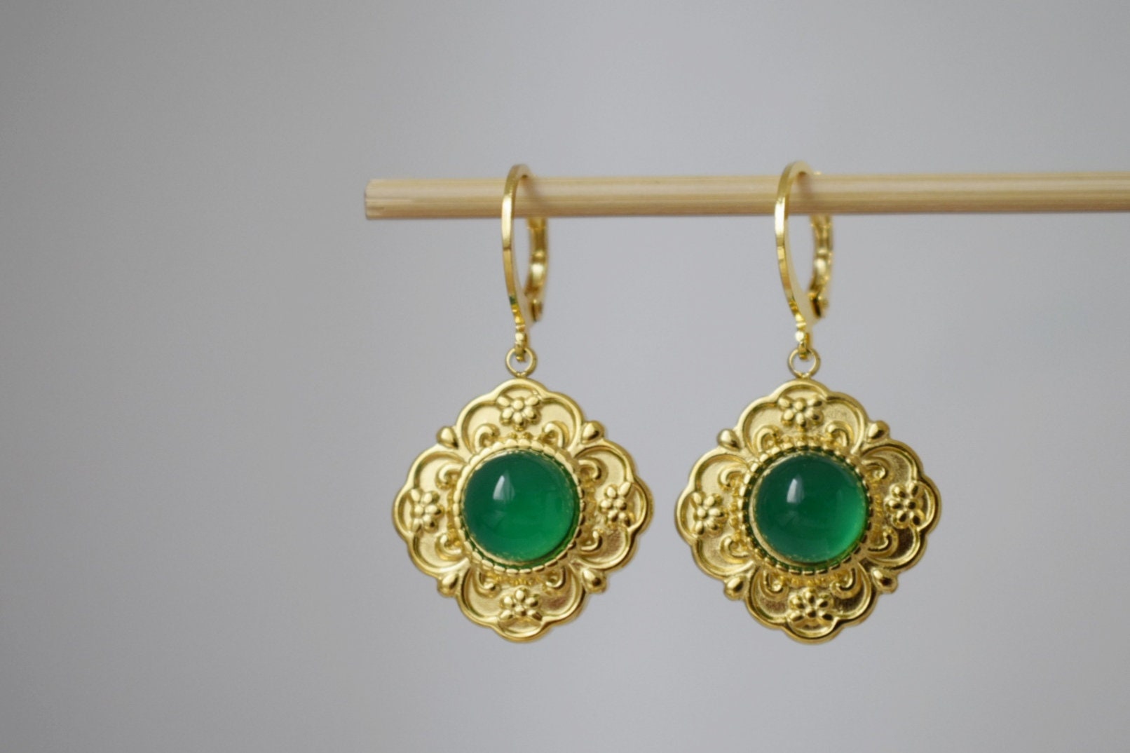 Ornamentale grüne Achat Ohrringe, Blumen baumelnde Ohrringe, Edelstein Huggie Creolen, Naturstein, handgefertigter Schmuck Geschenk für Sie