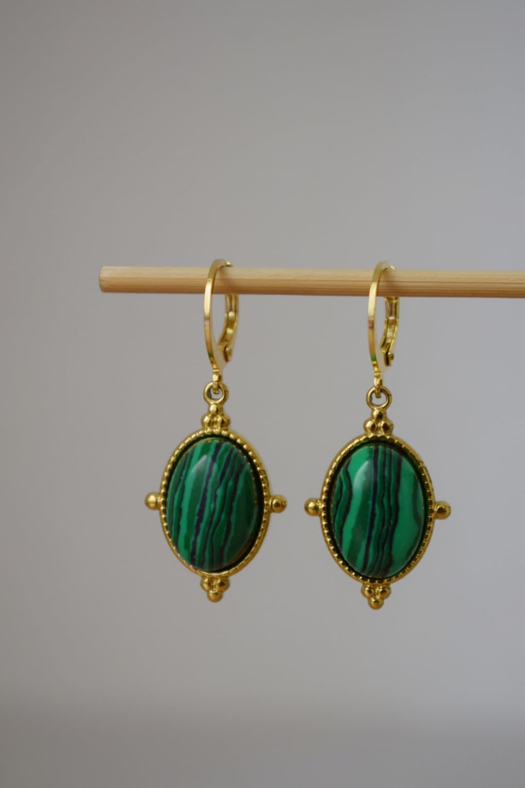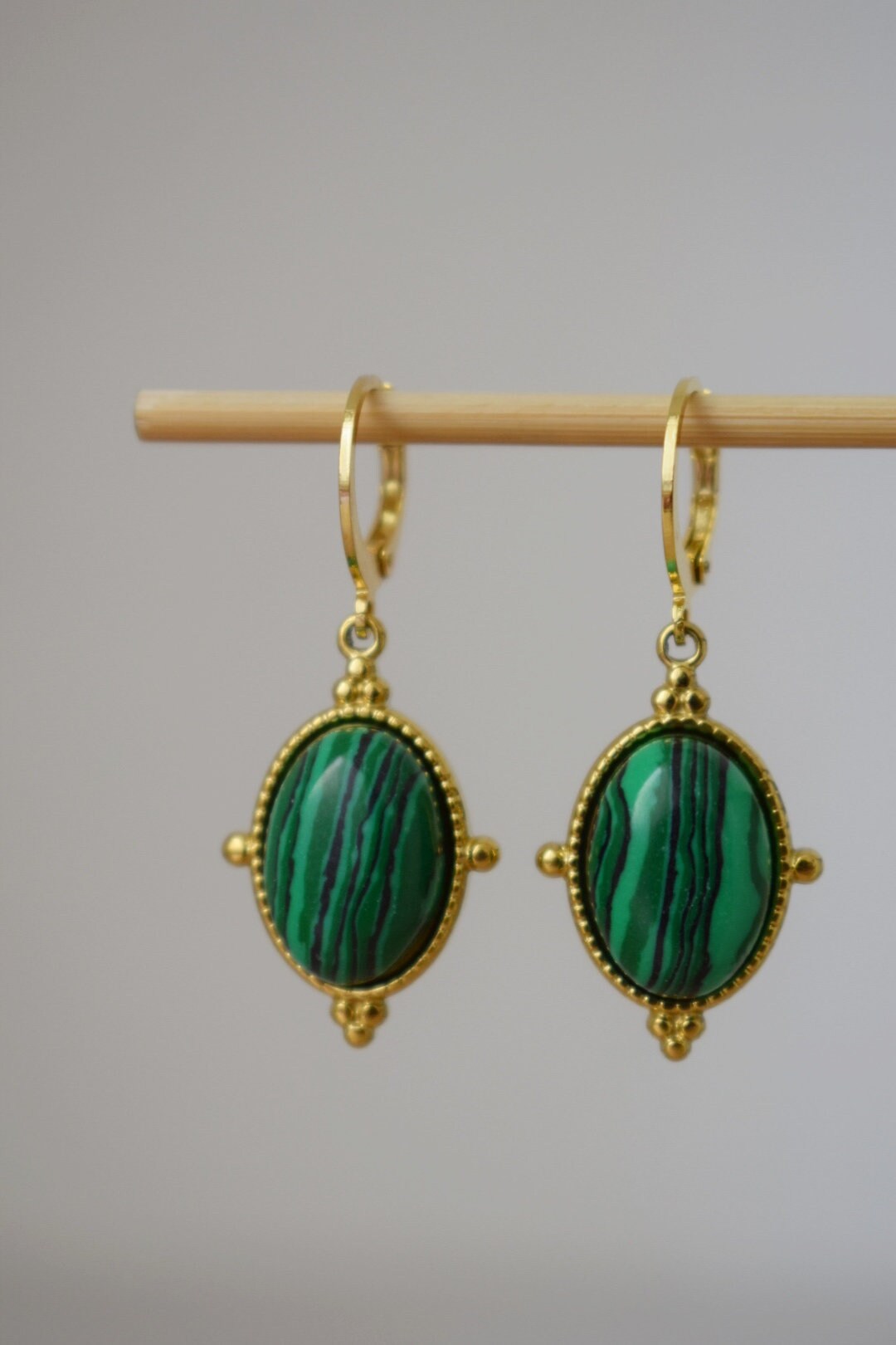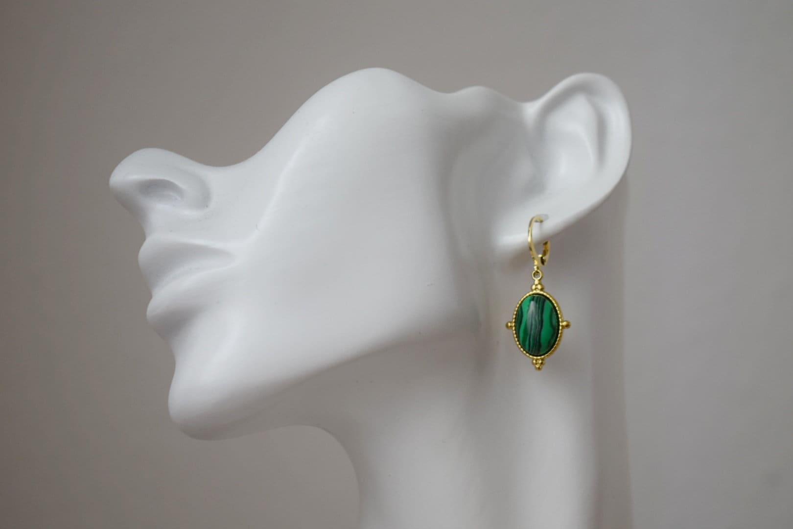 Ornament Malachit Huggie Ohrringe, Grüne Edelstein Ohrringe, Boho Chic Creolen, Einzigartiges Schmuckgeschenk für sie, Muttertagsgeschenk