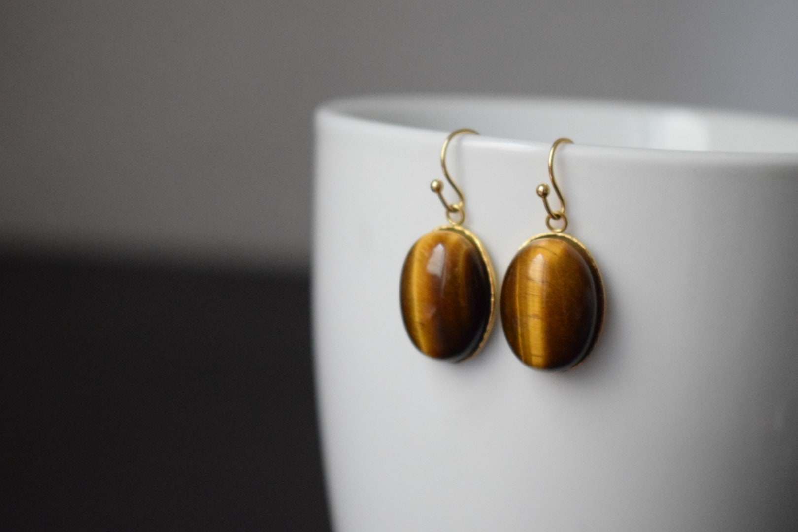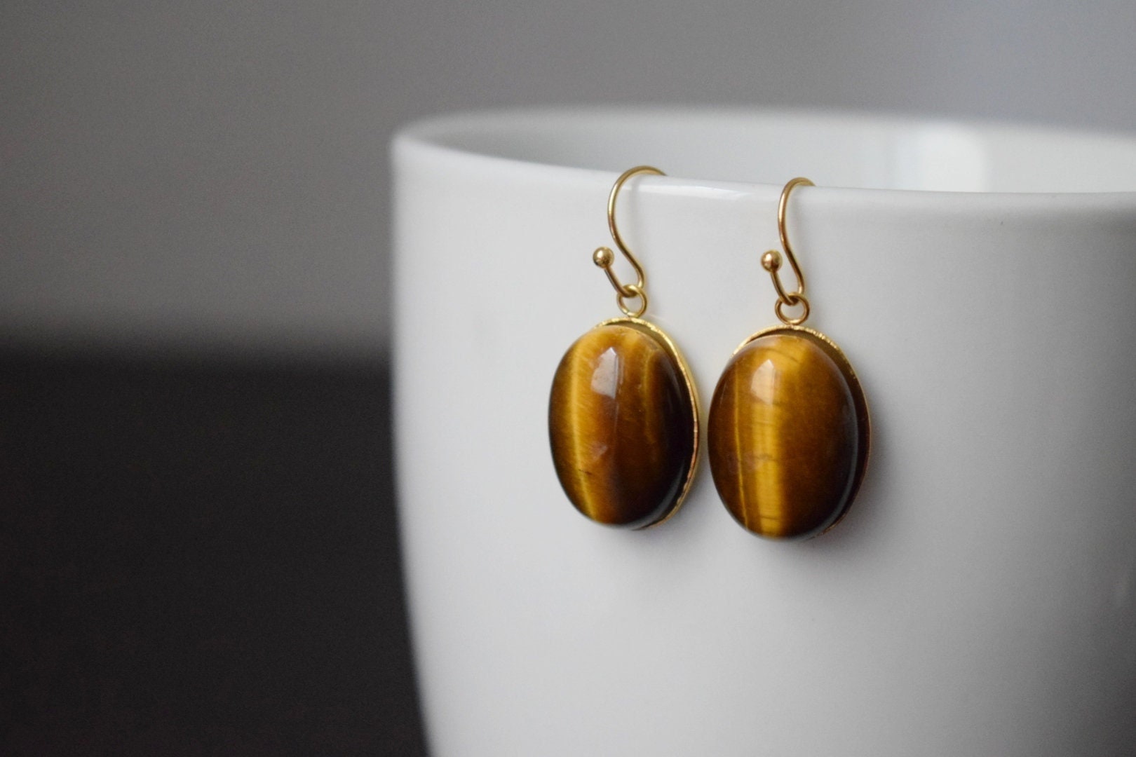 Ovale Tigerauge Ohrringe Gold, Edelstein Ohrhänger, Goldbraune Stein Hängeohrringe, Chakra, Heilstein, Tigerauge Schmuck, Geschenk