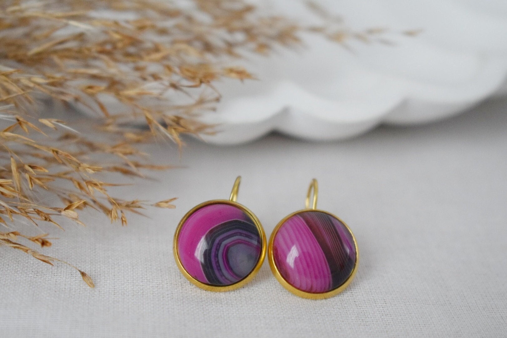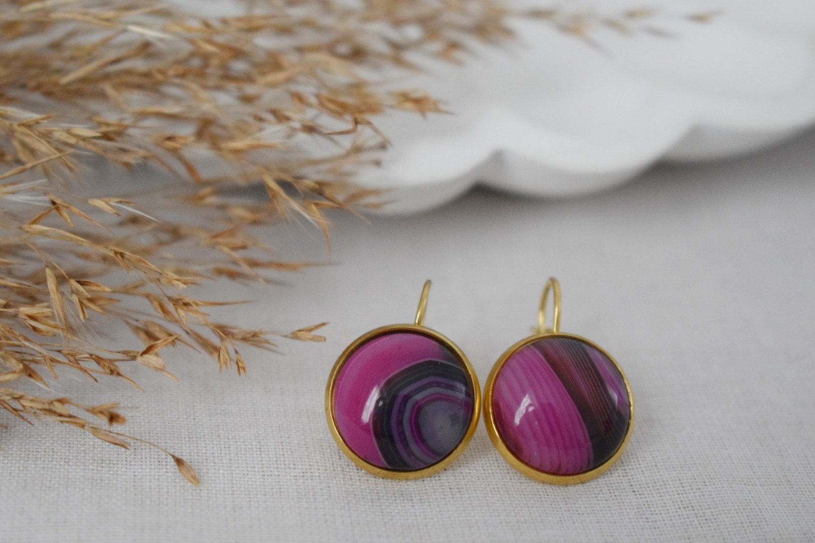 Rosa Ohrringe mit Achatband, Edelstein-Ohrringe mit Hebelverschluss, Rosa Gold, Edelstahl, Stein-Ohrhänger, Einzigartiger Schmuck, Geschenk für Sie