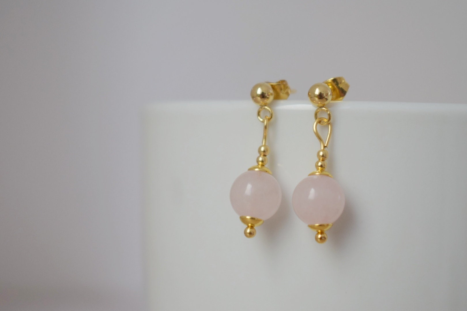 Rosenquarz Ohrstecker, Edelstein Perlen Anhänger, 24k vergoldete Edelstahl Push Back Ohrringe, Rosenquarz Schmuck, Handgemachtes Geschenk