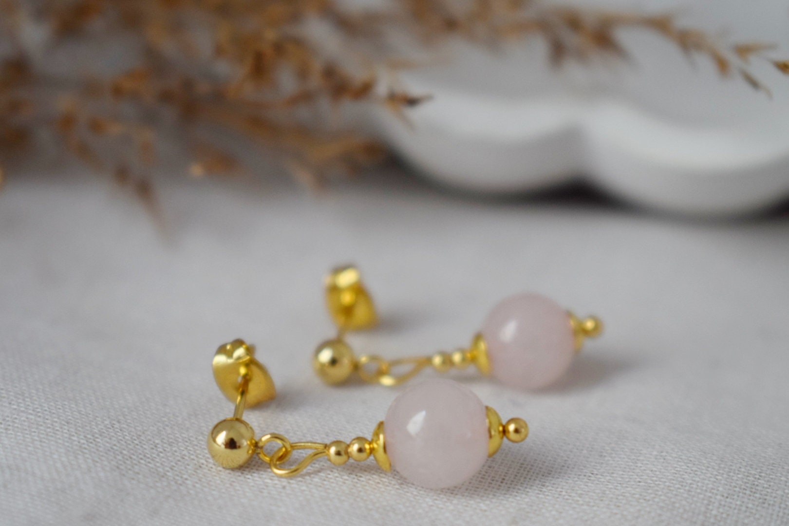 Rosenquarz Ohrstecker, Edelstein Perlen Anhänger, 24k vergoldete Edelstahl Push Back Ohren, Rosenquarz Schmuck, Handgemachtes Geschenk