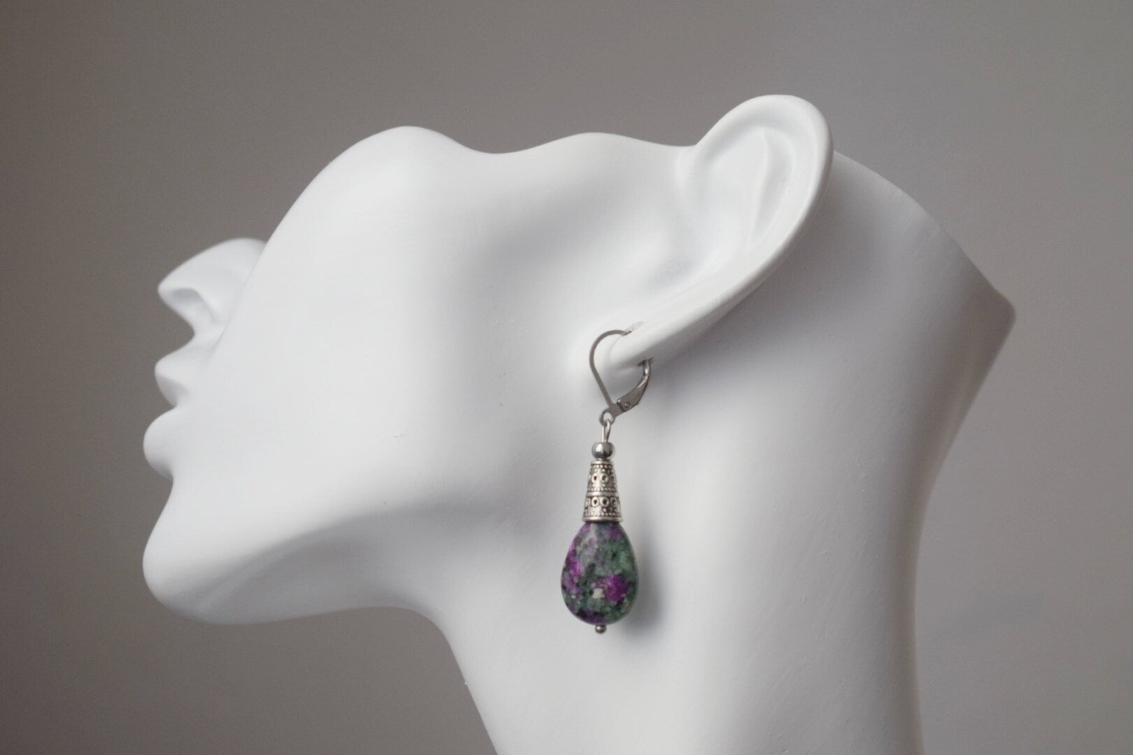 Creolen mit Rubin in Zoisit, Perlen-Ohrringe in Tropfenform, baumelnde Ohrringe aus Edelstahl mit Edelsteinen, Grün, Rosa, Silber, Rubin-Fuchsit-Schmuck