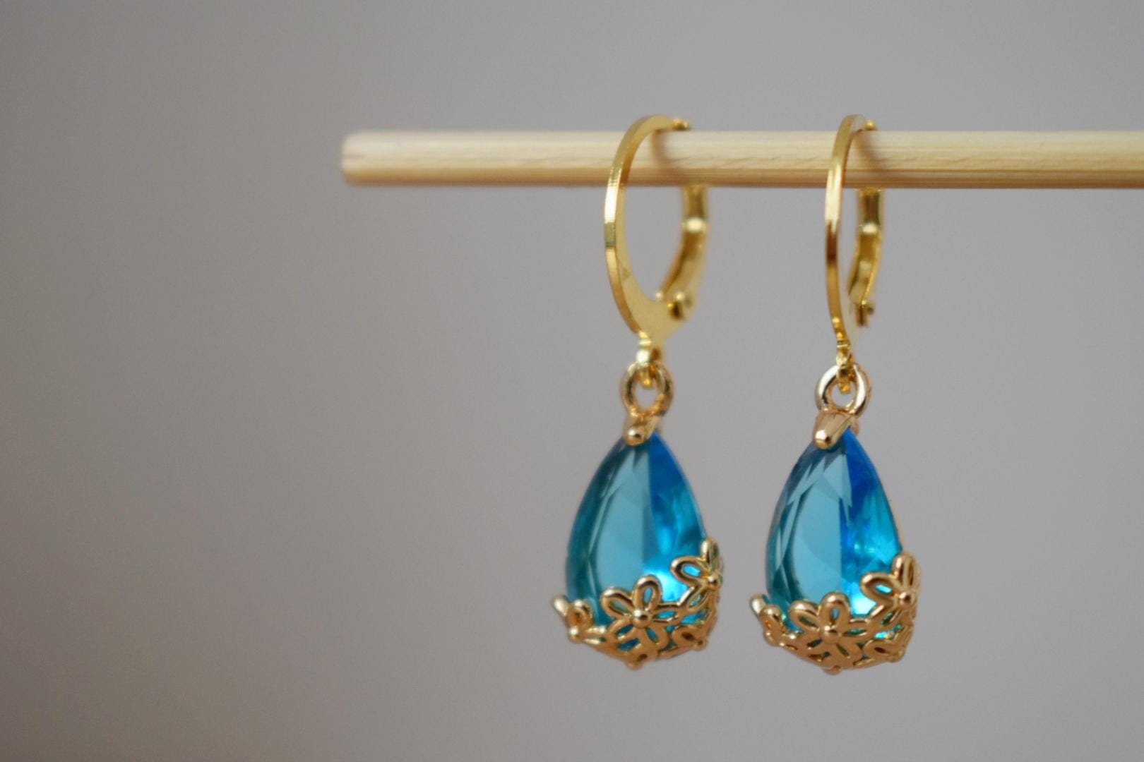 Himmelblaue Strass-Tropfenohrringe mit 24 Karat vergoldeten Edelstahl-Huggie-Creolen, minimalistischer Ornamentschmuck