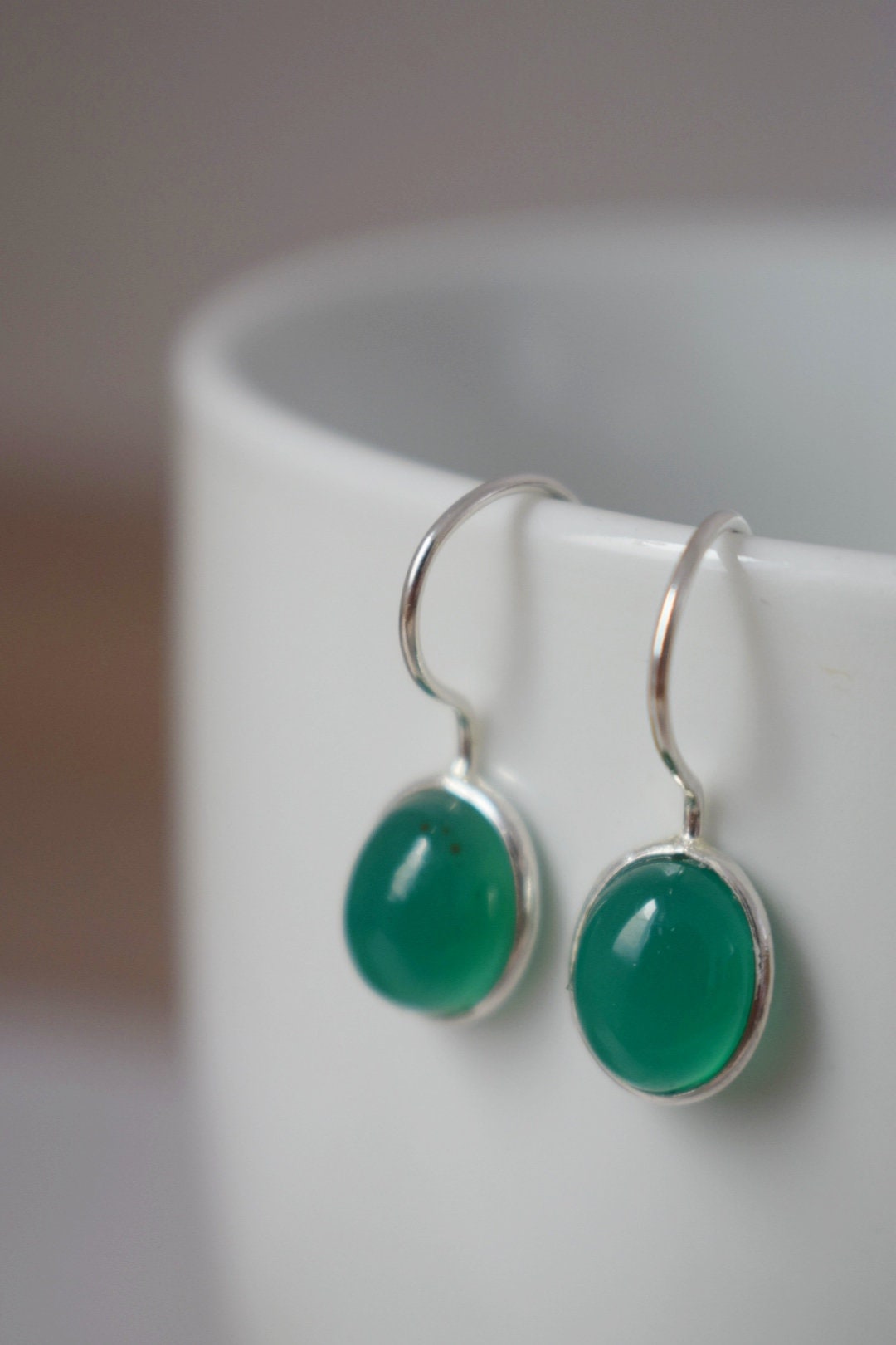 Kleine grüne Onyxohrringe aus 925 Sterling Silber, Ovaler Edelstein Unikatschmuck