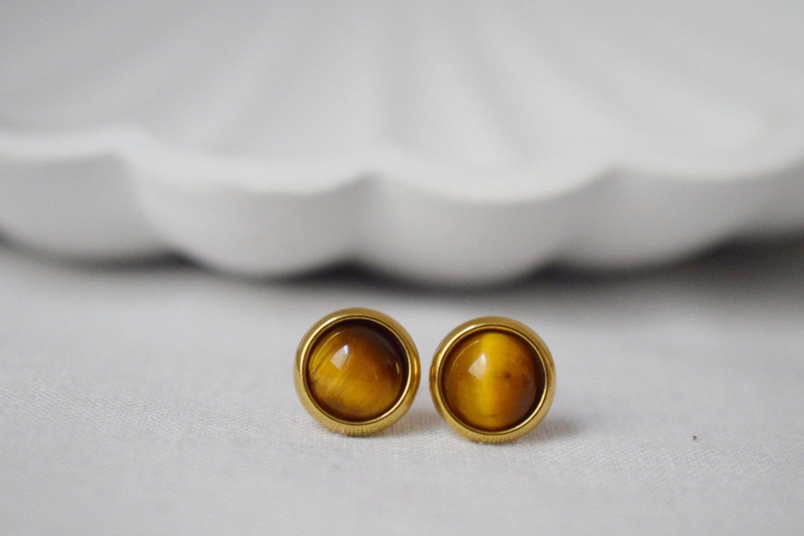 Kleine Tigerauge Ohrstecker Gold, Edelstein 8mm Ohrstecker, Minimalistische Tigerauge Ohrringe, Brauner Stein, Geschenk Tigerauge Chakra Schmuck