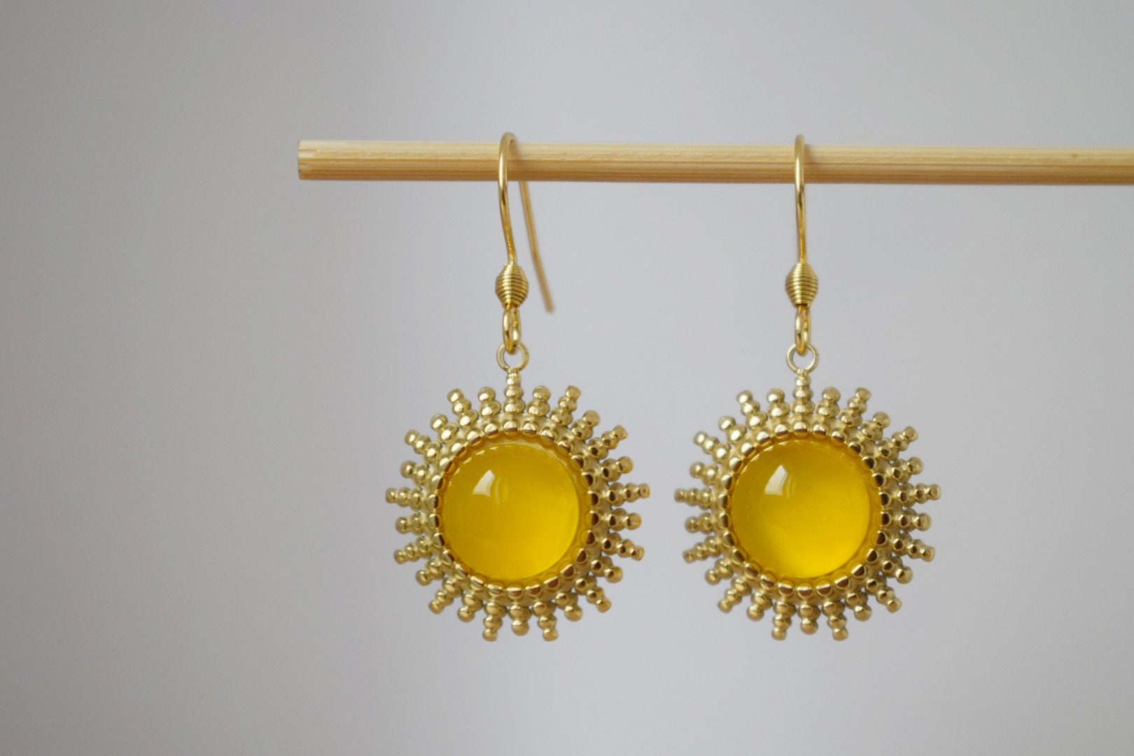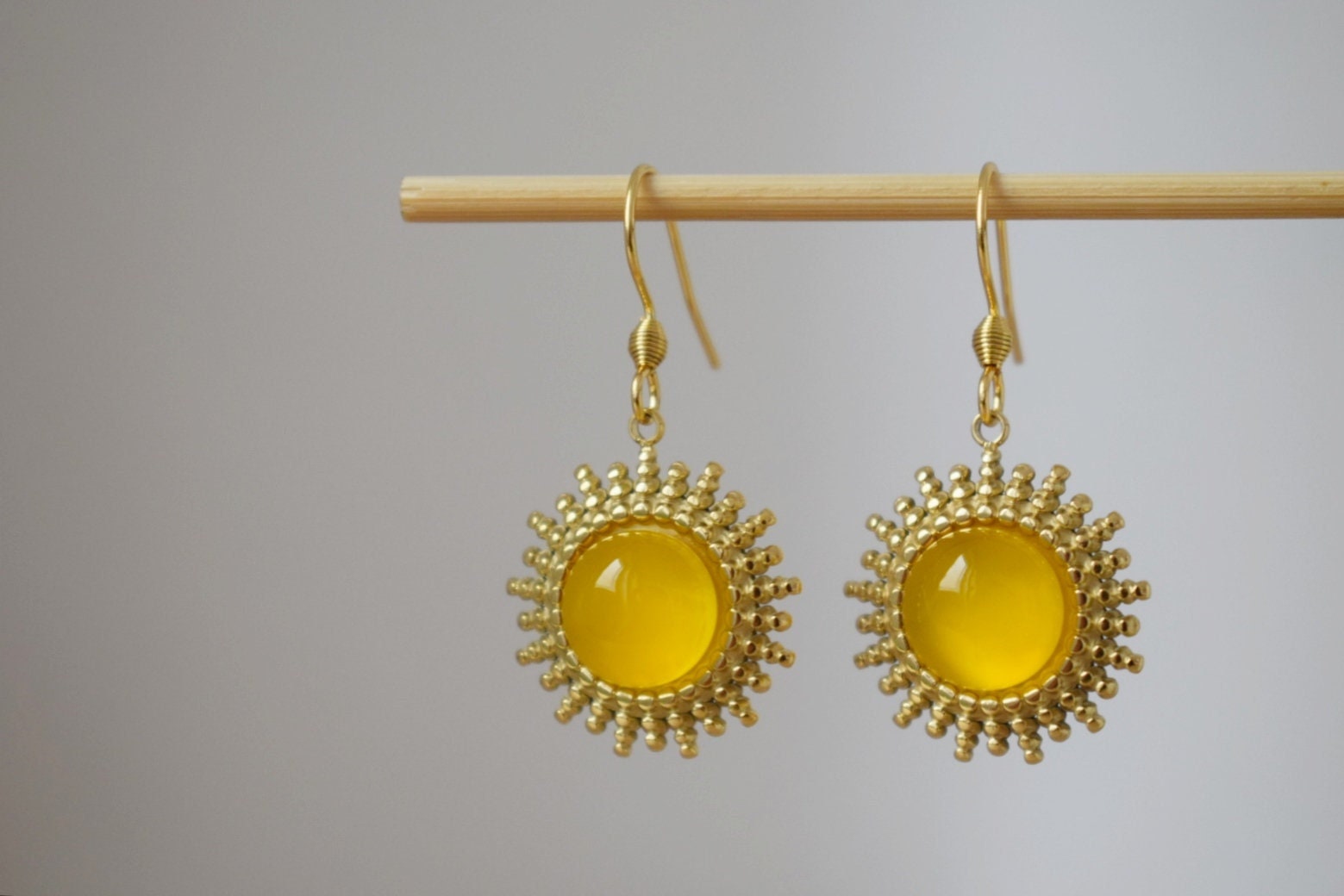 Sonnenohrringe Gold, Gelbe Achatohrringe, Sonnenstrahlenohrringe, Sunburst, Edelsteinohrringe, Himmlischer, leuchtender Schmuck, Geschenk für Sie
