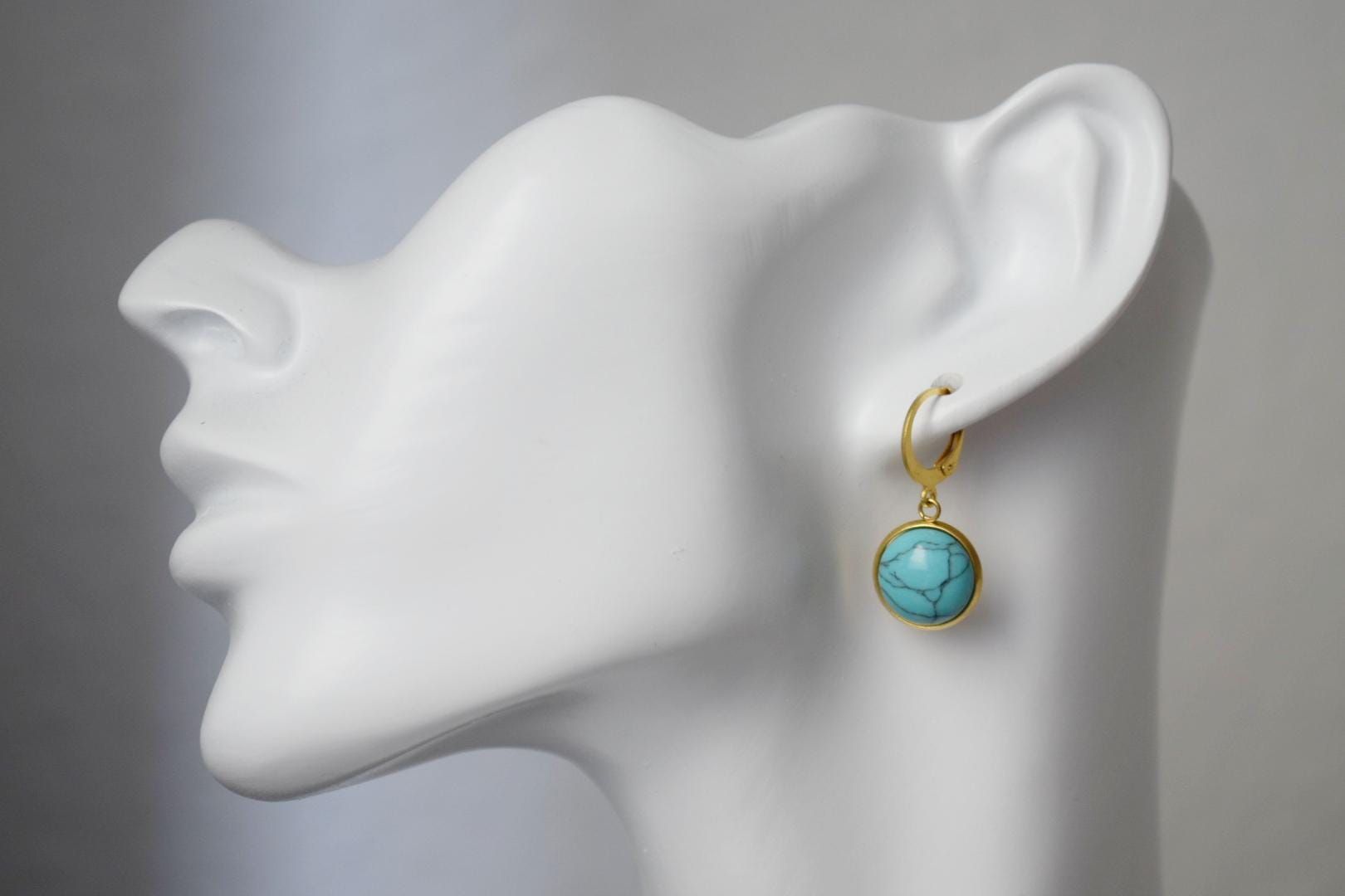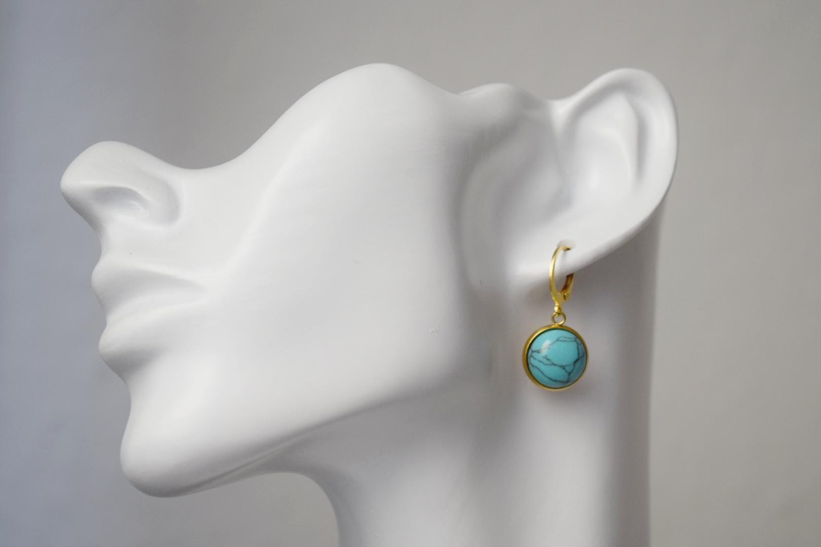 Türkisfarbene Ohren, Goldohren, Huggie-Ohren, Runde Edelstein-Hängeohren, Lever Back Hoop-Ohren, Türkisschmuck, Geschenk für Sie