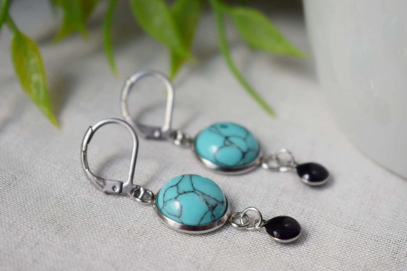 Türkise Ohrringe, Blaue Edelstein Ohrringe, Boho Ohrringe, Schwarze Emaille Anhänger Ohrringe, Schmuck Geschenk für Frauen