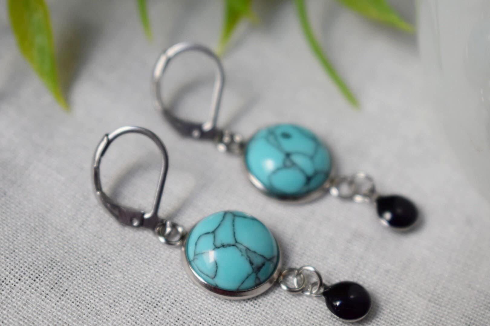 Synthetische Türkis-Cabochons, Schmuckkleber Synthetische Türkis-Cabochons, Schmuckkleber. Hochwertiger Anhänger aus Edelstahl. Hochwertige Edelstahlanhänger mit schwarzer Emaille, beidseitig emailliert, Creolen mit Hebelverschluss, chirurgischer Edelstahl 316, Größe 15 x 10 x 2 mmHighlights