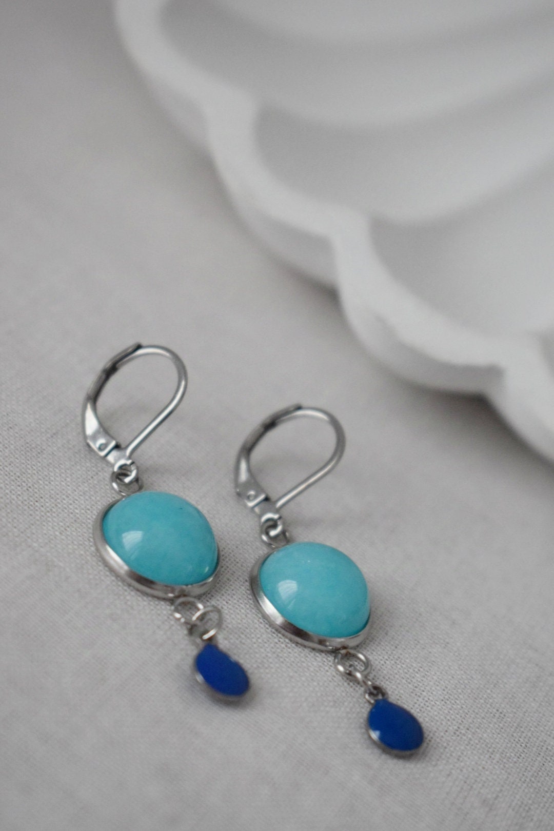 Handgefertigte wunderschöne einzigartige Ohrhänger aus türkisfarbener Jade mit Emaille-Anhänger