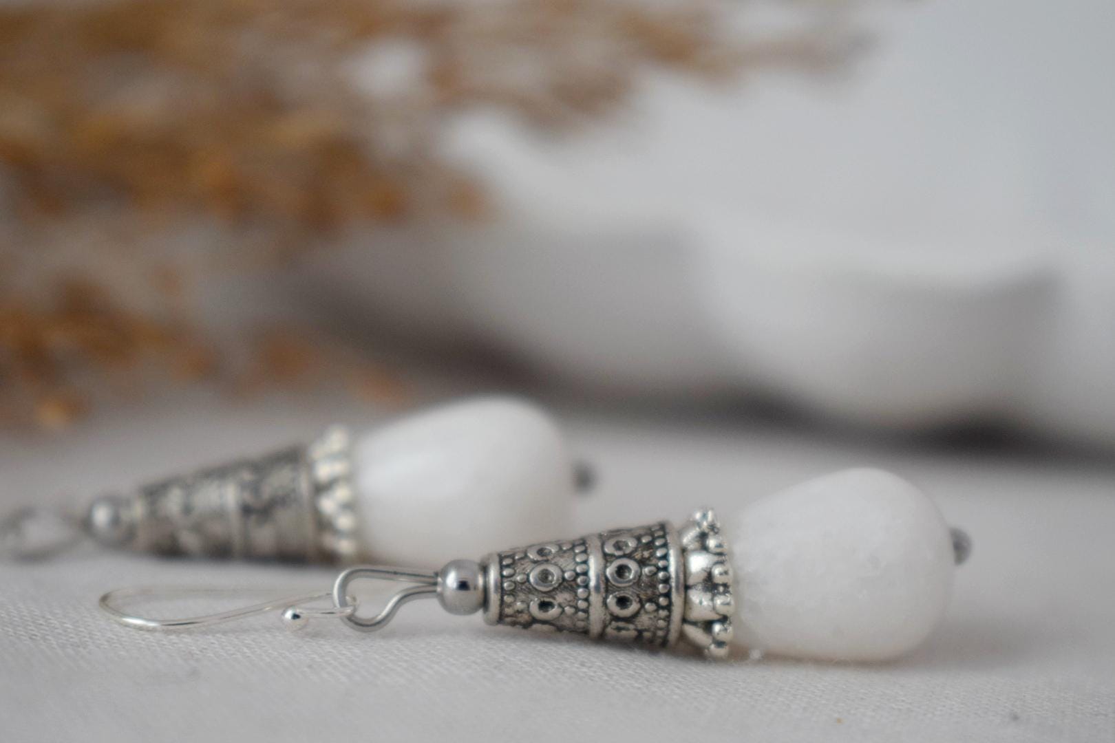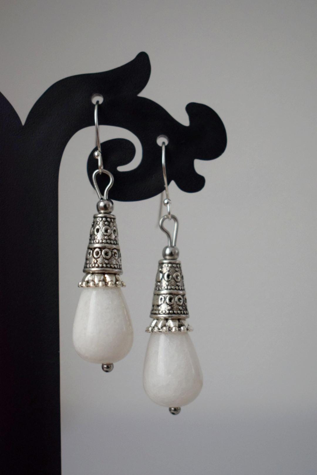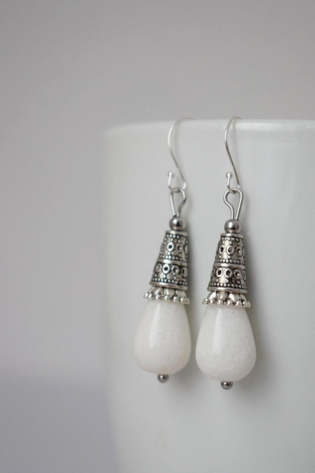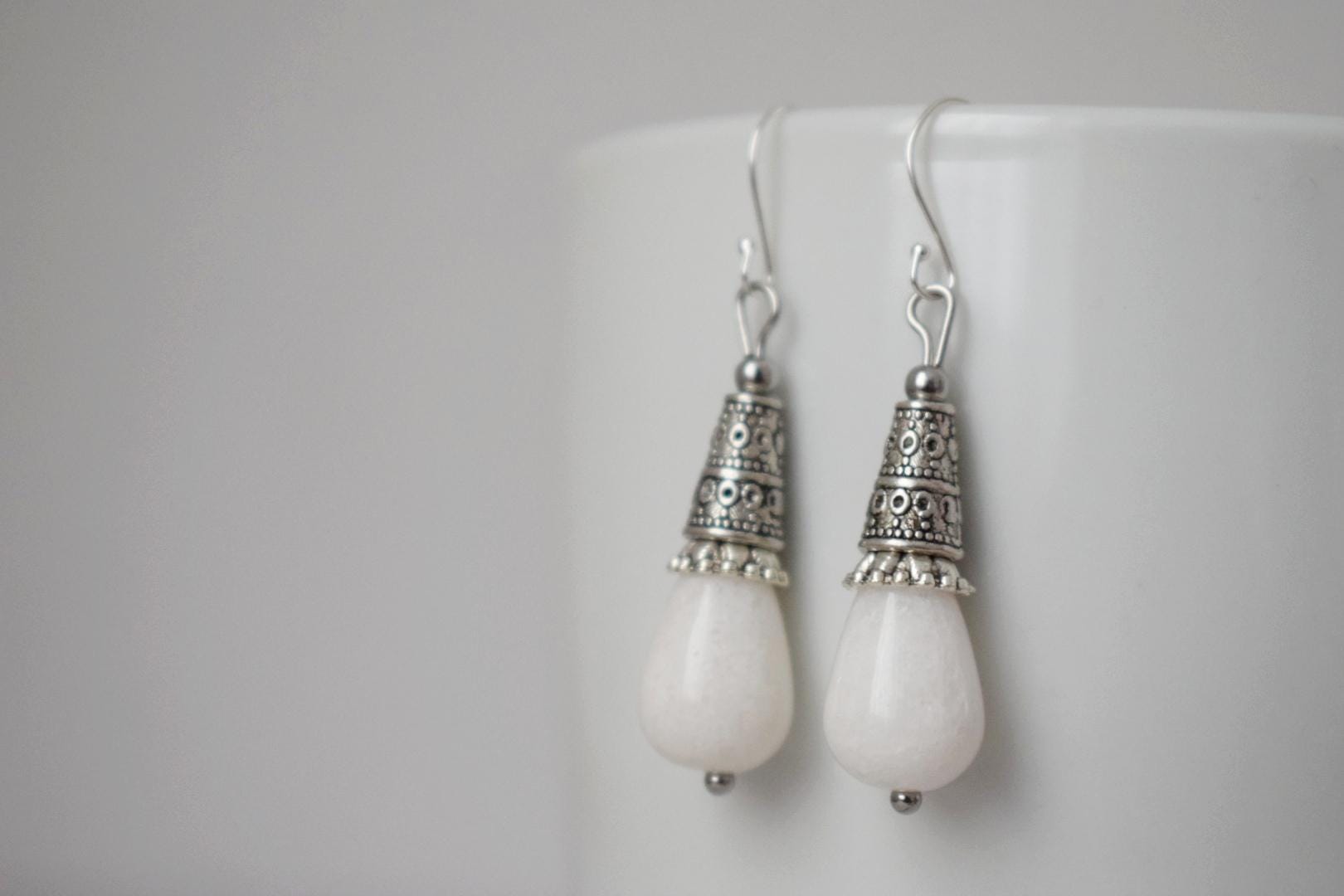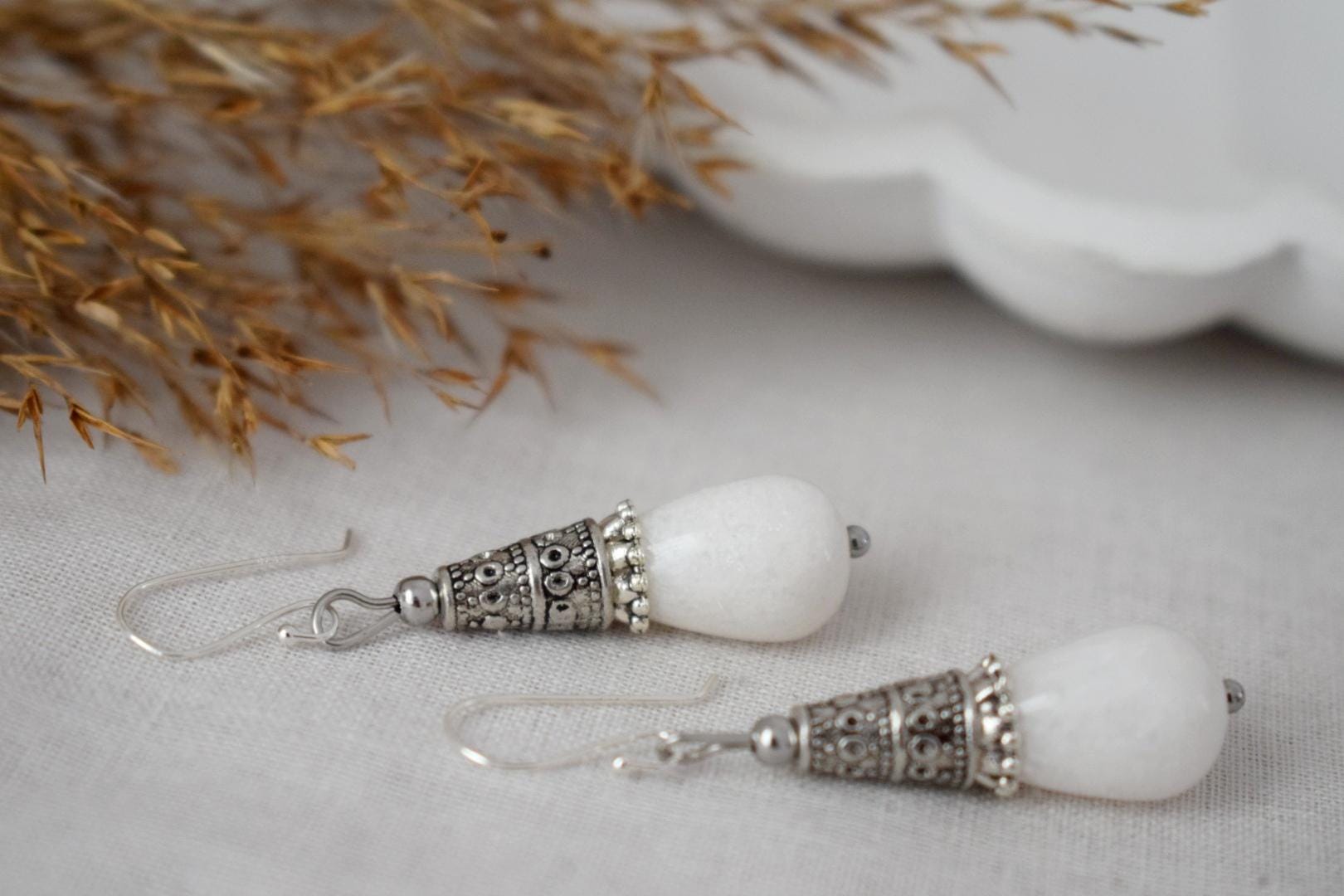 Weiße Jade Tropfen Ohrringe Geschenk für Frauen, Vintage, Sterling Silber Ohrhänger, Boho Chic Ohrringe, Edelstein Handgemachter Schmuck