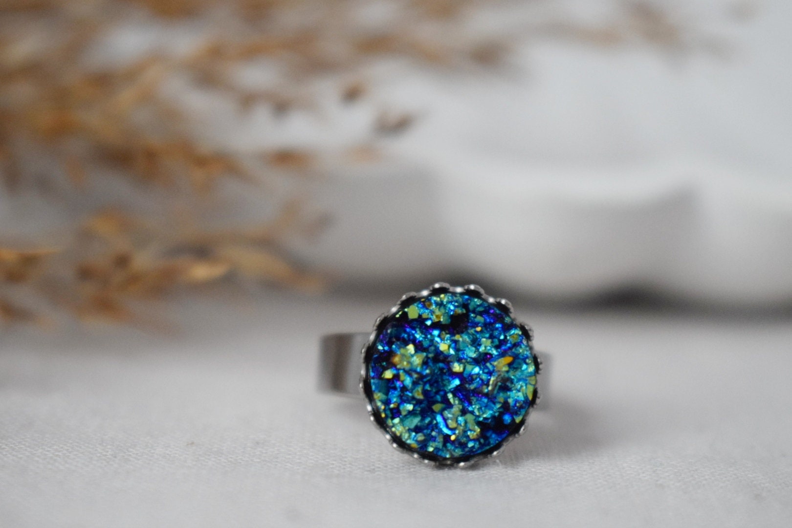 Kronenring mit blauem Druzy-Cabochon, Rosa, Silber, verstellbarer Statement-Ring, Alltäglicher runder Ring, Druzy-Schmuck, Geburtstagsgeschenk für Sie