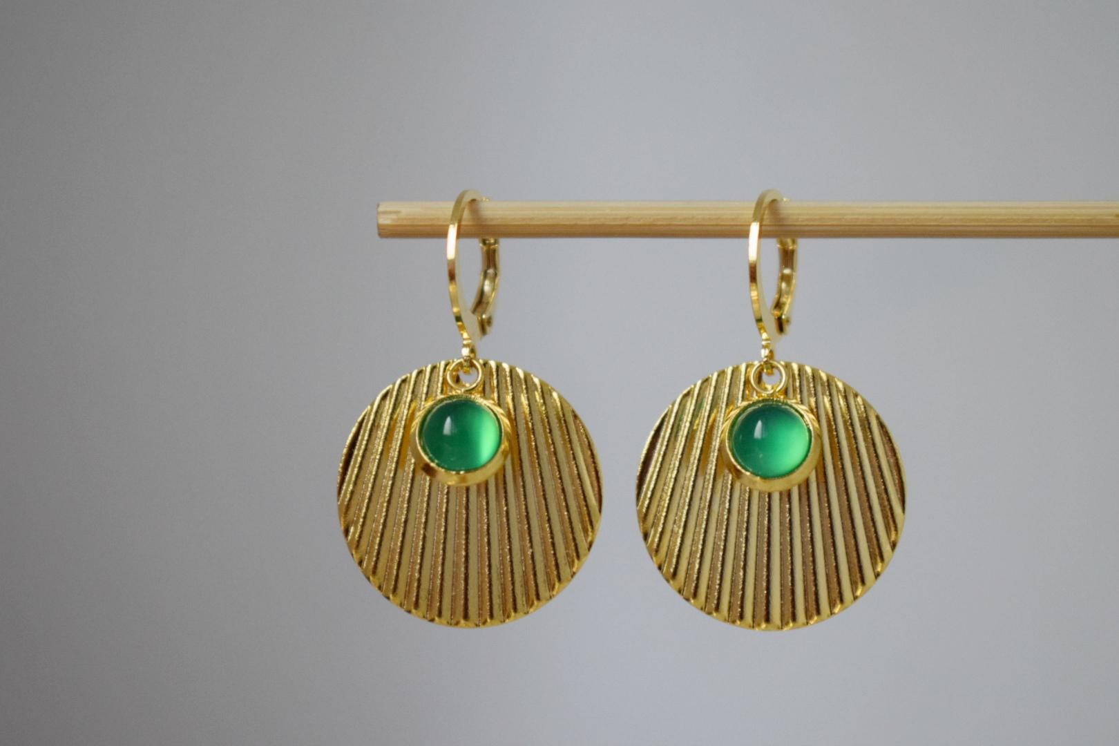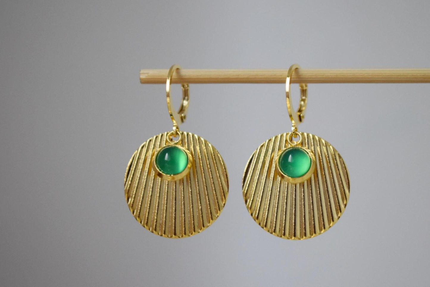 Handgemachte gewellte grüne Achatscheibe goldfarbene Huggie-Ohren