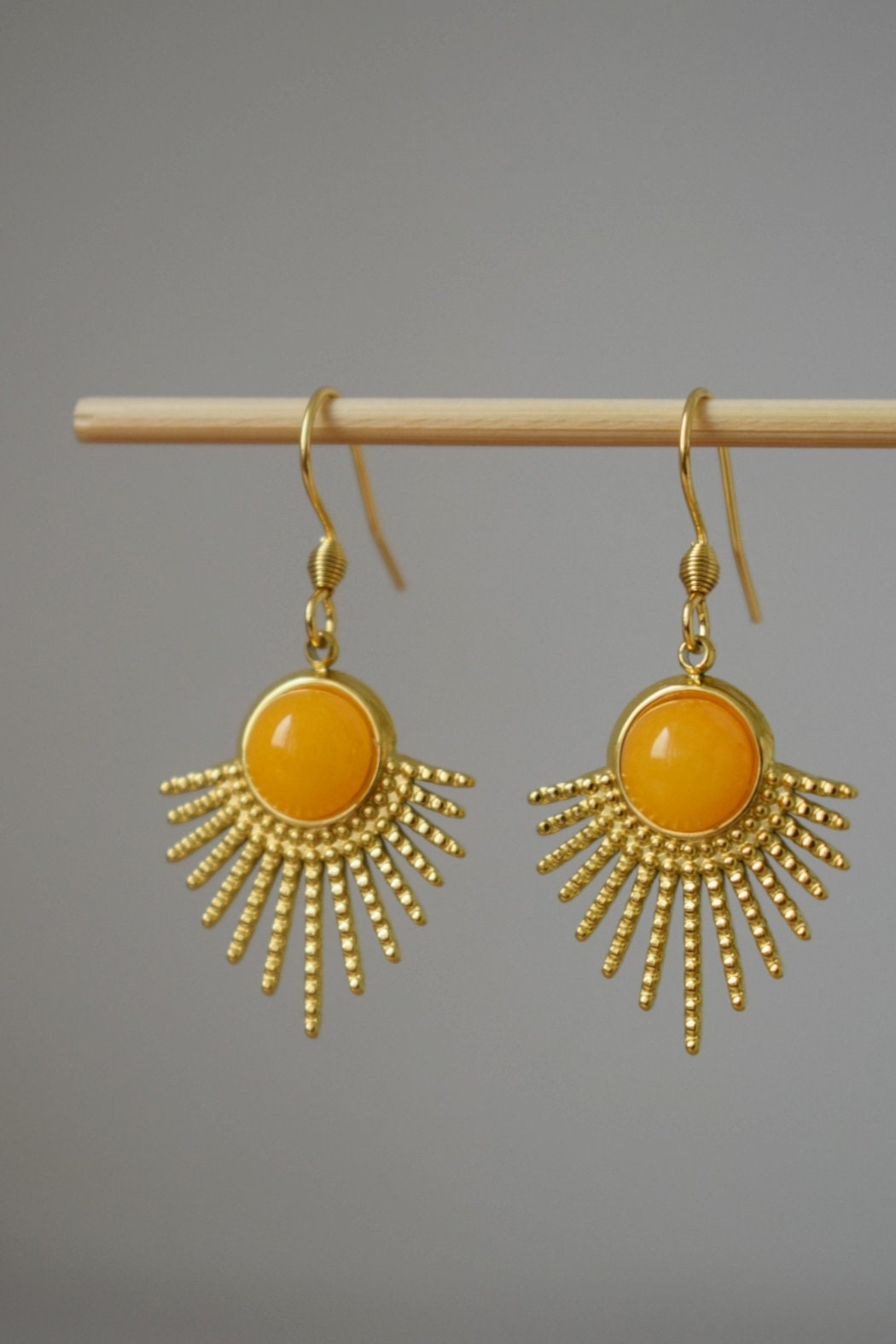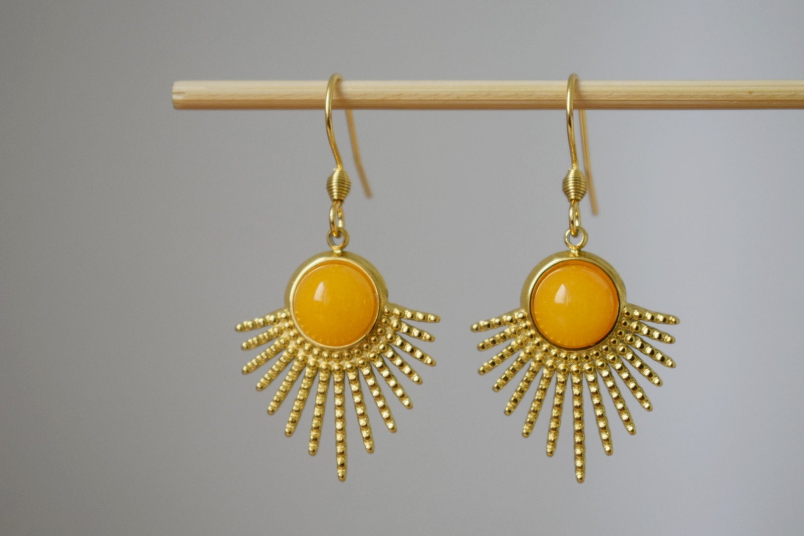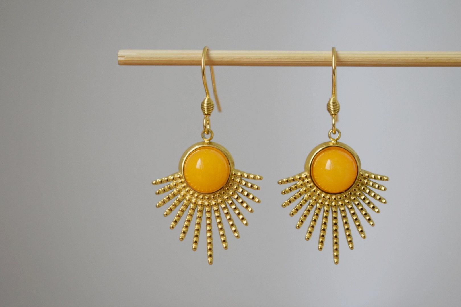 Gelbe Jade-Ohrringe, Sonnenstrahlen-Ohrhänger, Sunburst, Edelstein-Ohrhänger, Celestial, 18 Karat vergoldeter Edelstahl, Schmuckgeschenk